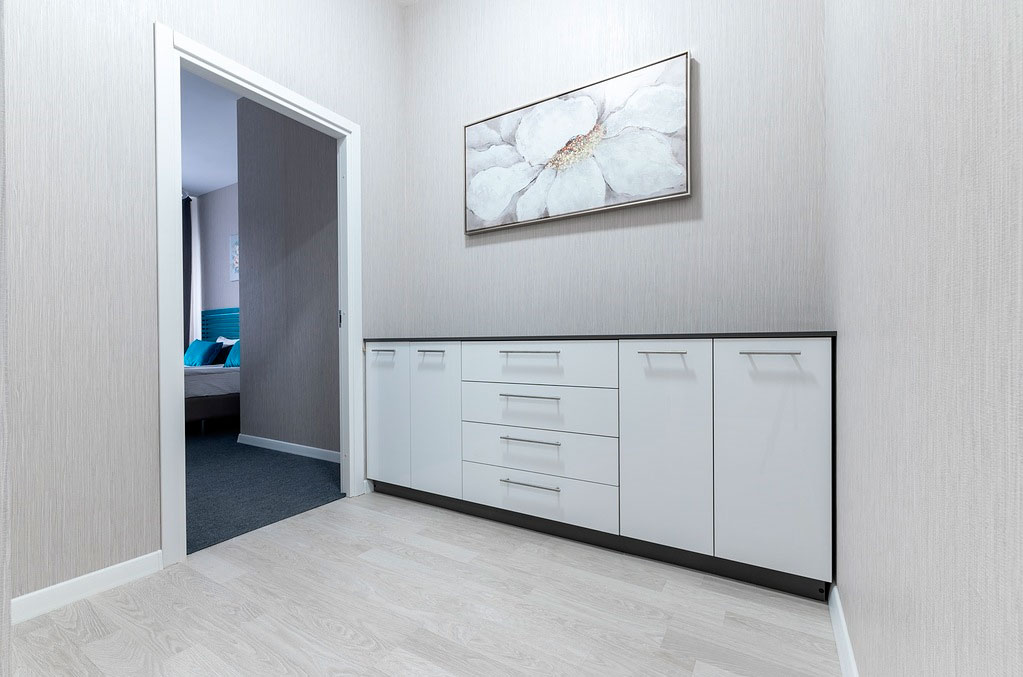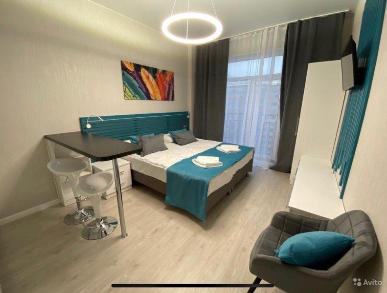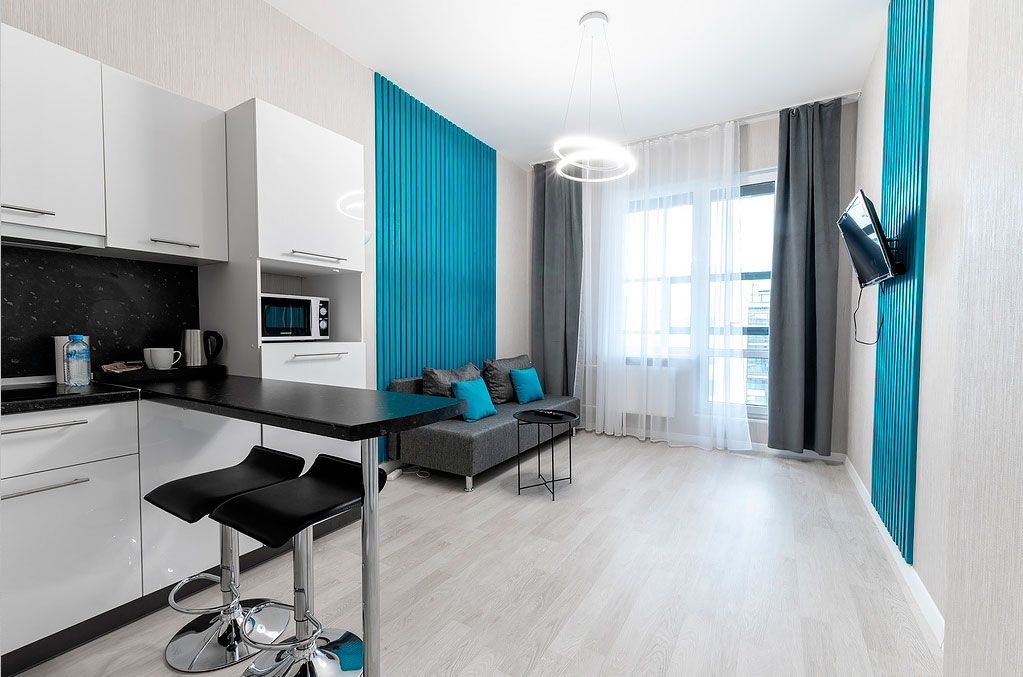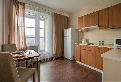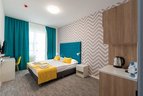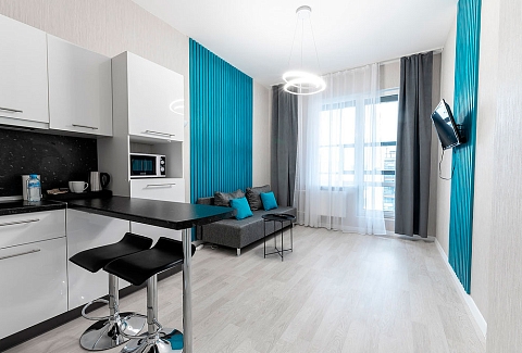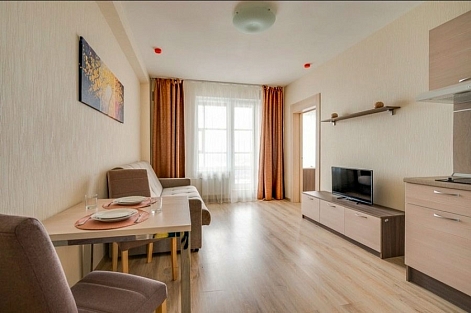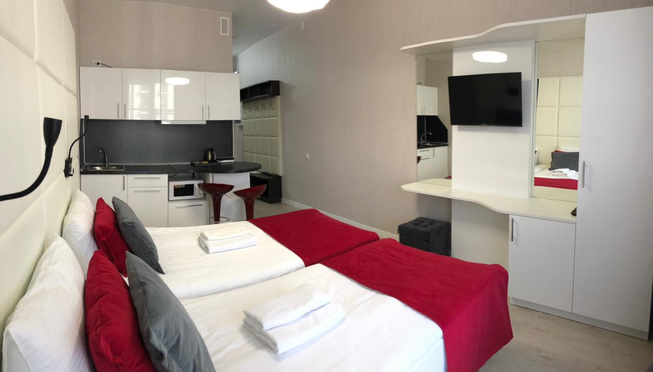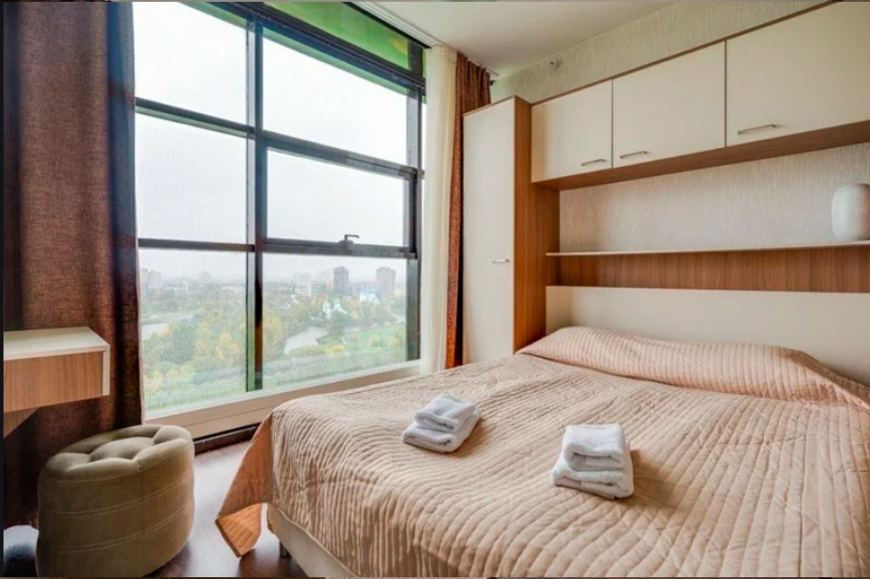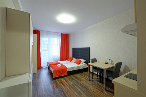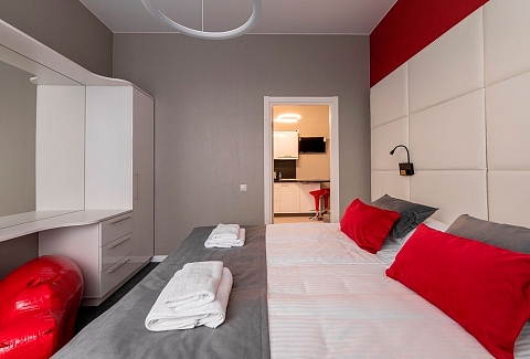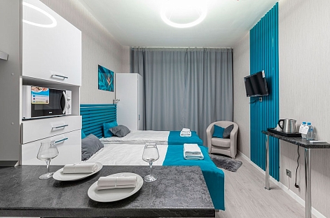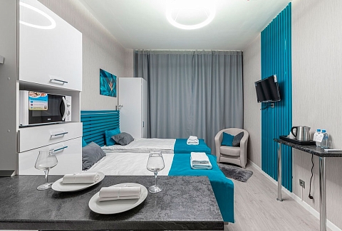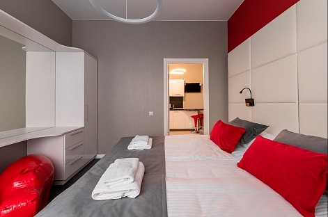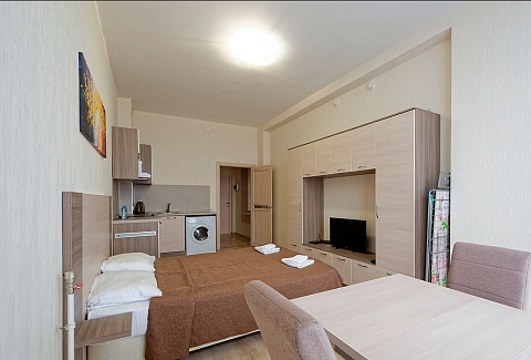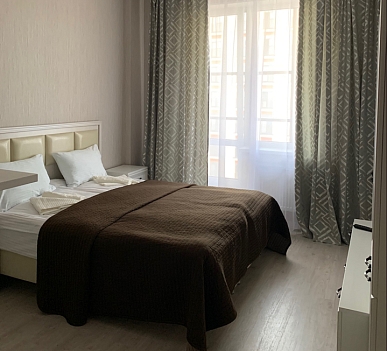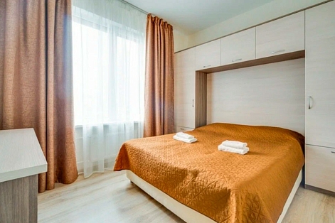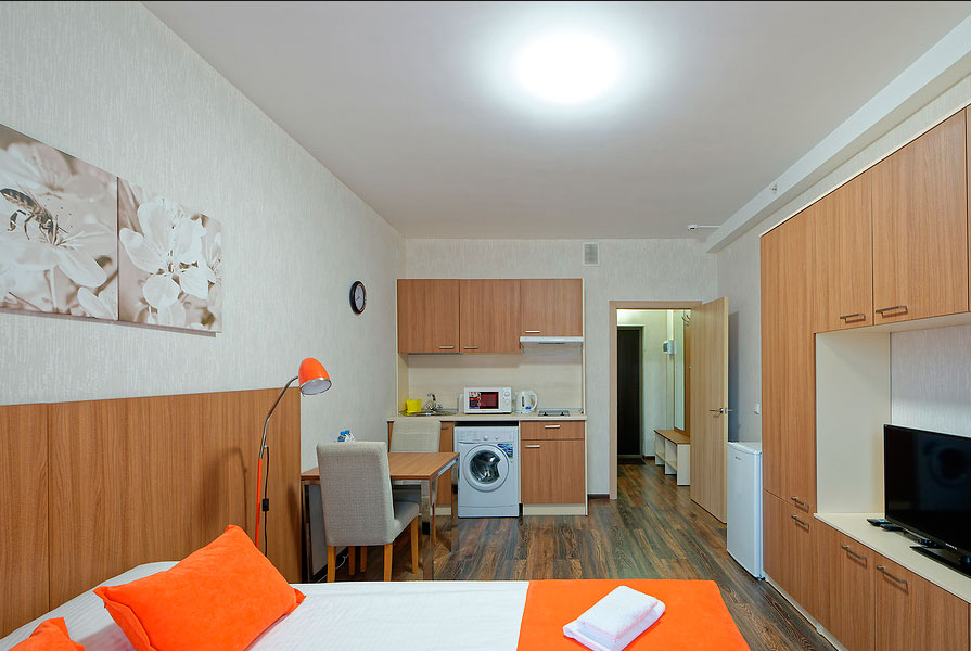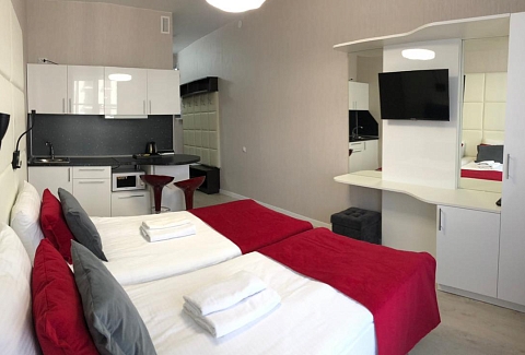 В номере: вешалка, диван, зеркало, кровать двуспальная, прикроватные тумбочки, стол, стулья, шкаф, гладильная доска, микроволновая печь, набор посуды, плита электрическая, стиральная машина, телевизор, утюг, холодильник, электрочайник