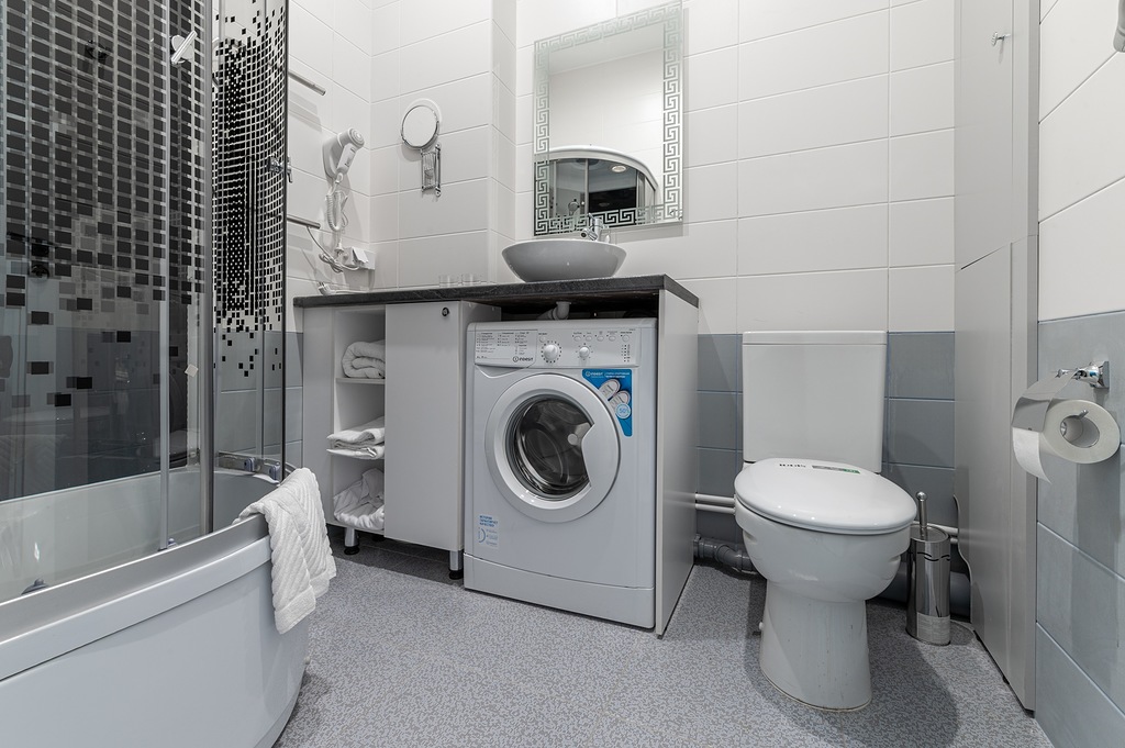 В номере: вешалка, зеркало, кровать двуспальная, прикроватные тумбочки, стол, стулья, шкаф, гладильная доска, микроволновая печь, набор посуды, плита электрическая, стиральная машина, телевизор, утюг, холодильник, электрочайник