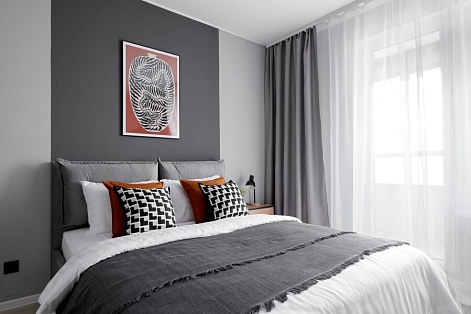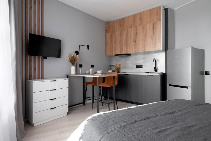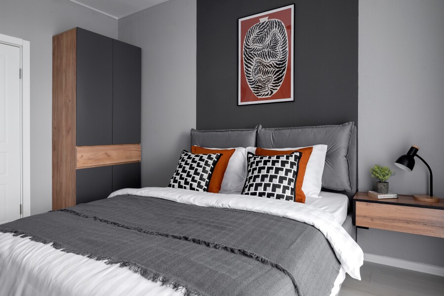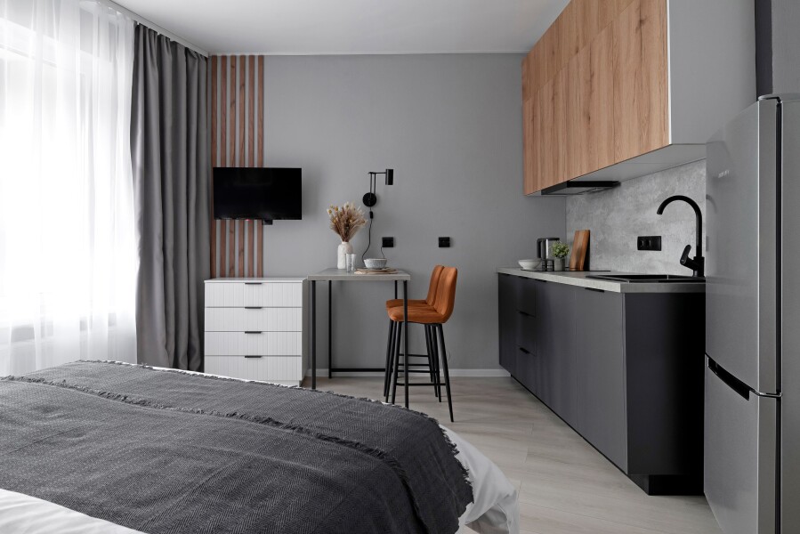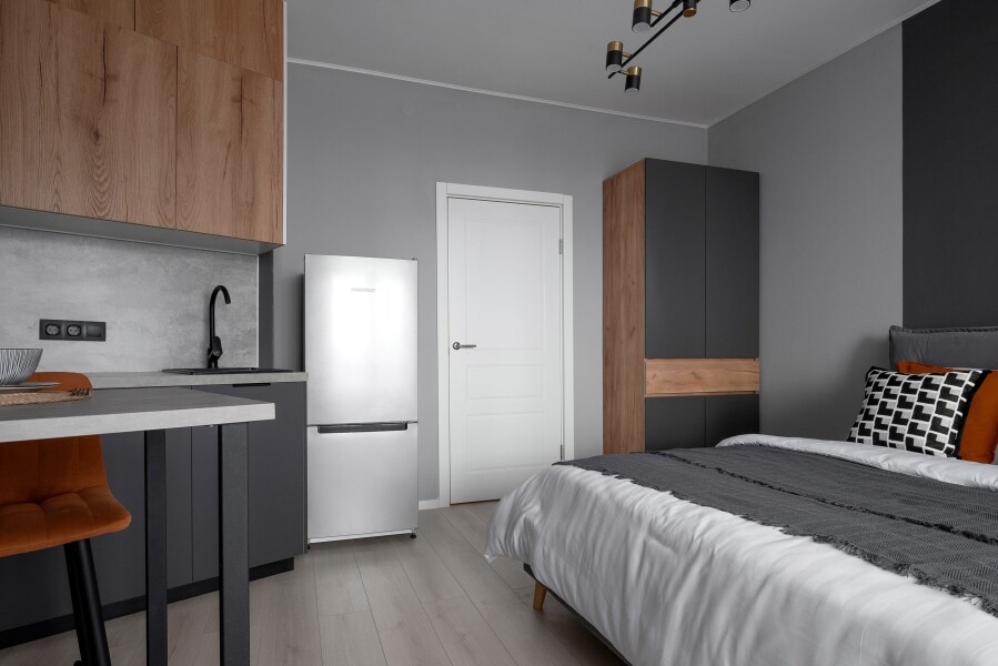 В номере: вешалка, зеркало, комод, кровать двуспальная, прикроватные тумбочки, стол, стулья, шкаф, гладильная доска, микроволновая печь, набор посуды, плита электрическая, посудомоечная машина, стиральная машина, телевизор, теплый пол, утюг, холодильник, электрочайник