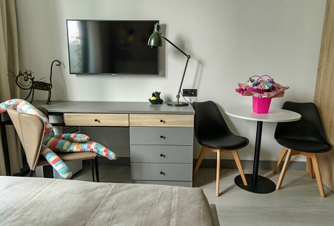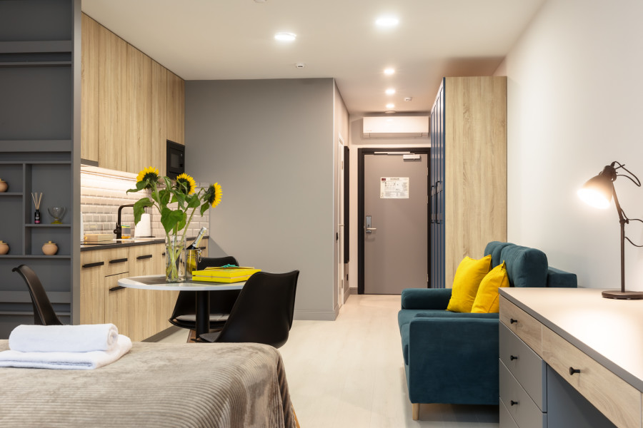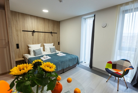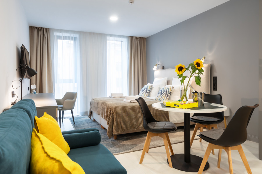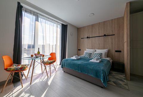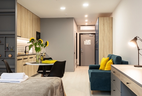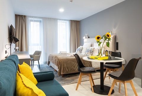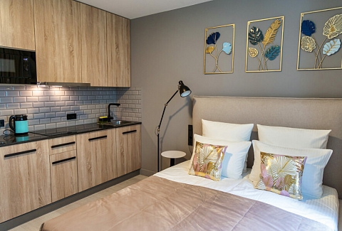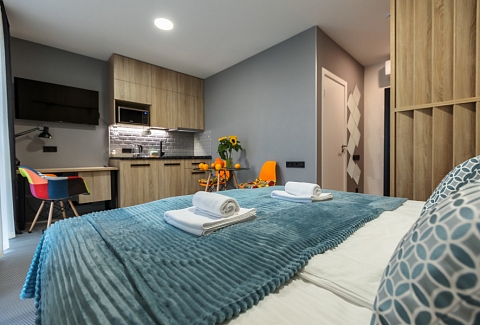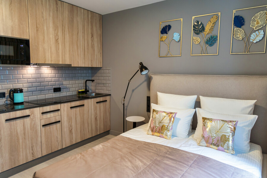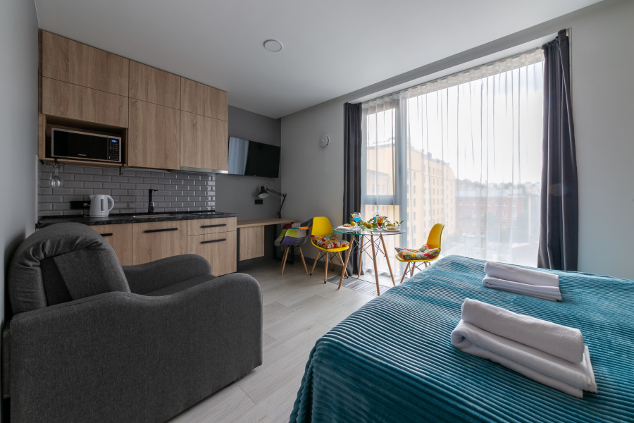В каждом номере обустроен личный санузел с душевой кабиной и компактная кухонная зона, укомплектованная холодильником, индукционной варочной панелью и микроволновой печью. В улучшенных категориях дополнительно установлены посудомоечные машины. Предусмотрено также наличие гладильной доски, утюга и стиральной машинки.Все апартаменты оснащены современной техникой и мебелью, включая рабочие столы, телевизоры с диагональю 43 дюйма и системы хранения вещей. На всей территории предоставляется беспроводной интернет Wi-Fi. Окна апартаментов выходят во внутренние дворы, что обеспечивает тихую среду для проживания. В каждом апартаменте предоставляется полный комплект постельного белья, полотенец и базовых кухонных принадлежностей. По запросу доступна детская кроватка.