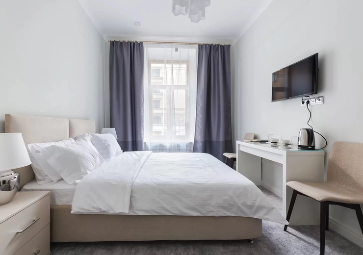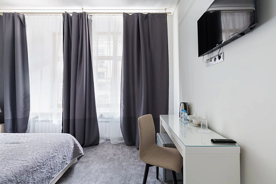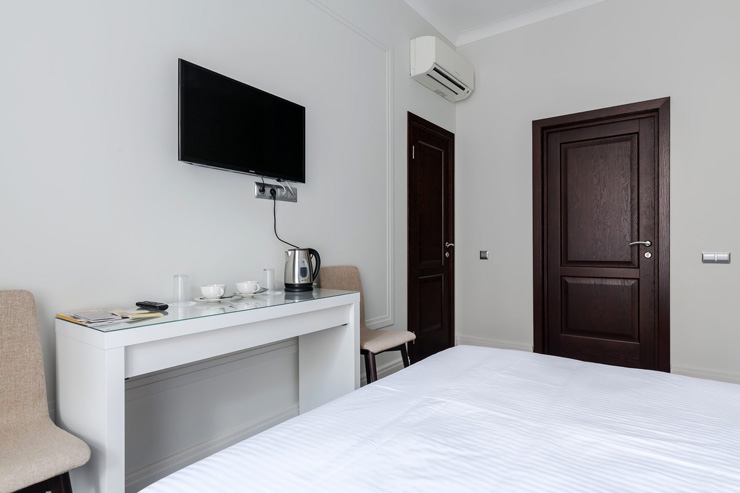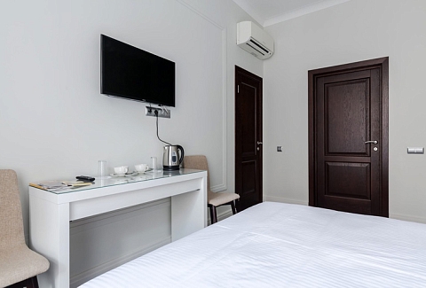 В номере: вешалка, зеркало, кровать двуспальная, прикроватные тумбочки, стол, стул, шкаф, кондиционер, мини-холодильник, телевизор, чайный набор посуды, электрочайник