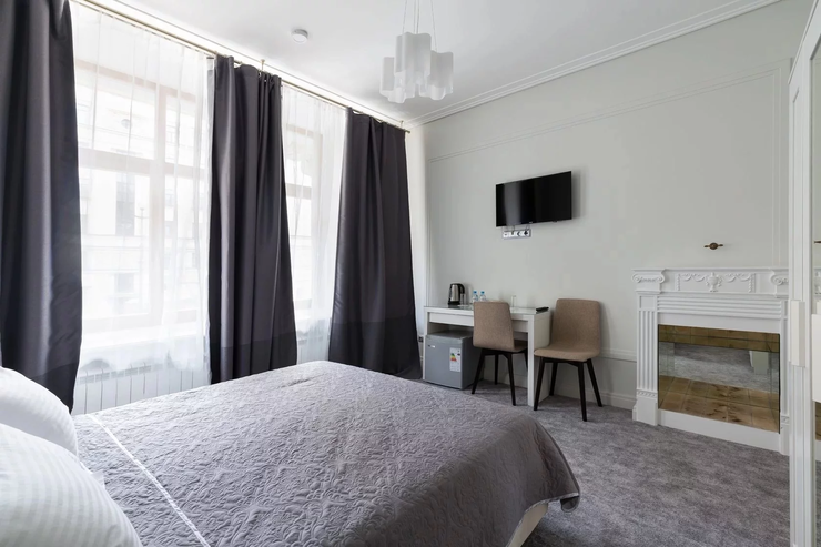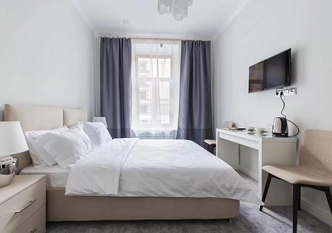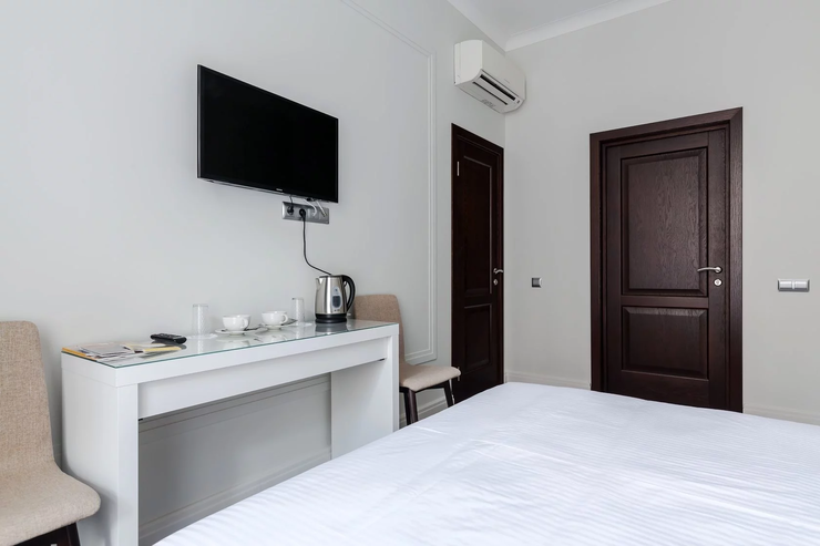 В номере: вешалка, зеркало, кровать двуспальная, прикроватные тумбочки, стол, стулья, шкаф, кондиционер, мини-холодильник, телевизор, чайный набор посуды, электрочайник