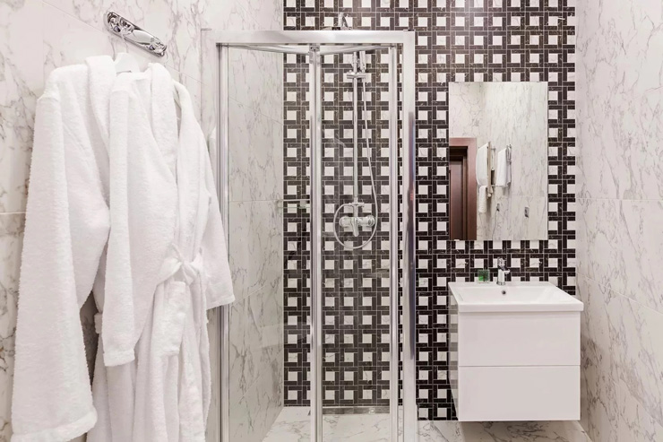 Санузел: с душем, тапочки, туалетные принадлежности, фен