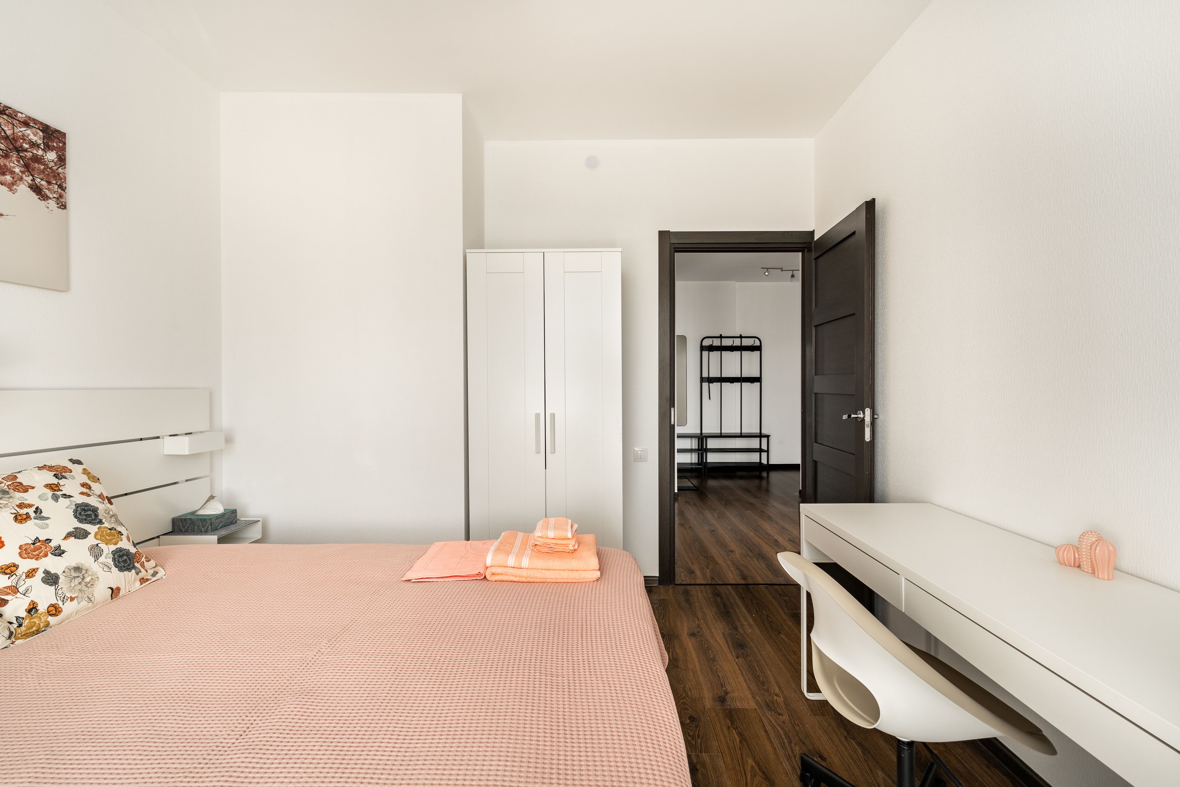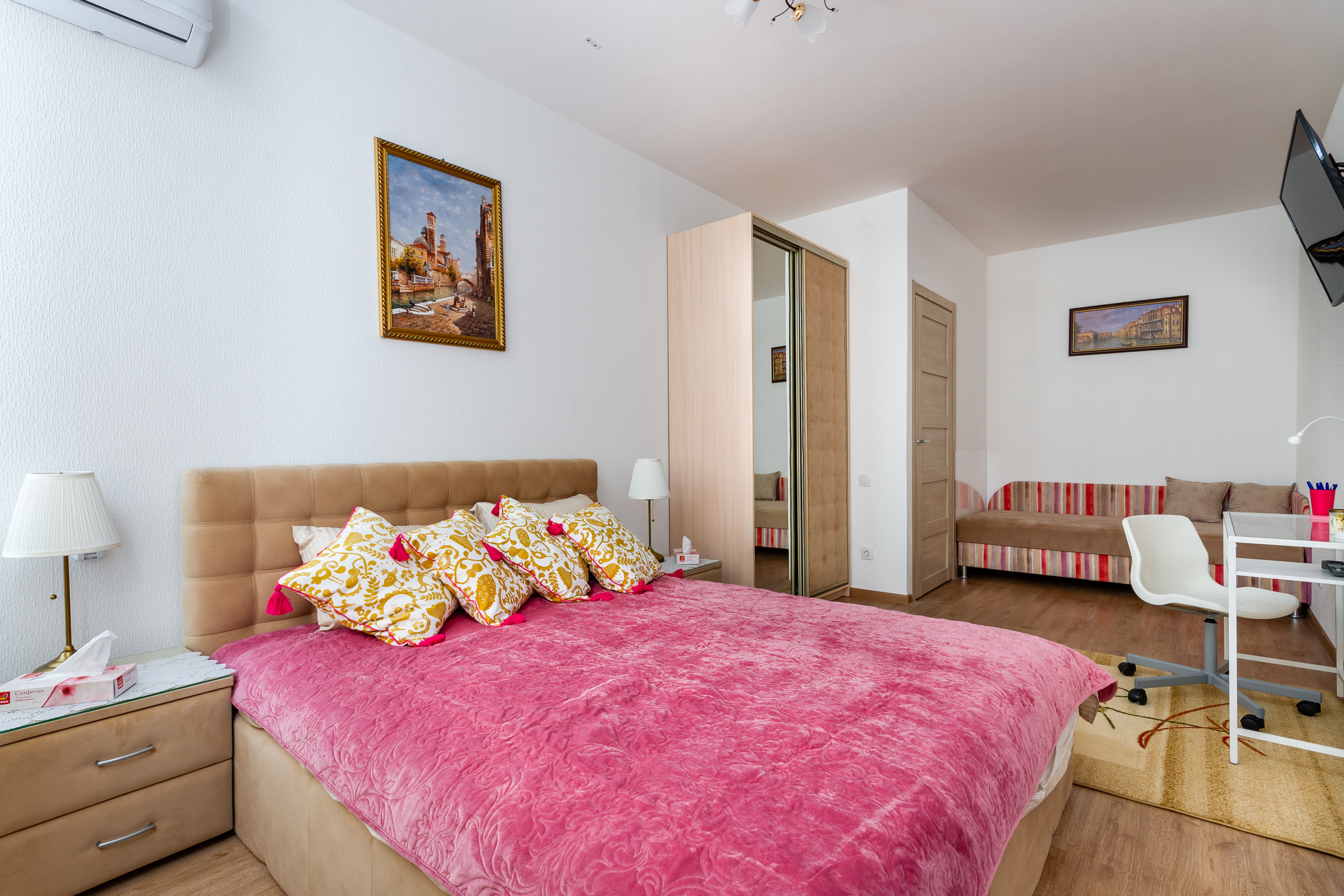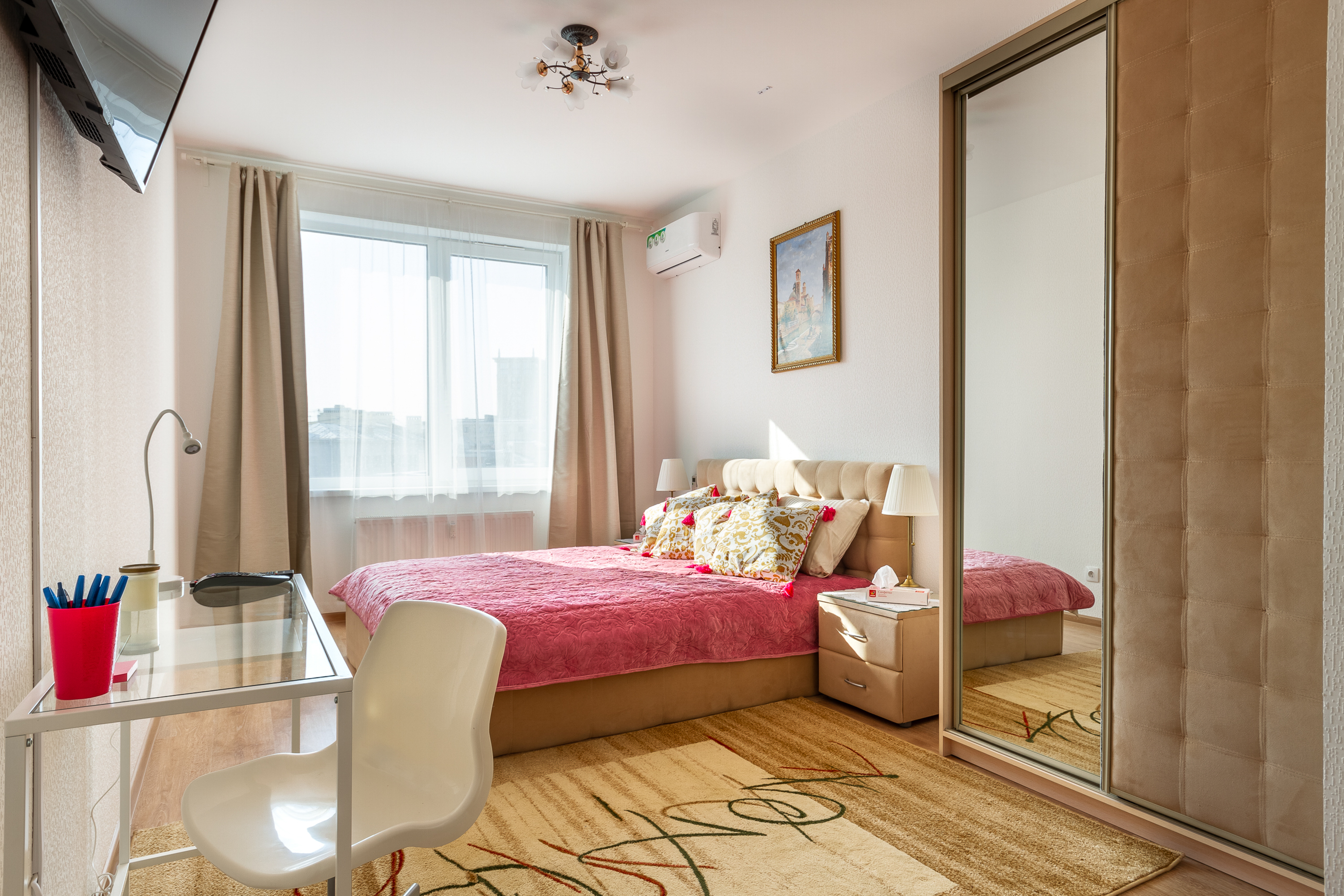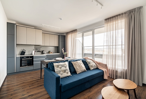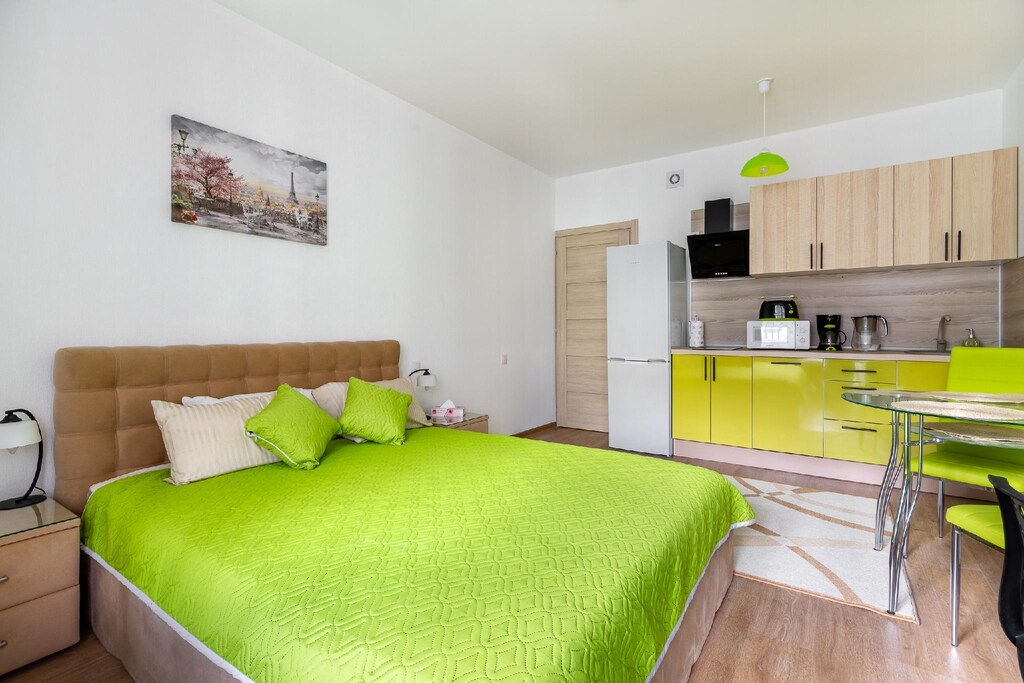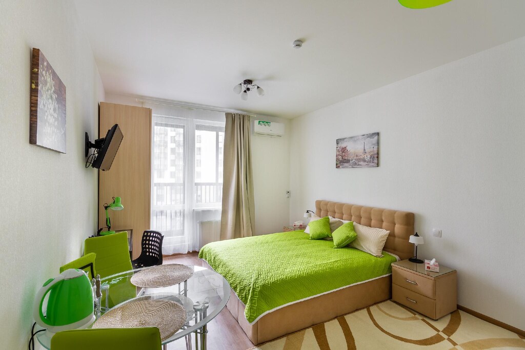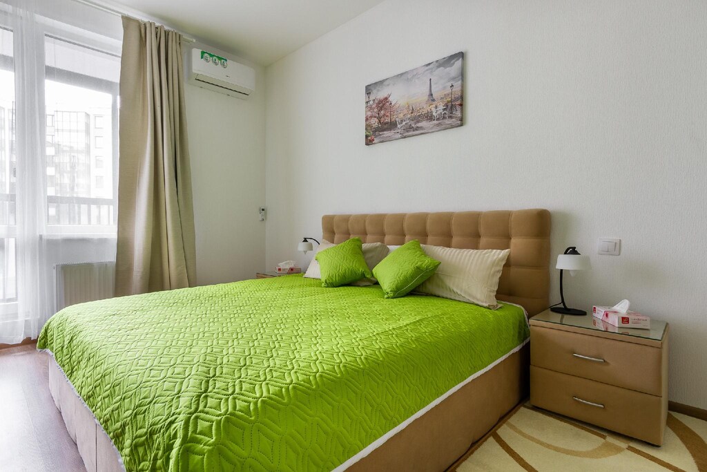 В номере: диван раскладной, кровать двуспальная, кондиционер, кофемашина, микроволновая печь, набор посуды, плита электрическая, посудомоечная машина, стиральная машина, телевизор, утюг, холодильник, электрочайник
