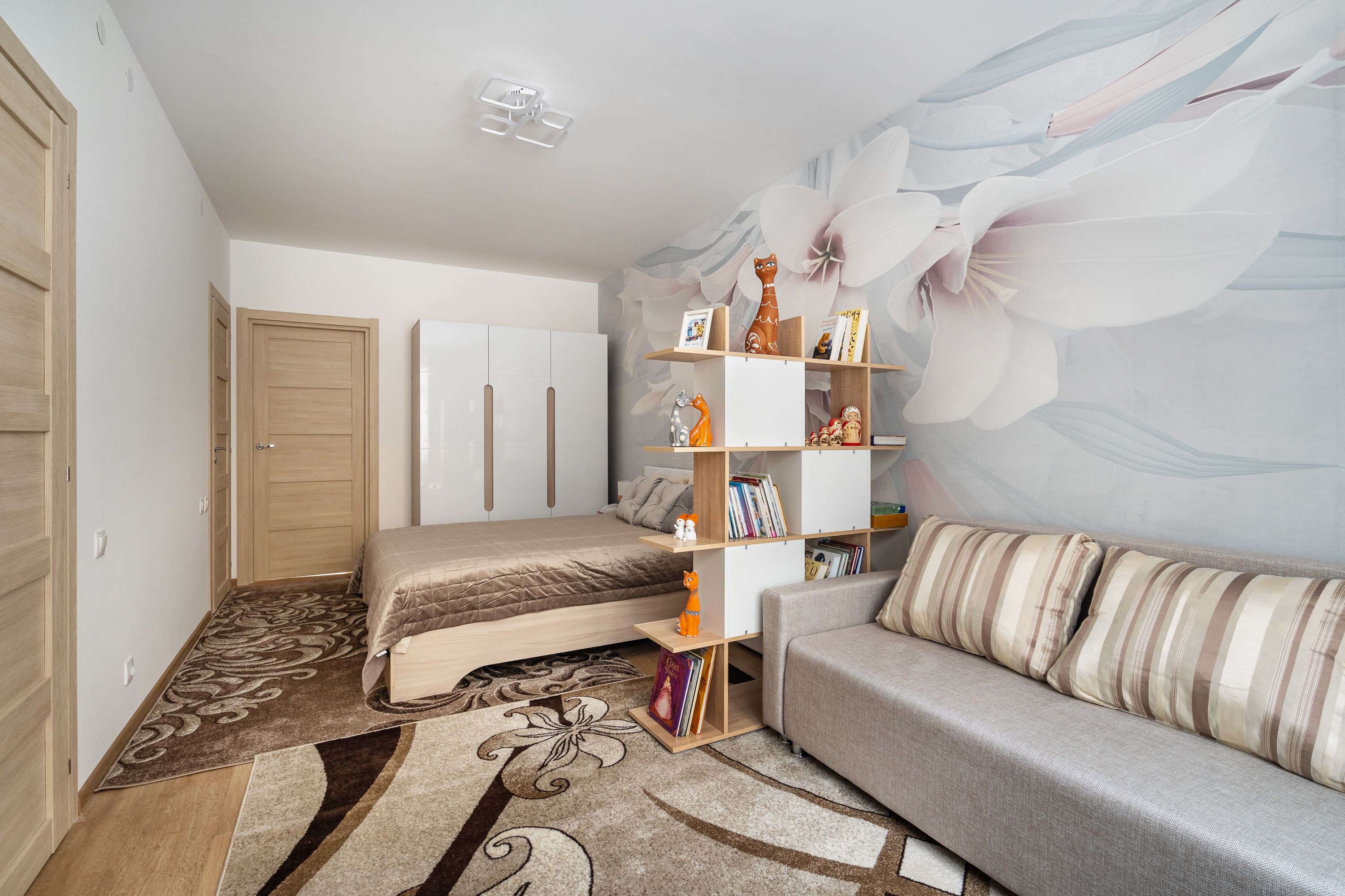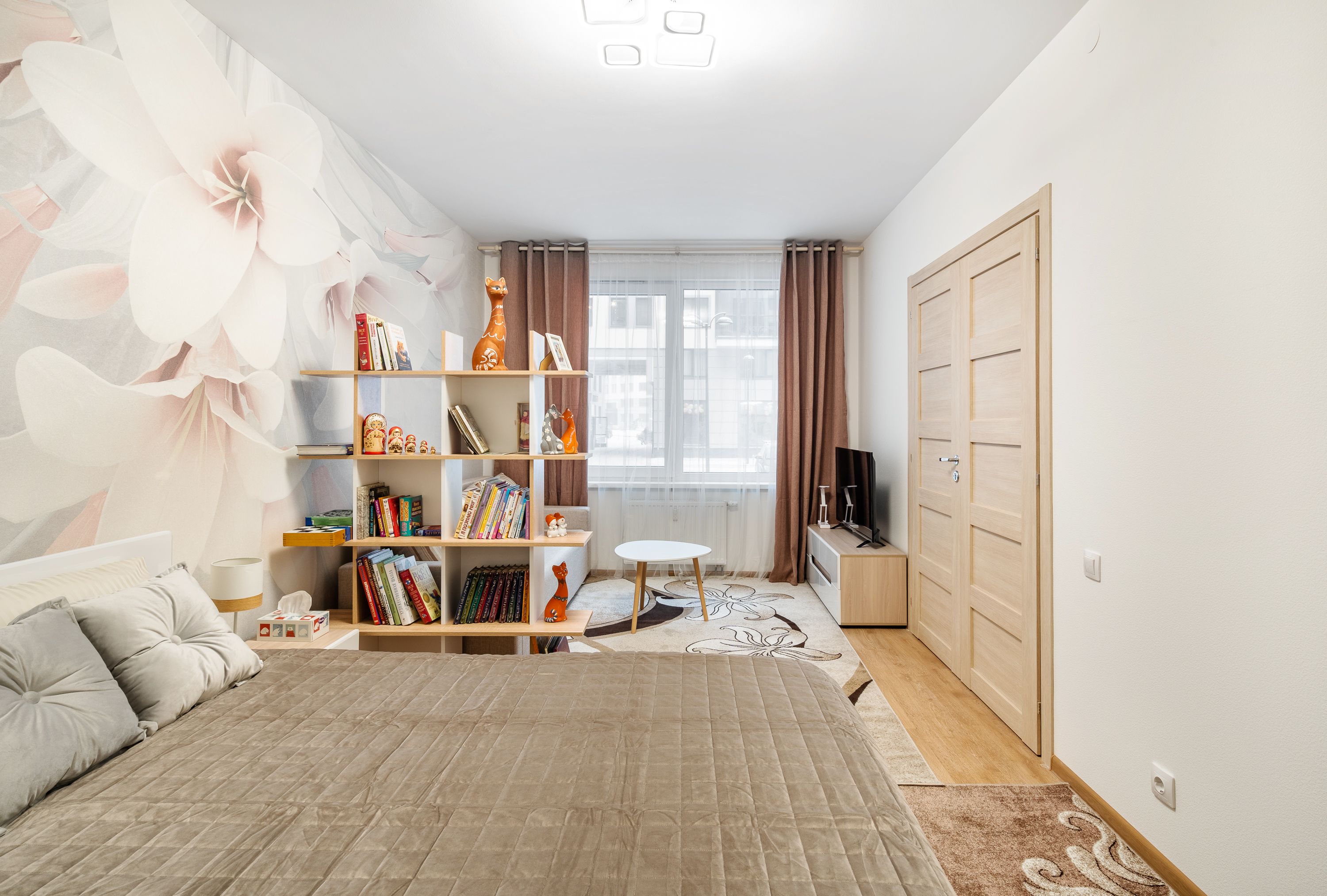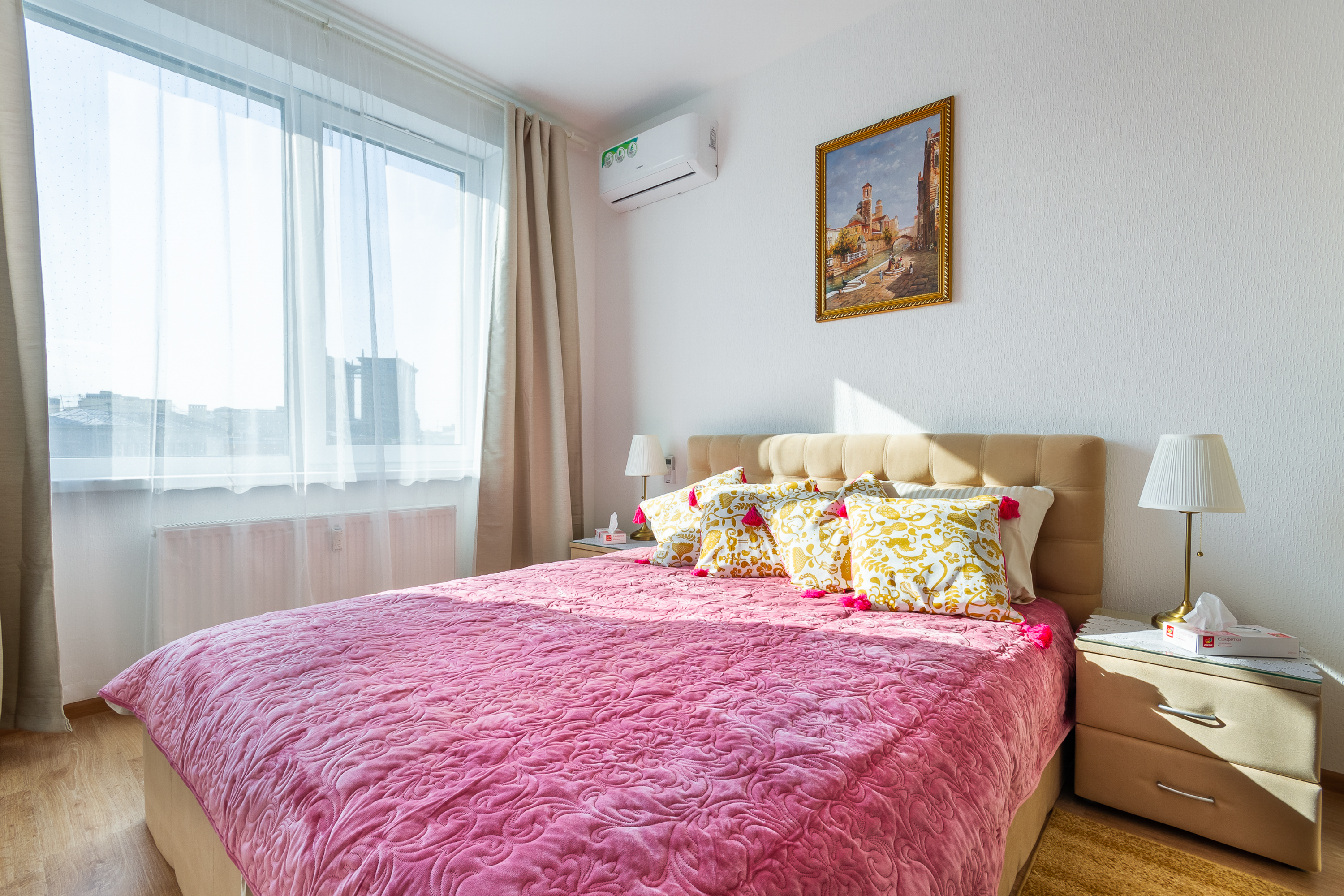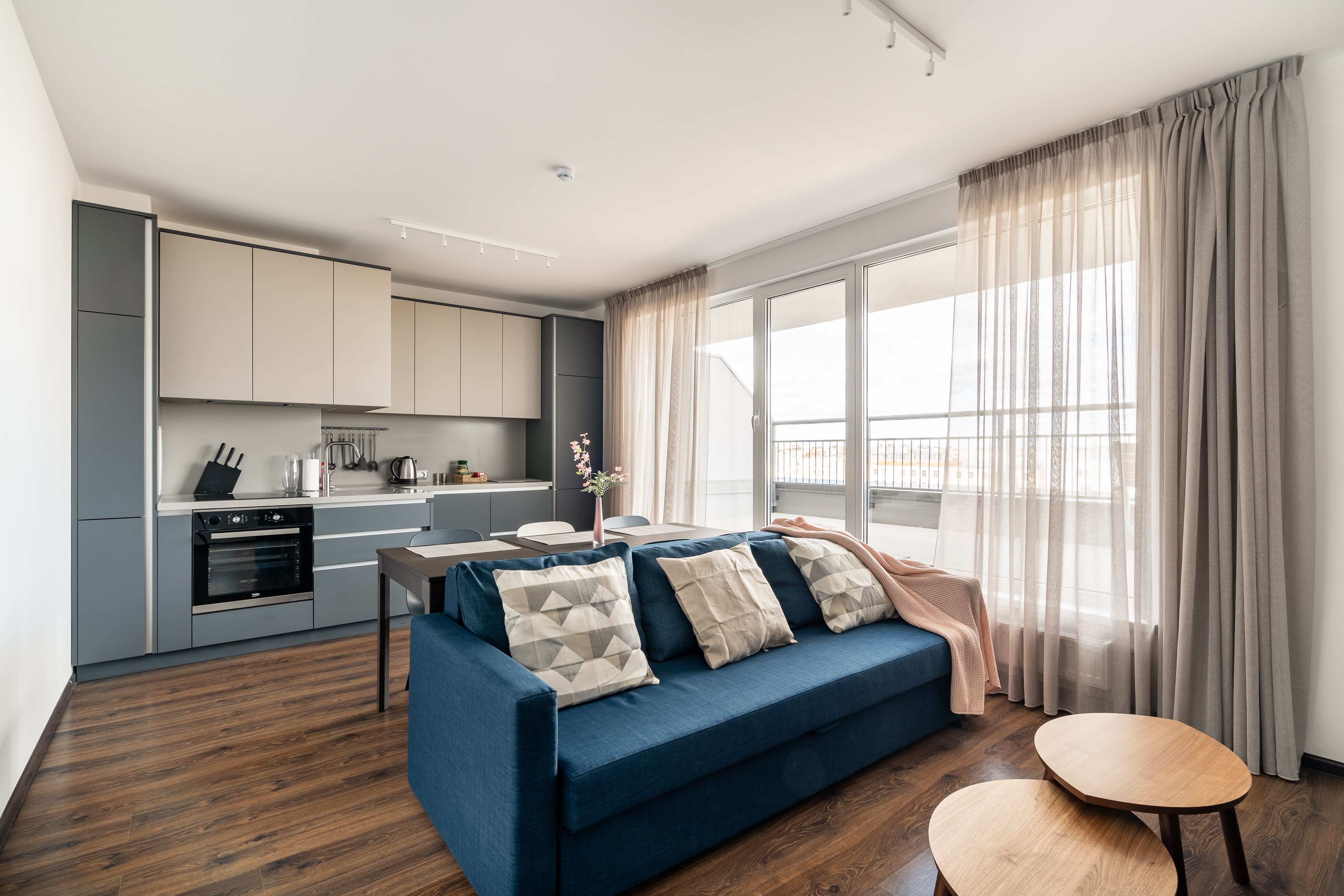 В номере: диван раскладной, кровать двуспальная, кондиционер, кофемашина, микроволновая печь, набор посуды, плита электрическая, посудомоечная машина, стиральная машина, телевизор, утюг, холодильник, электрочайник