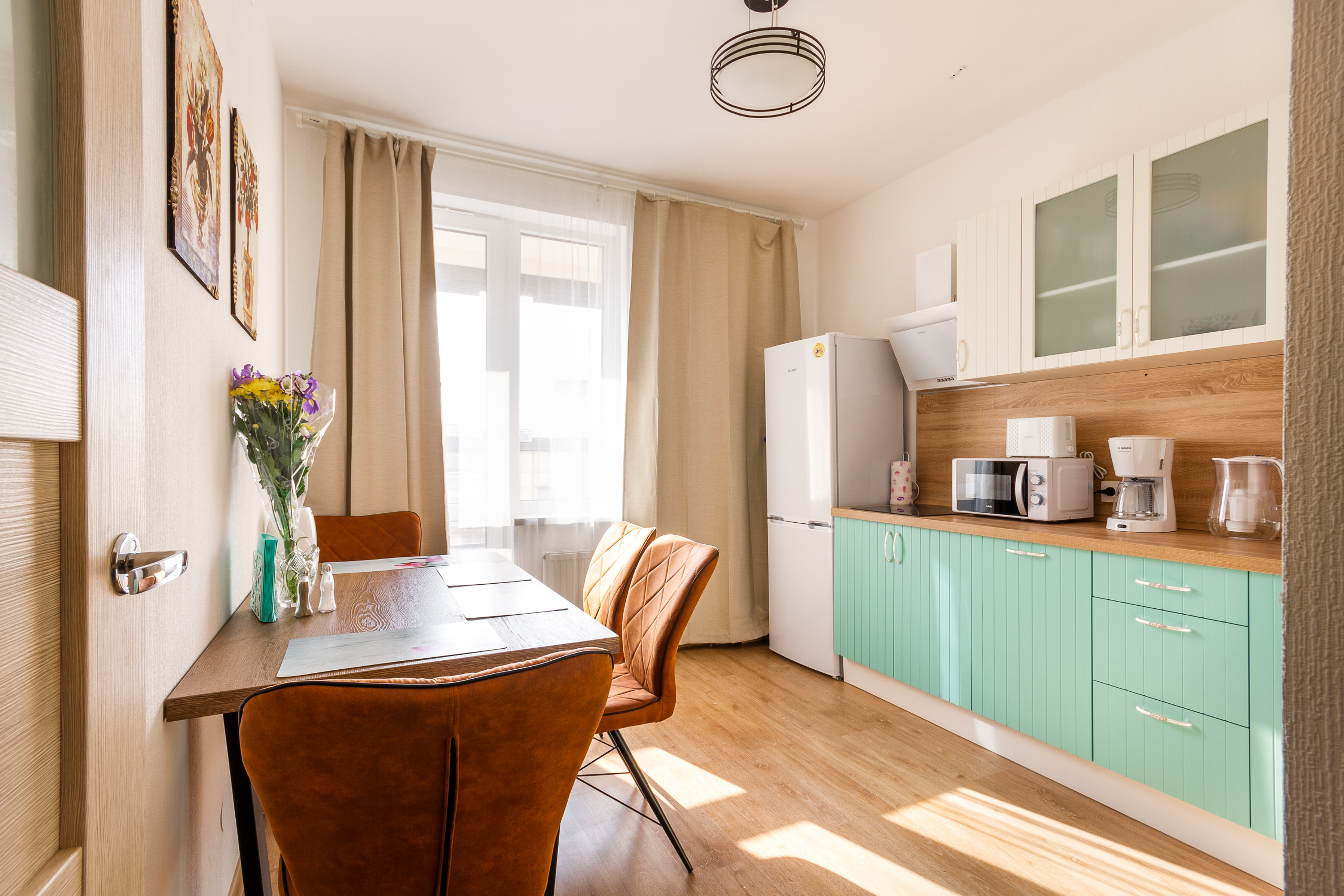 В номере: диван раскладной, кровать двуспальная, кровать двухъярусная, кофемашина, микроволновая печь, набор посуды, плита электрическая, посудомоечная машина, стиральная машина, телевизор, утюг, холодильник, электрочайник