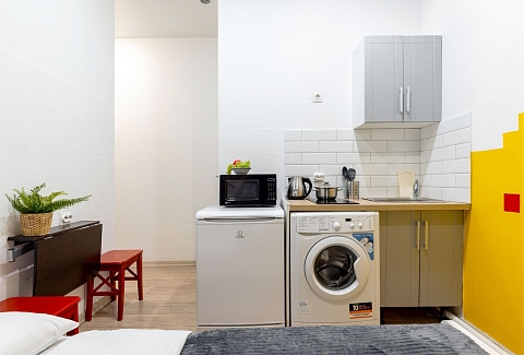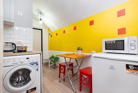В номере: вешалка, зеркало, кровать двуспальная, стол, тумба, мини-холодильник, набор посуды, плита электрическая, стиральная машина, сушилка для белья, телевизор ЖК, чайный набор посуды, электрочайник