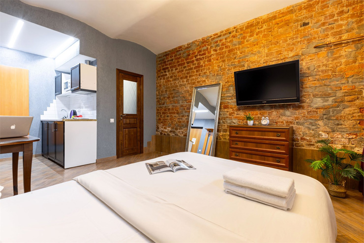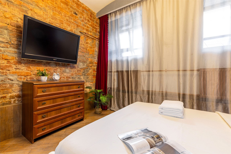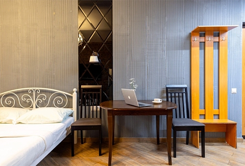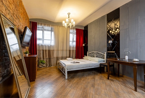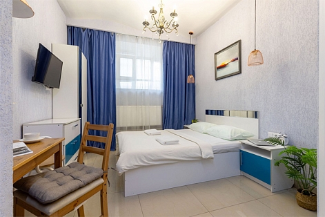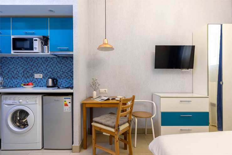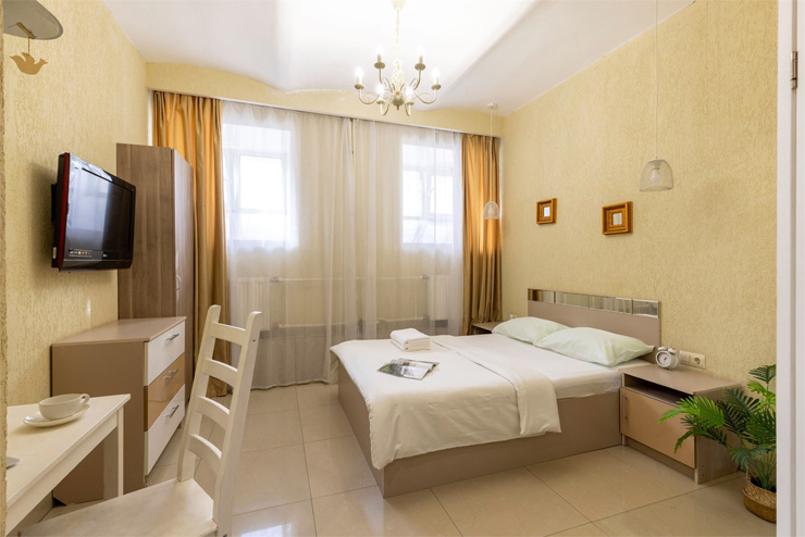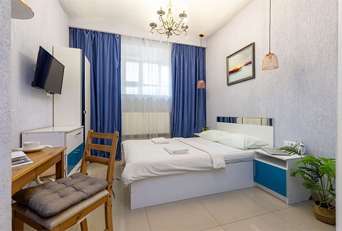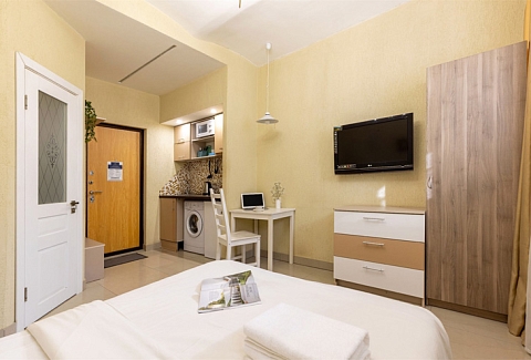В номере: вешалка, зеркало, кровать двуспальная, прикроватные тумбочки, стол, стул, шкаф, микроволновая печь, мини-холодильник, набор посуды, плита электрическая, стиральная машина, телевизор, электрочайник