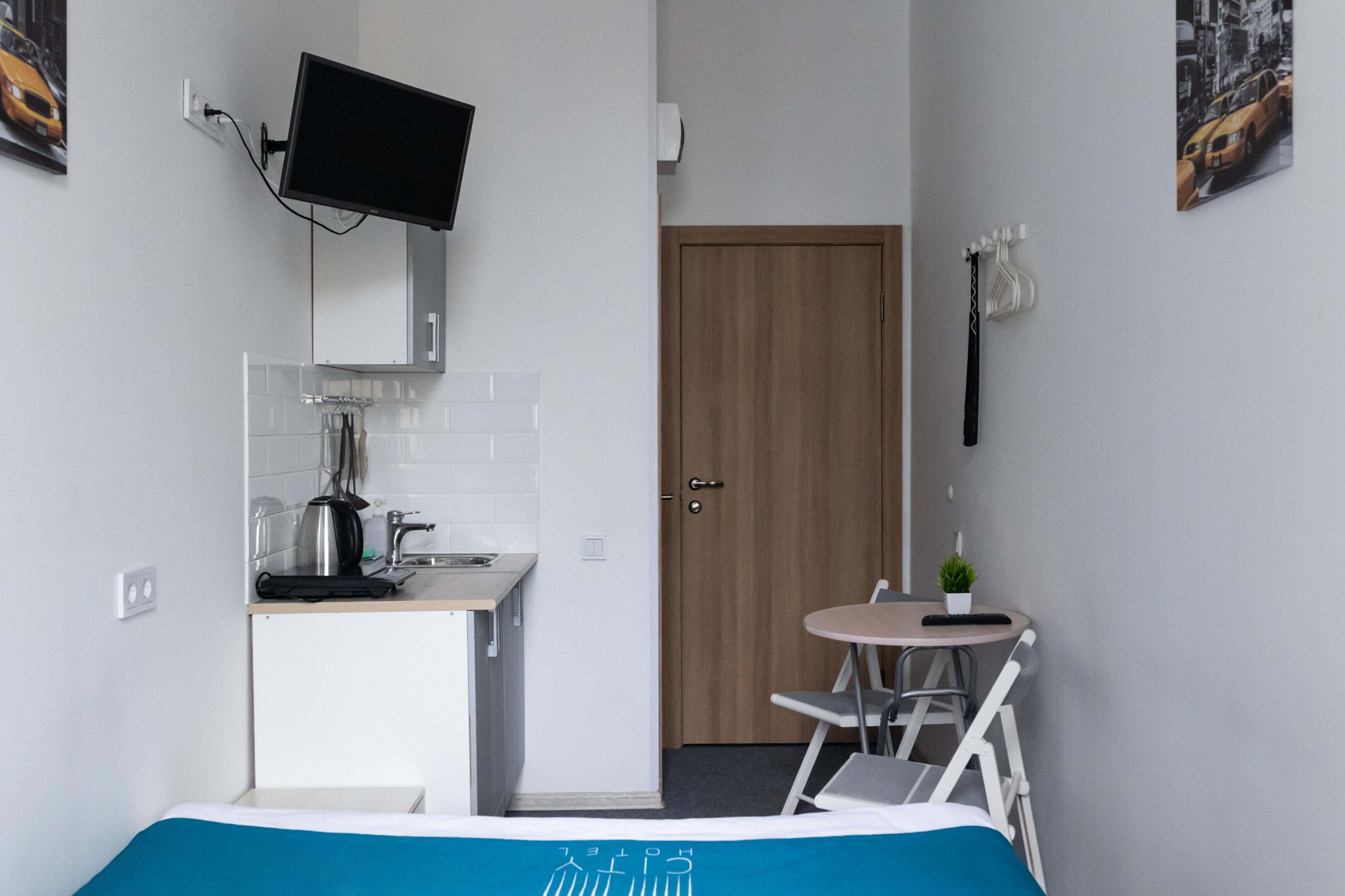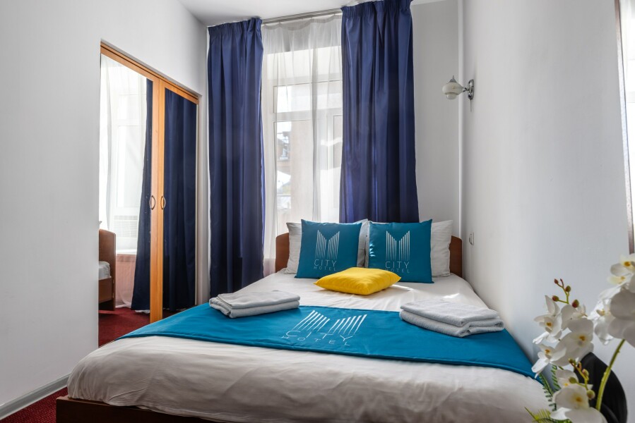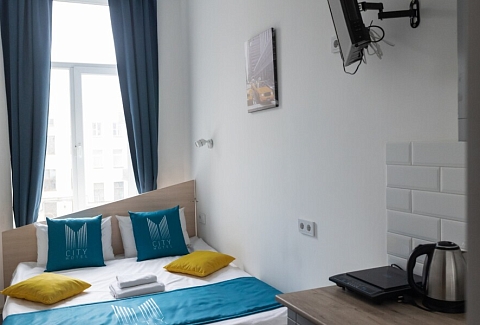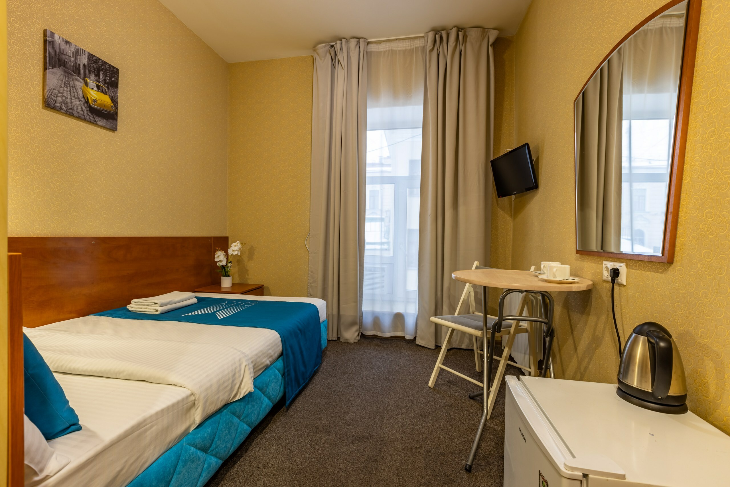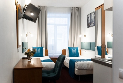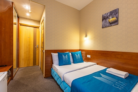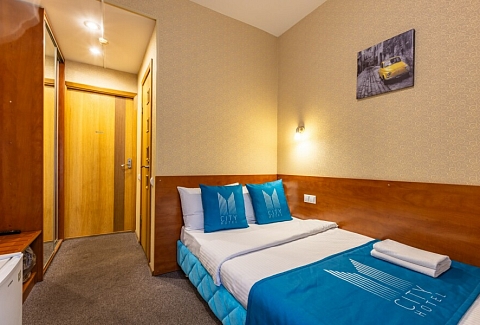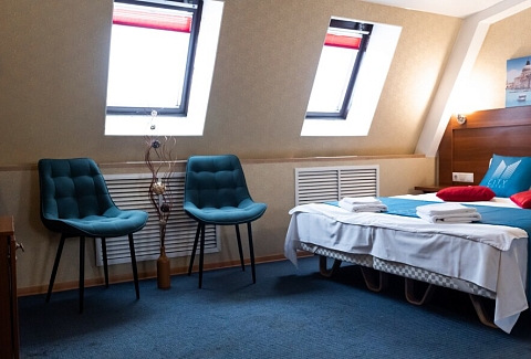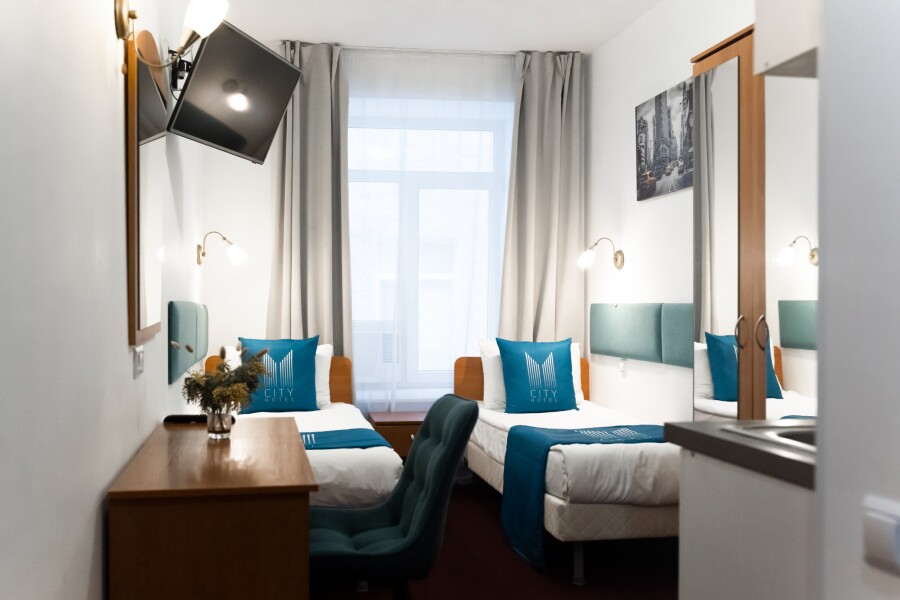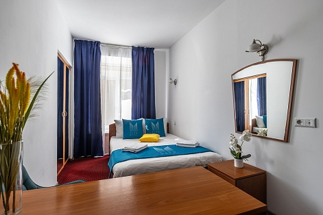 В номере: вешалка, зеркало, кровать односпальная, стол, стул, шкаф, мини-холодильник, сейф, телевизор, чайный набор посуды, электрочайник