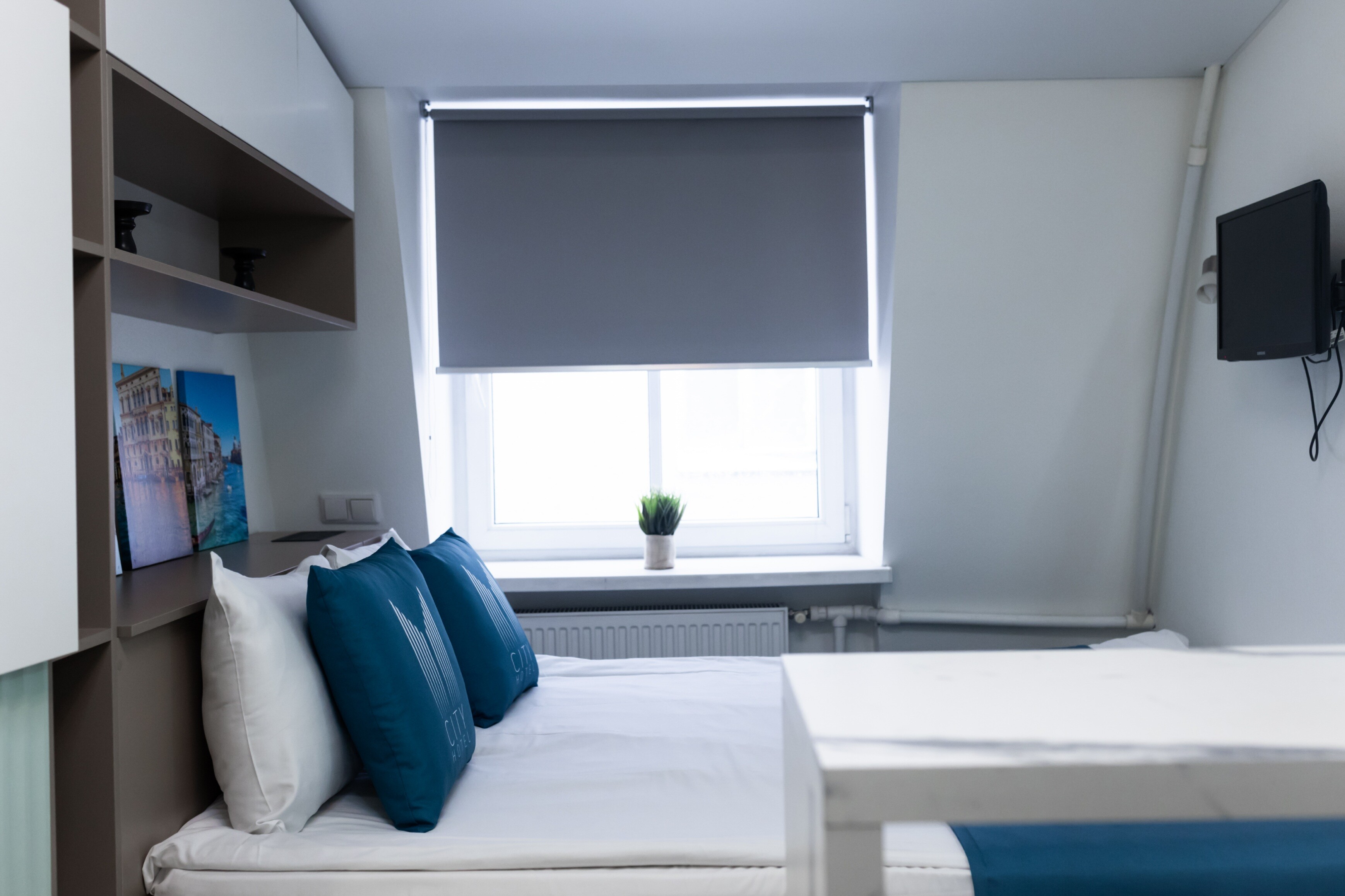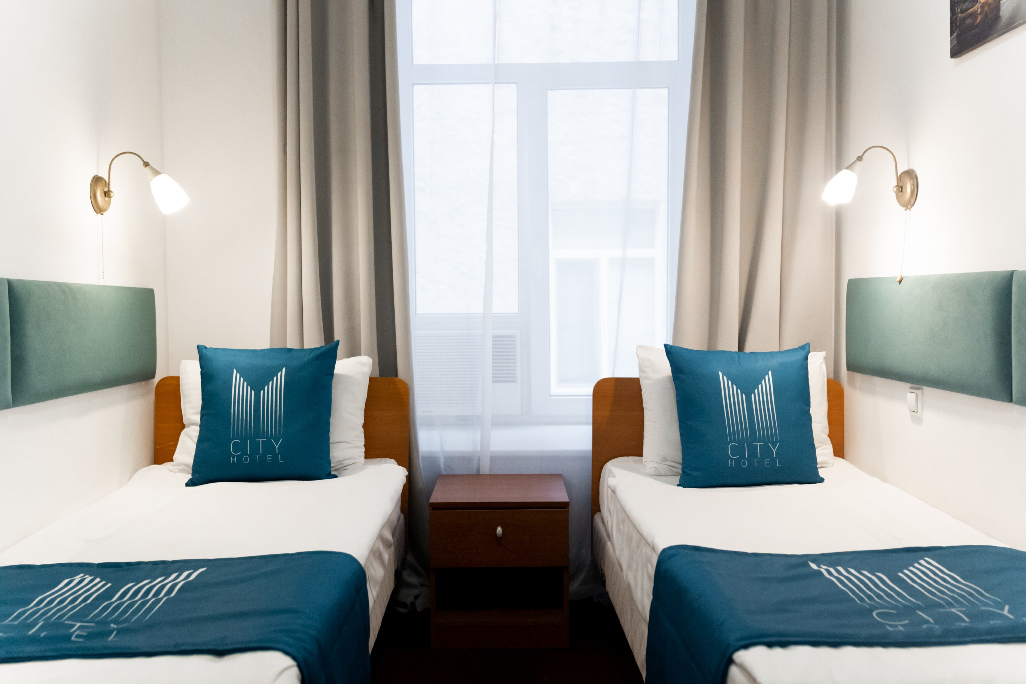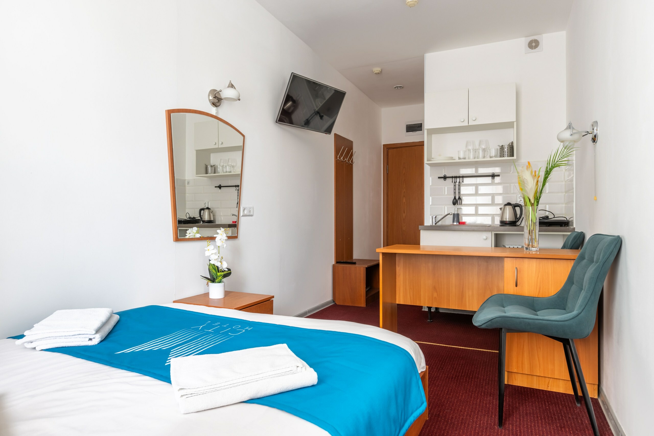 В номере: вешалка, зеркало, кровать односпальная, стол, стул, шкаф, мини-холодильник, сейф, телевизор, чайный набор посуды, электрочайник