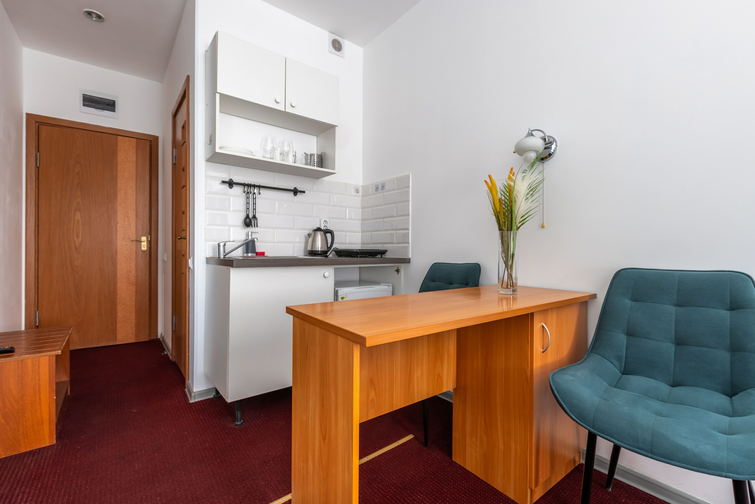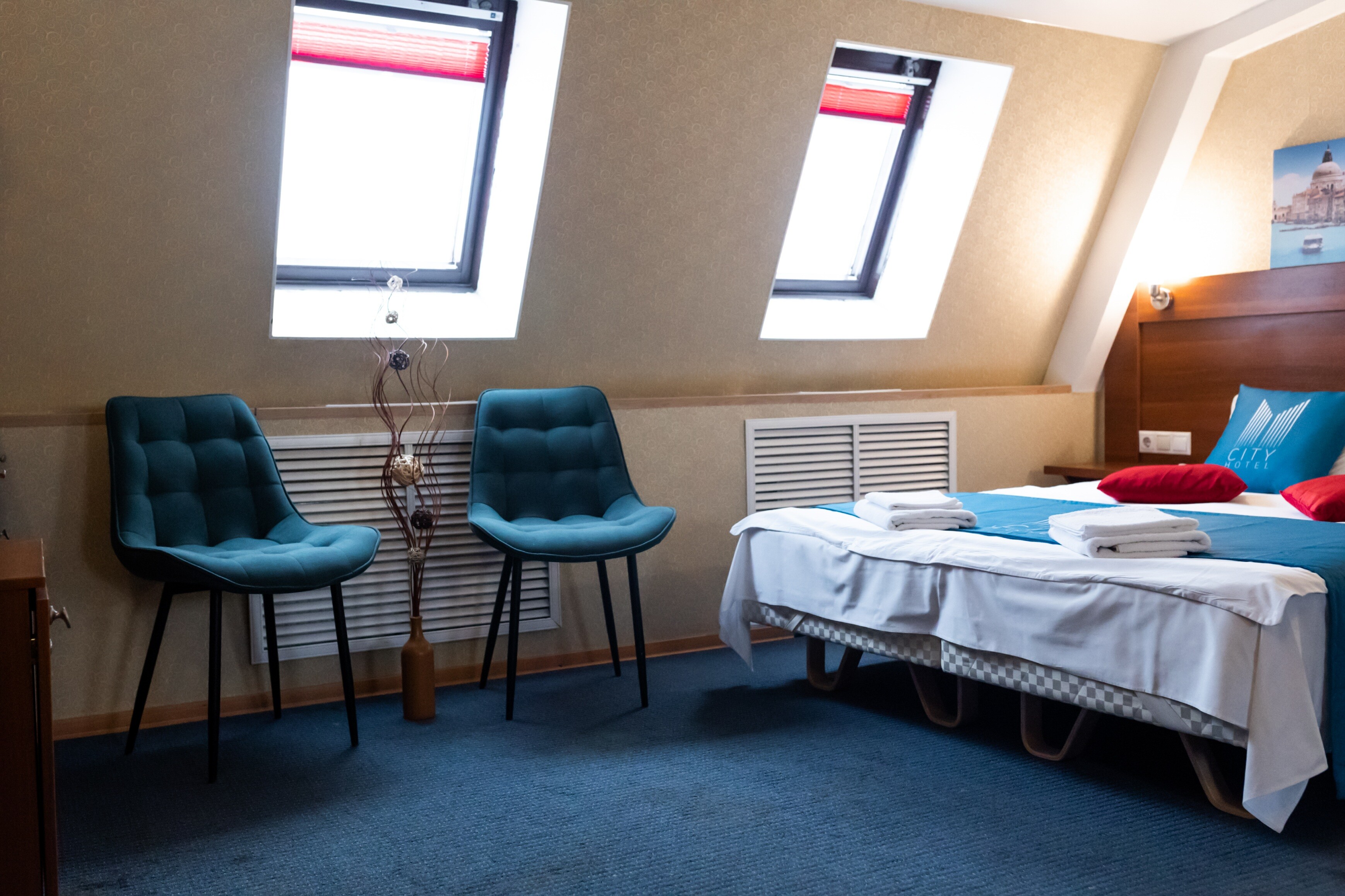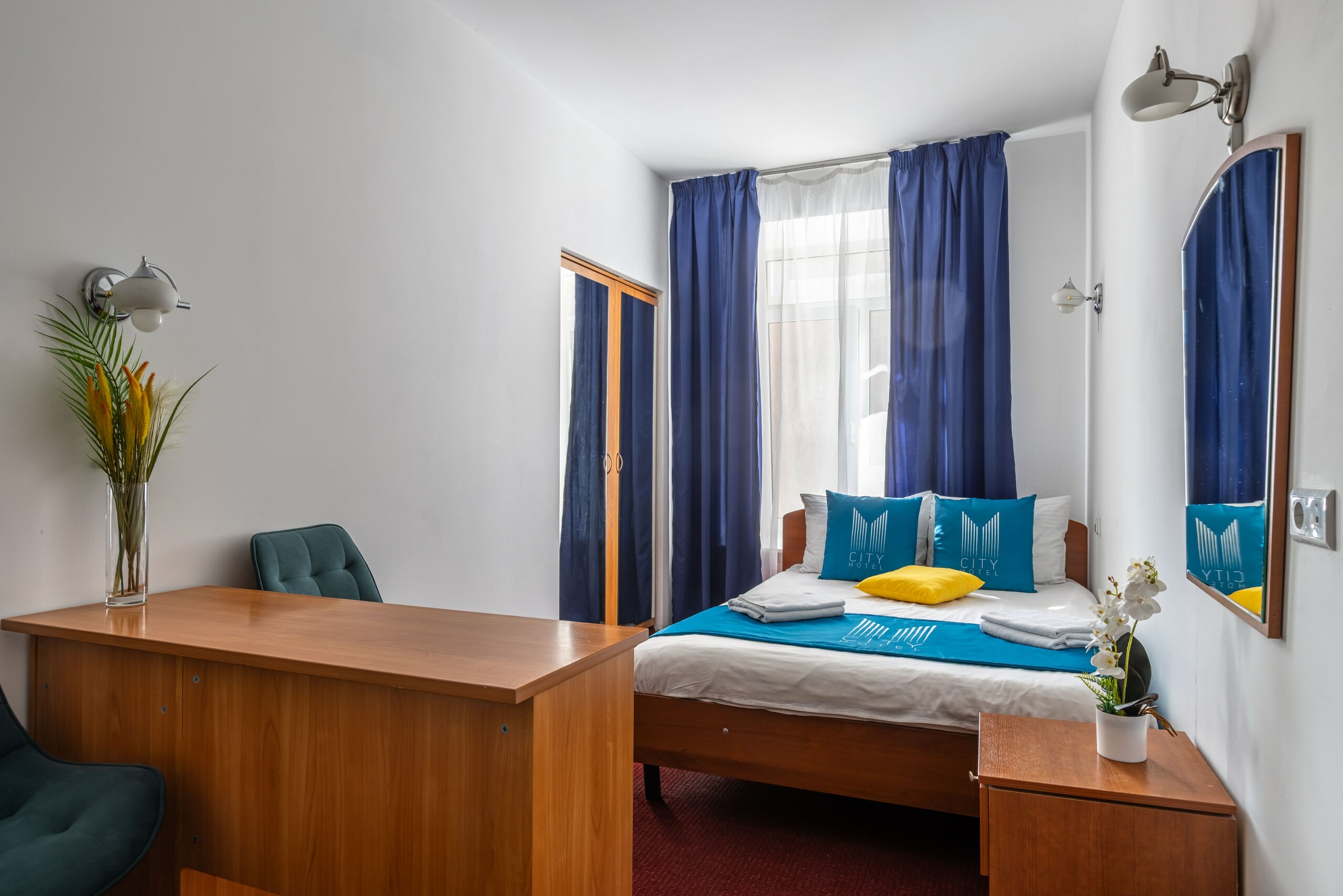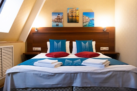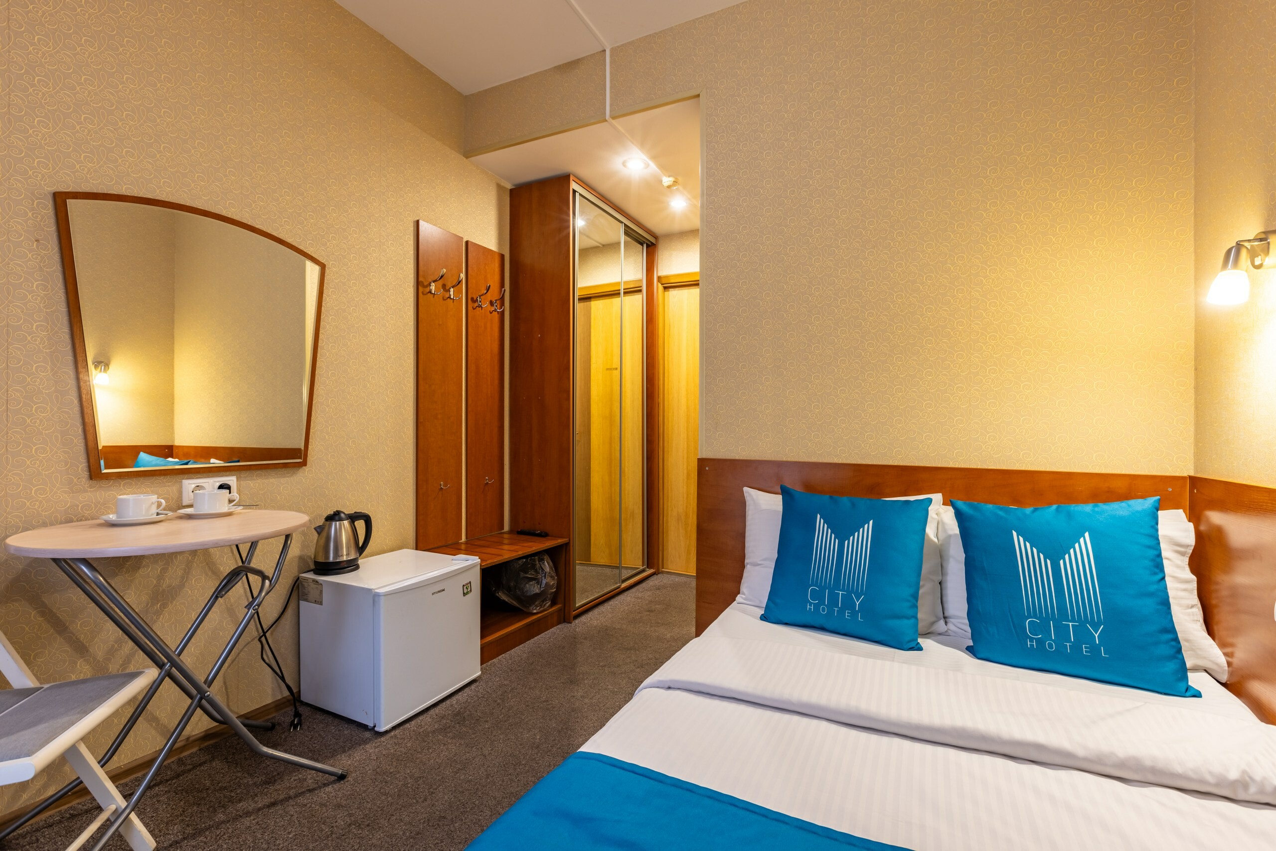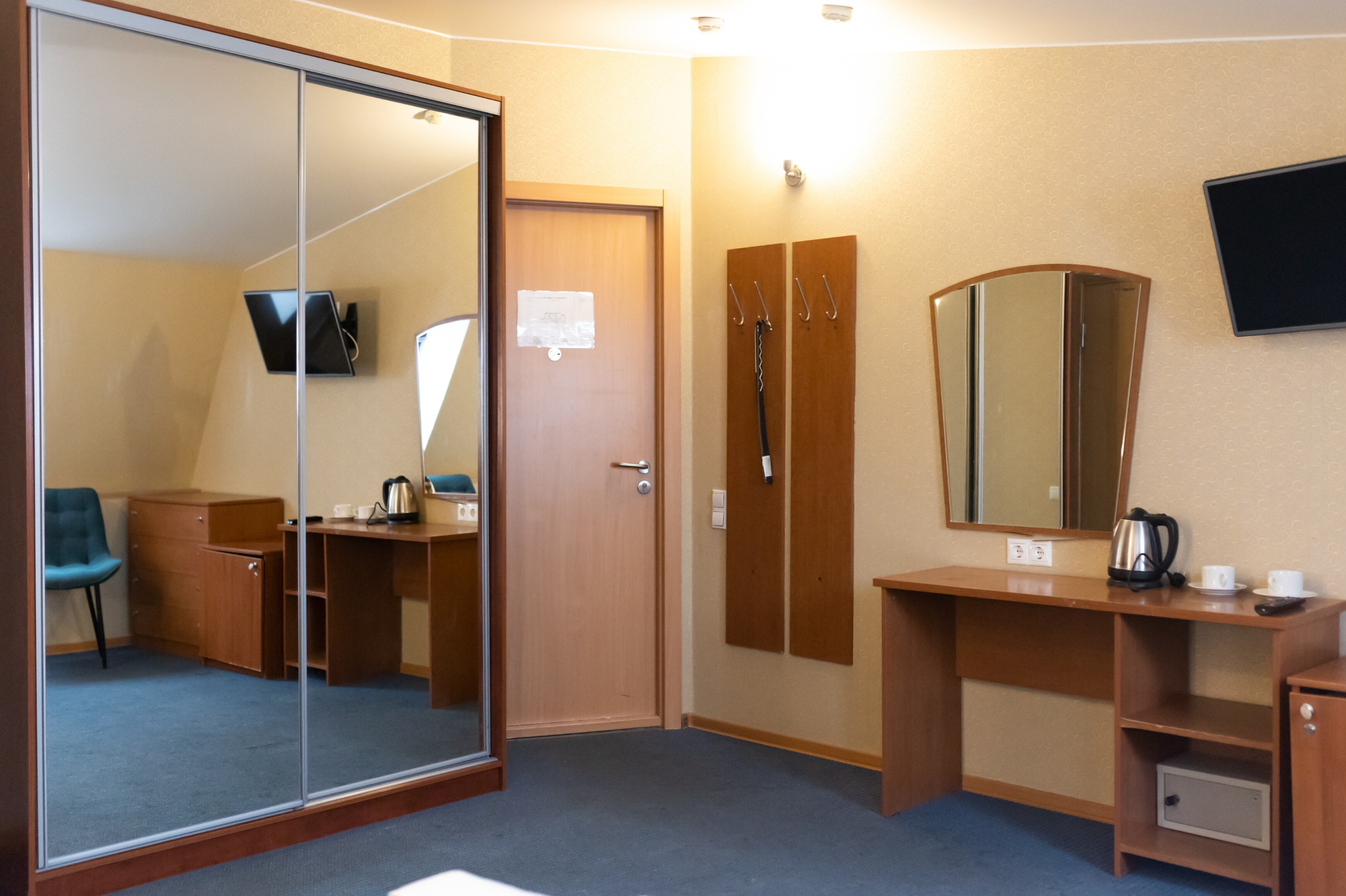 В номере: вешалка, зеркало, кровать двуспальная, стол, стулья, шкаф, мини-холодильник, сейф, телевизор, чайный набор посуды, электрочайник