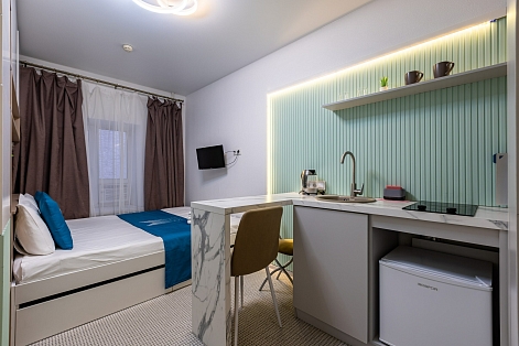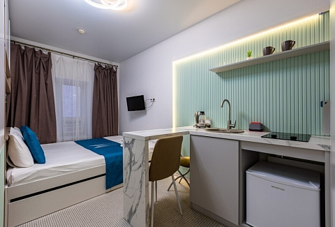 В номере: вешалка, зеркало, кровать двуспальная, стол, стулья, мини-холодильник, набор посуды, плита электрическая, телевизор, электрочайник