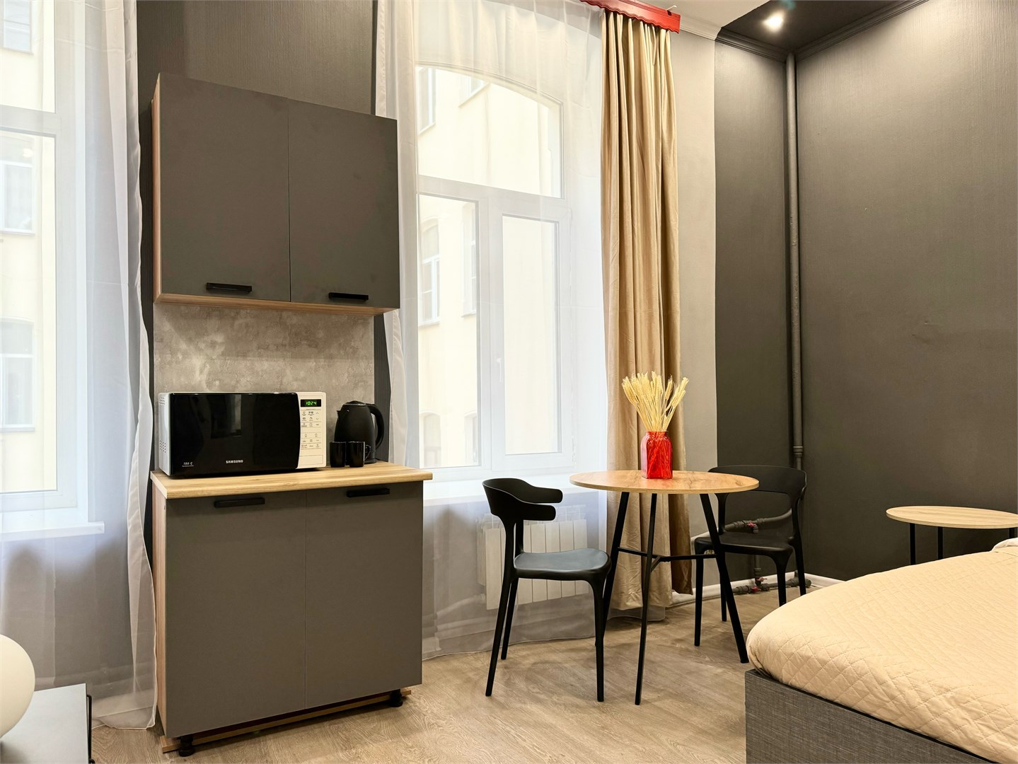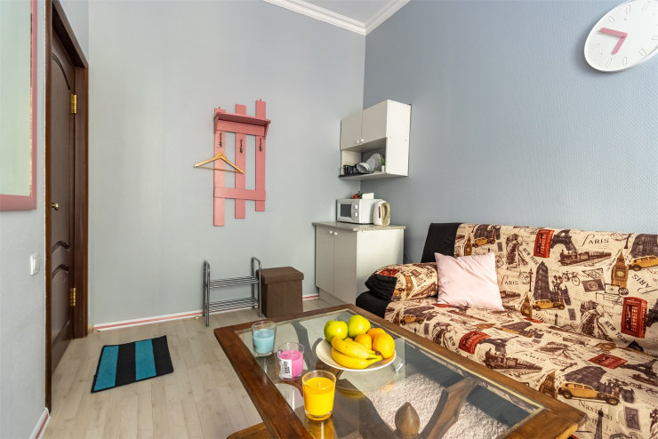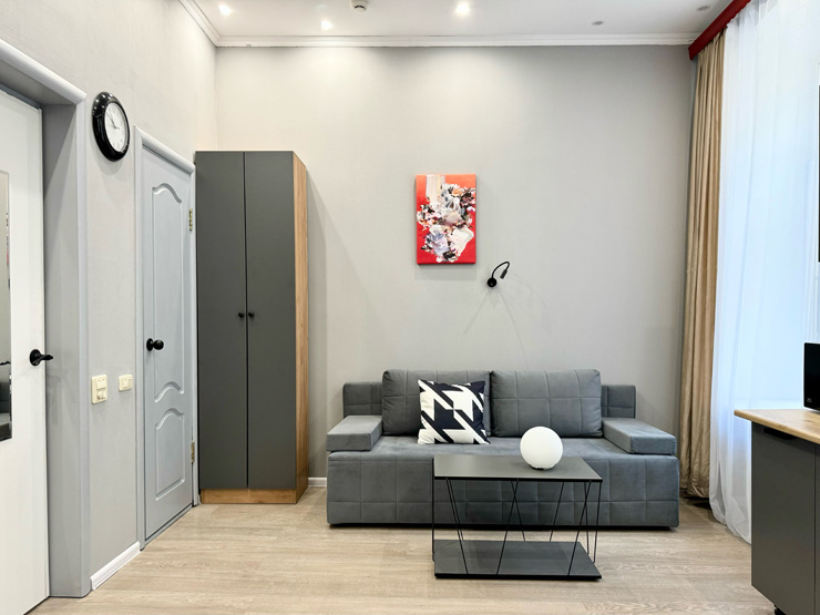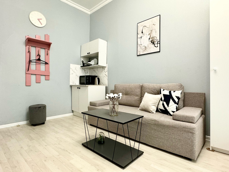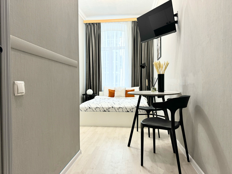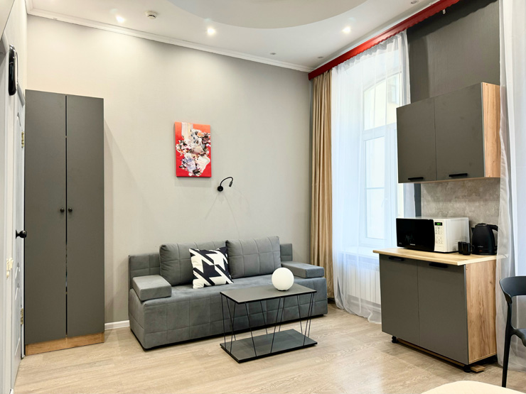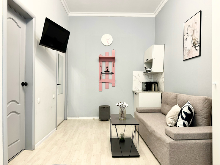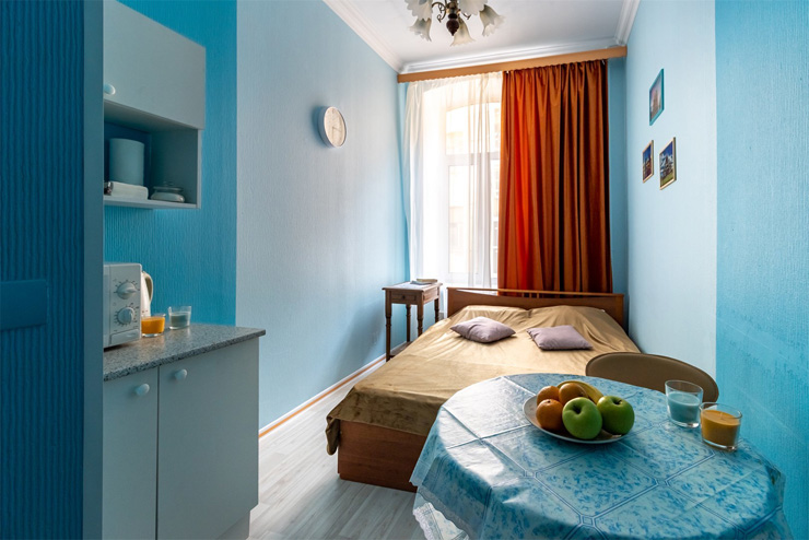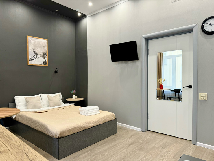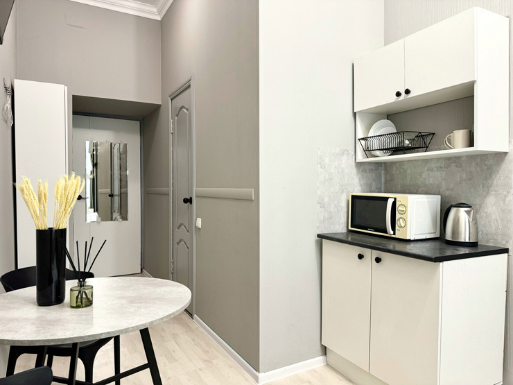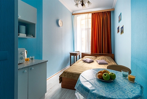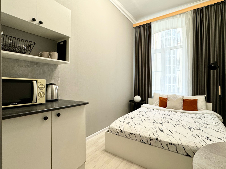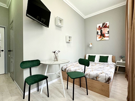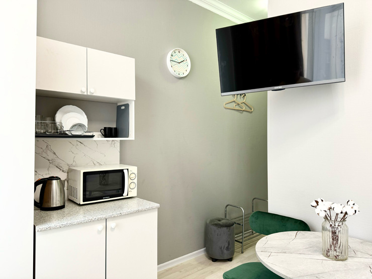 В номере: вешалка, зеркало, кресло, кровать двуспальная, столик журнальный, микроволновая печь, мини-холодильник, набор посуды, электрочайник