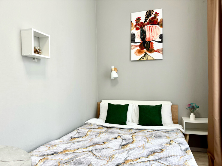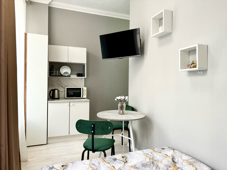В номере: вешалка, зеркало, кровать двуспальная, прикроватная тумбочка, стол, стул, микроволновая печь, мини-холодильник, набор посуды, электрочайник