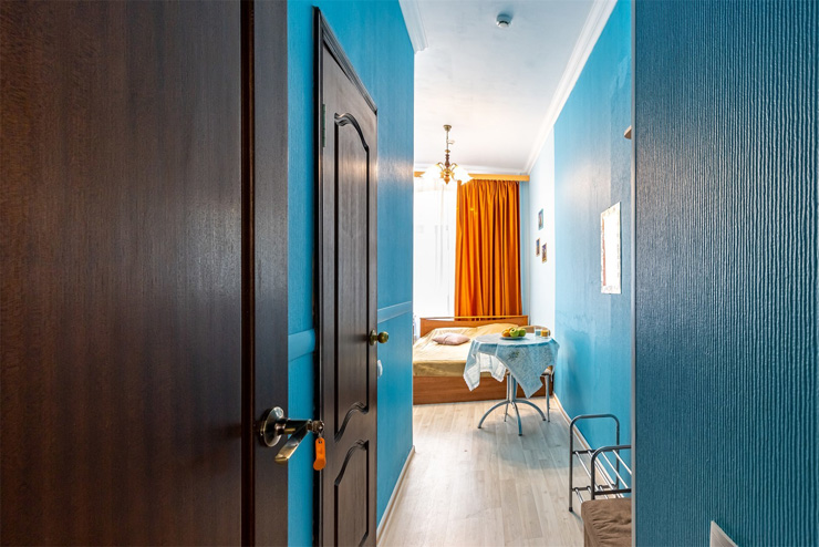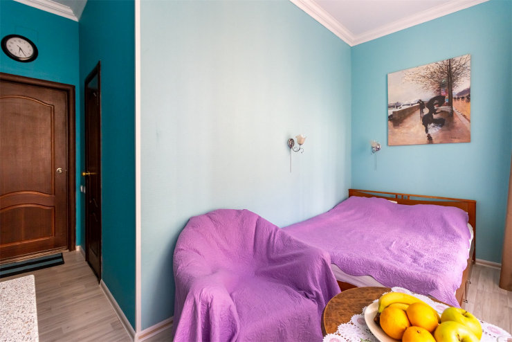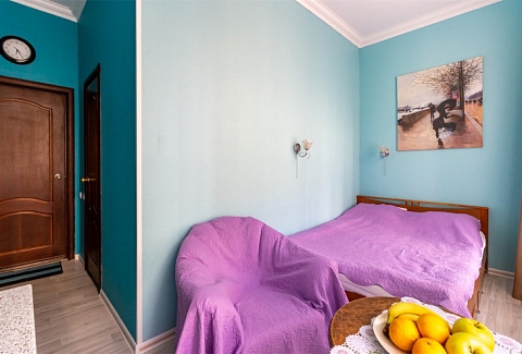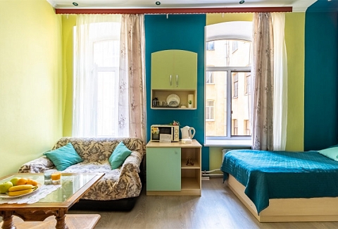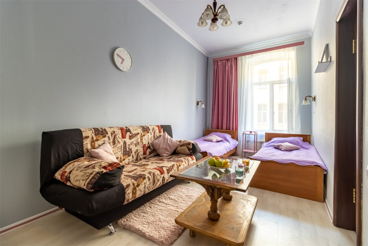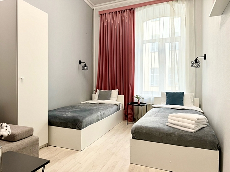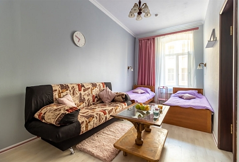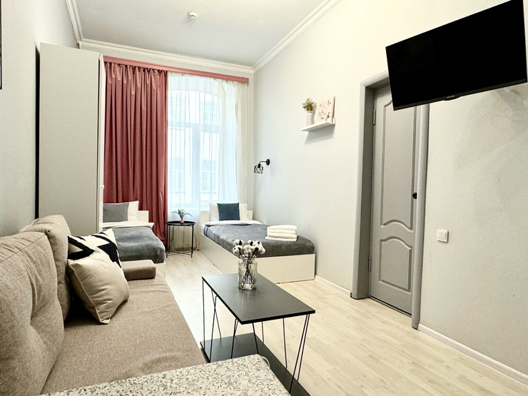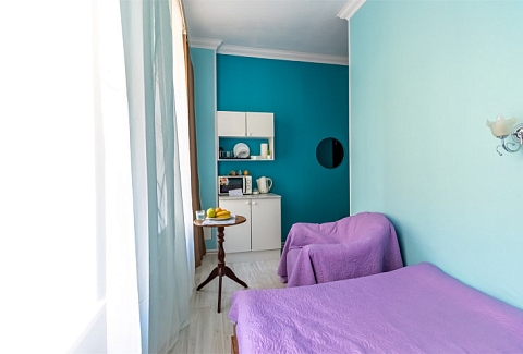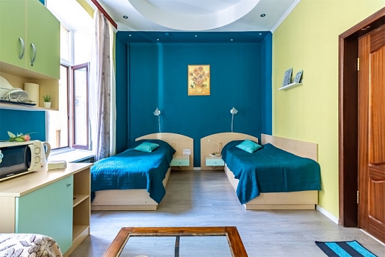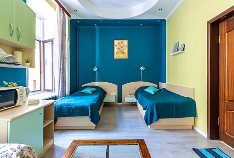 В номере: вешалка, диван раскладной, зеркало, кровати односпальные, прикроватная тумбочка, стол, микроволновая печь, мини-холодильник, набор посуды, электрочайник