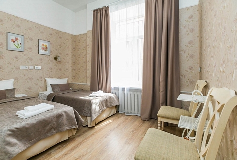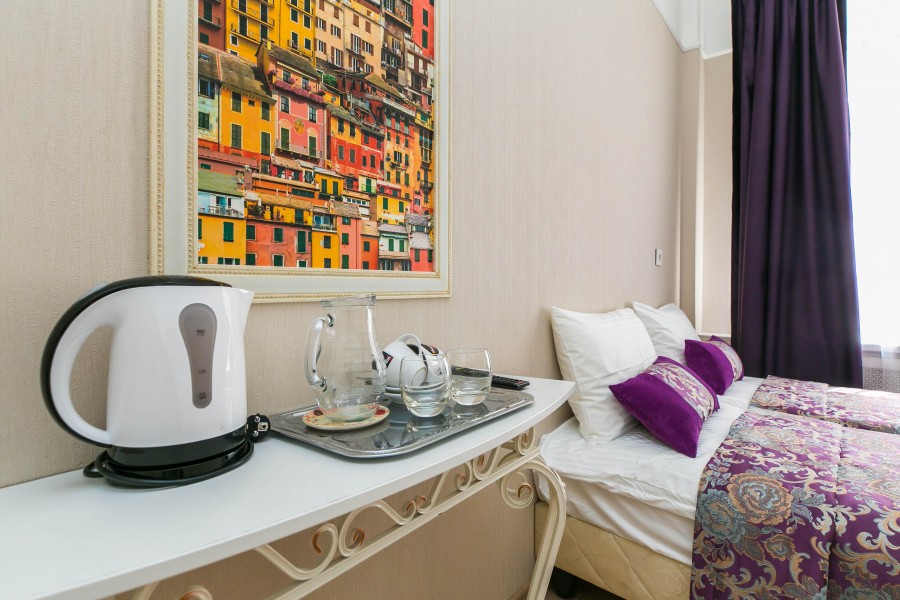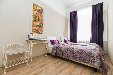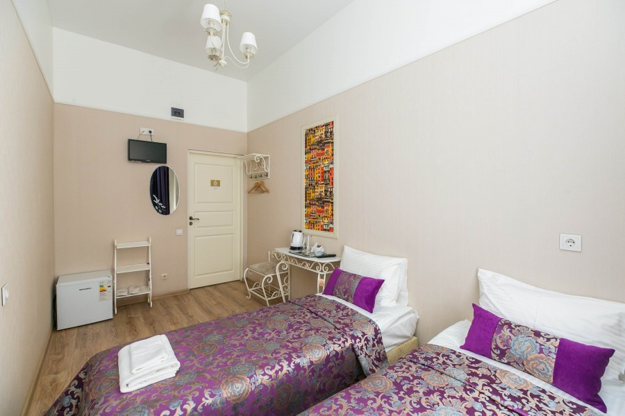 В номере: вешалка, зеркало, кровати односпальные /одна двуспальная кровать, прикроватные тумбочки, стол, стулья, мини-холодильник, телевизор, чайный набор посуды, электрочайник