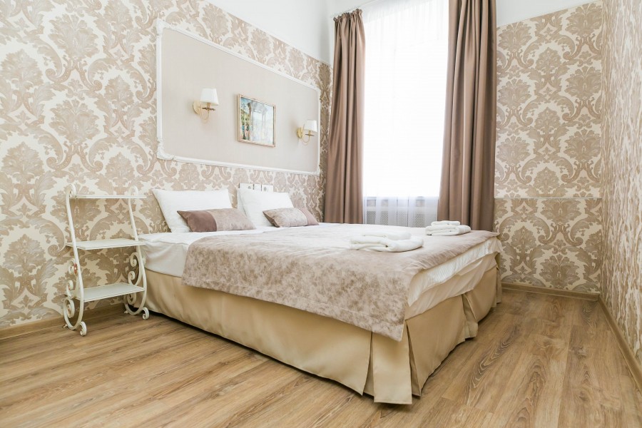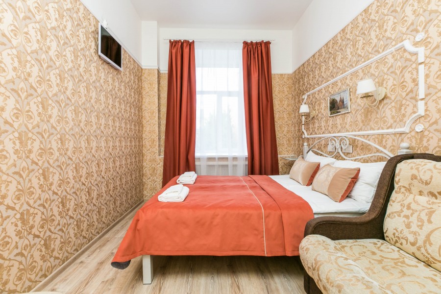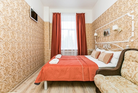 В номере: диван, зеркало, кровать двуспальная, прикроватная тумбочка, стол, стул, шкаф, мини-холодильник, телевизор, чайный набор посуды, электрочайник