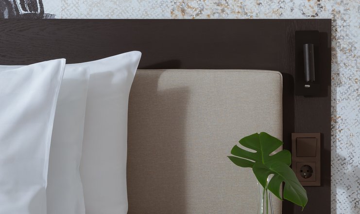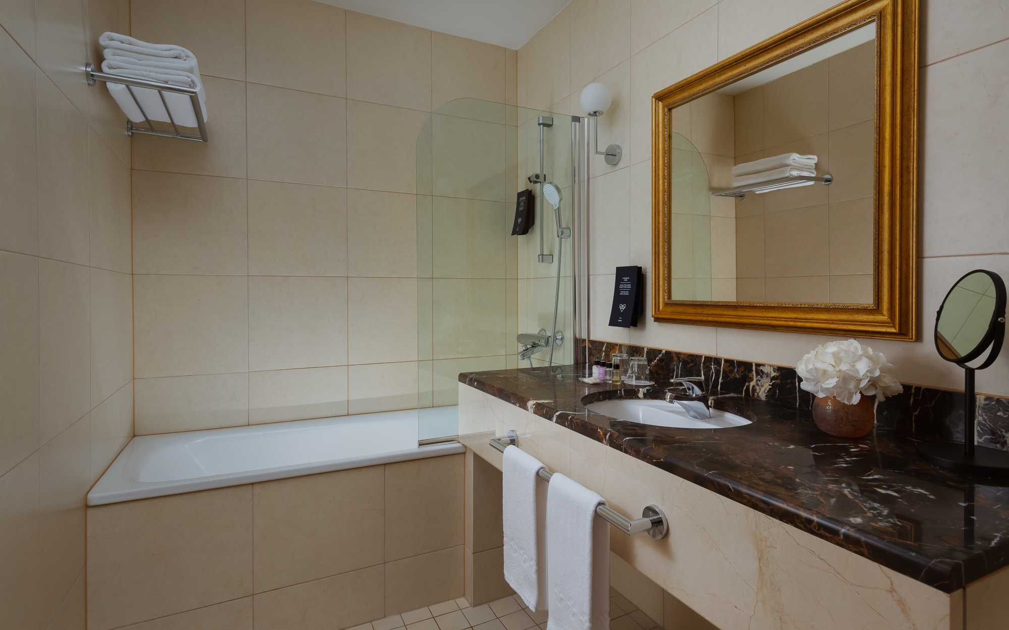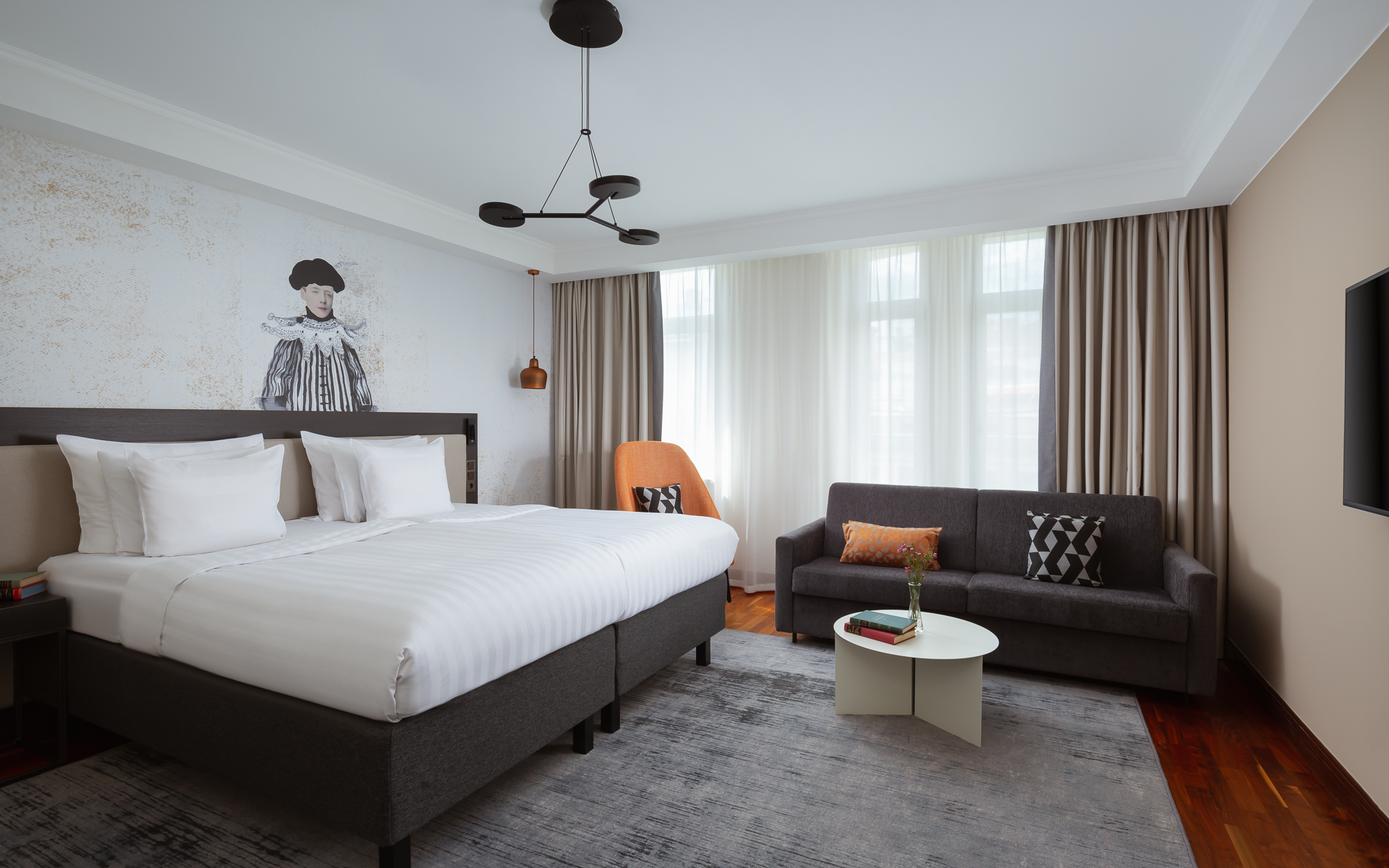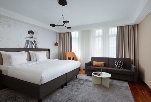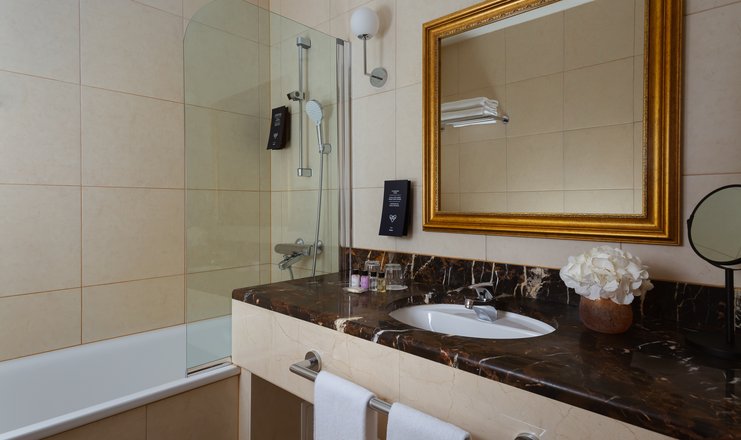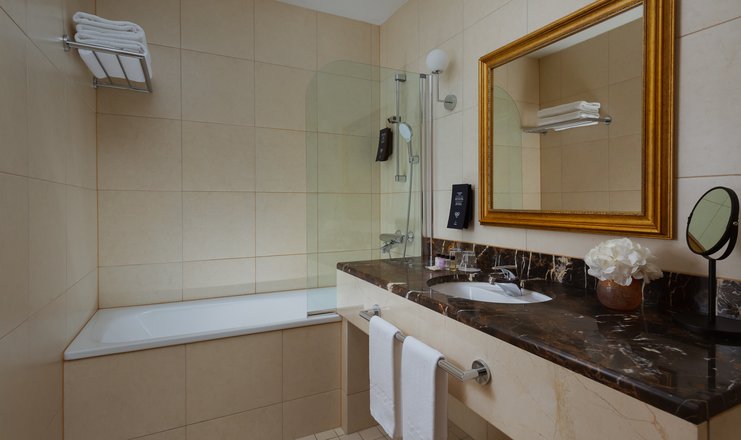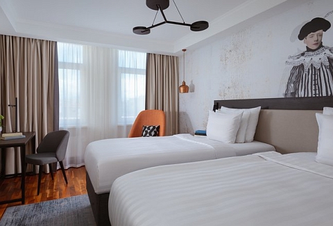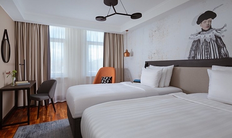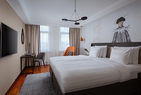 В номере: вешалка, диван, зеркало, кресло, прикроватные тумбочки, стол, шкаф, гладильная доска, кондиционер, кофемашина, мини-холодильник, сейф, телевизор, телефон, утюг, чайный набор посуды, электрочайник