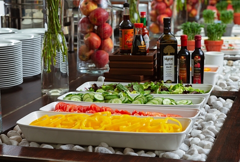В номере: вешалка, зеркало, кресло, кровать двуспальная, прикроватные тумбочки, стол, стул, шкаф, гладильная доска, кондиционер, мини-холодильник, сейф, телевизор, телефон, утюг, чайный набор посуды, электрочайник