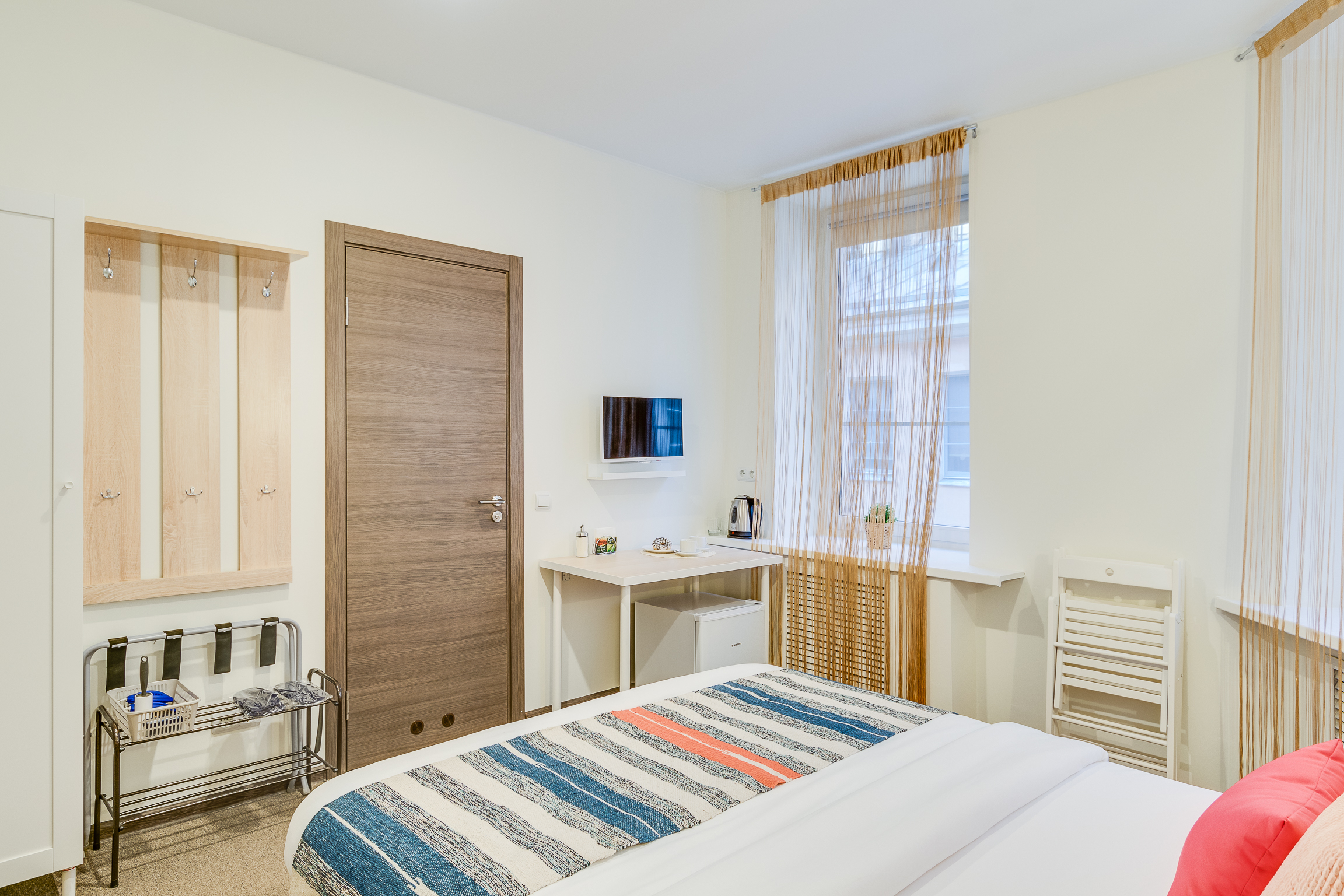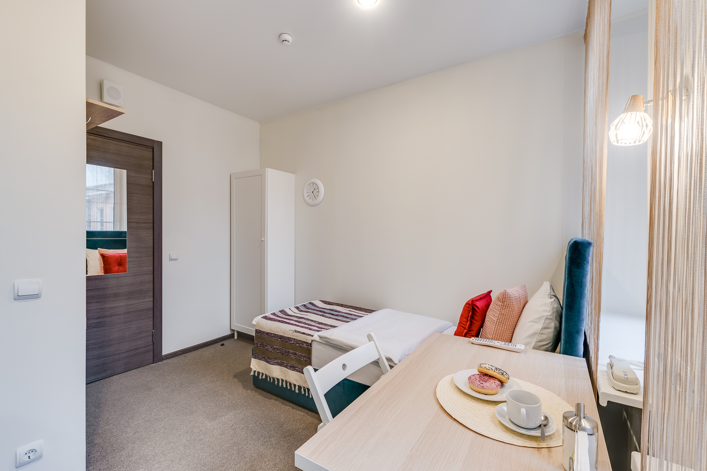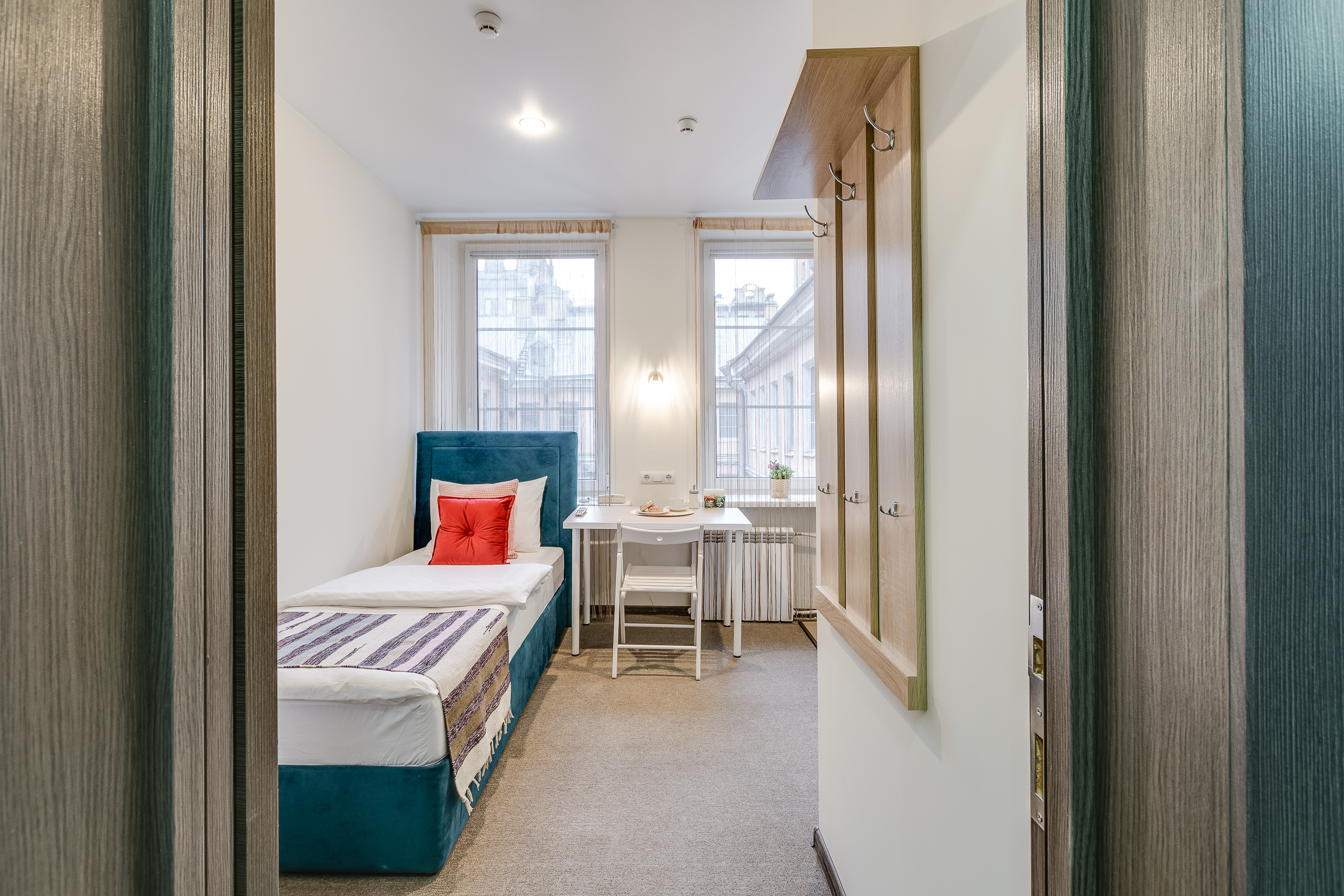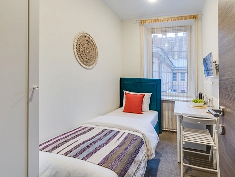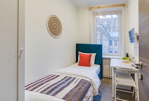 В номере: вешалка, зеркало, кровать односпальная, стол, стул, шкаф, мини-холодильник, сейф, телевизор, чайный набор посуды, электрочайник