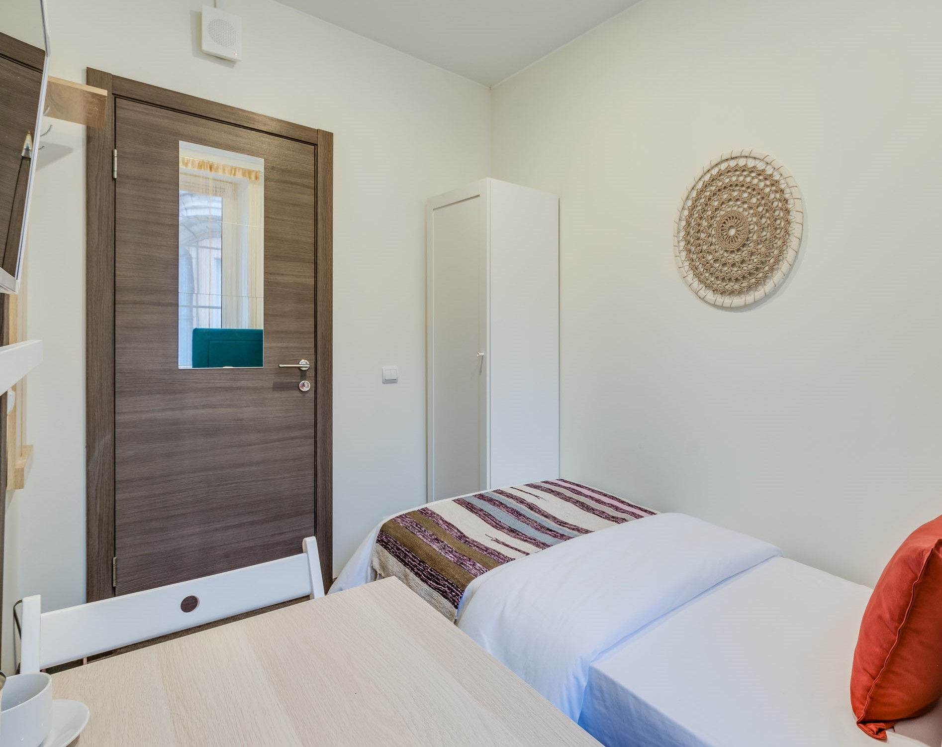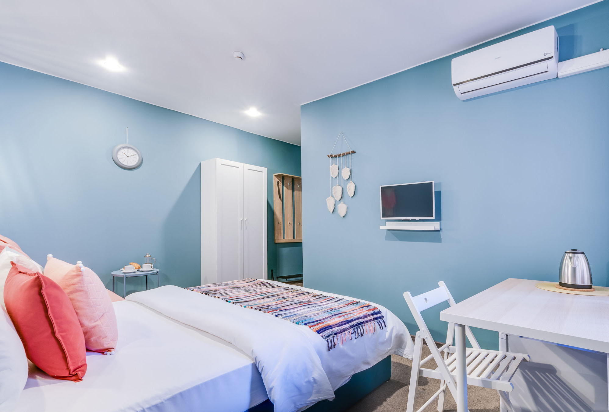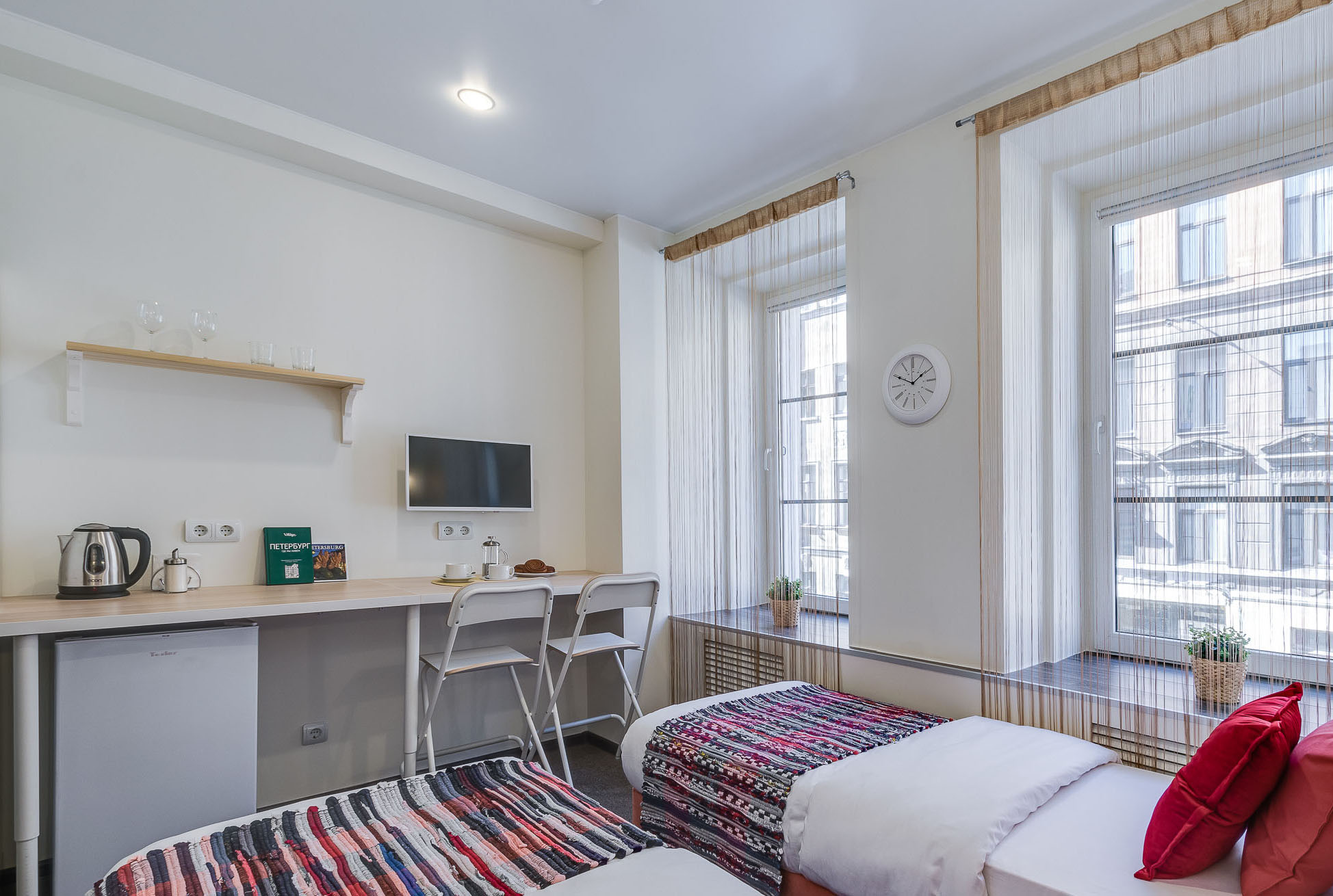 В номере: вешалка, зеркало, кровать односпальная, стол, стул, шкаф, мини-холодильник, сейф, телевизор, чайный набор посуды, электрочайник