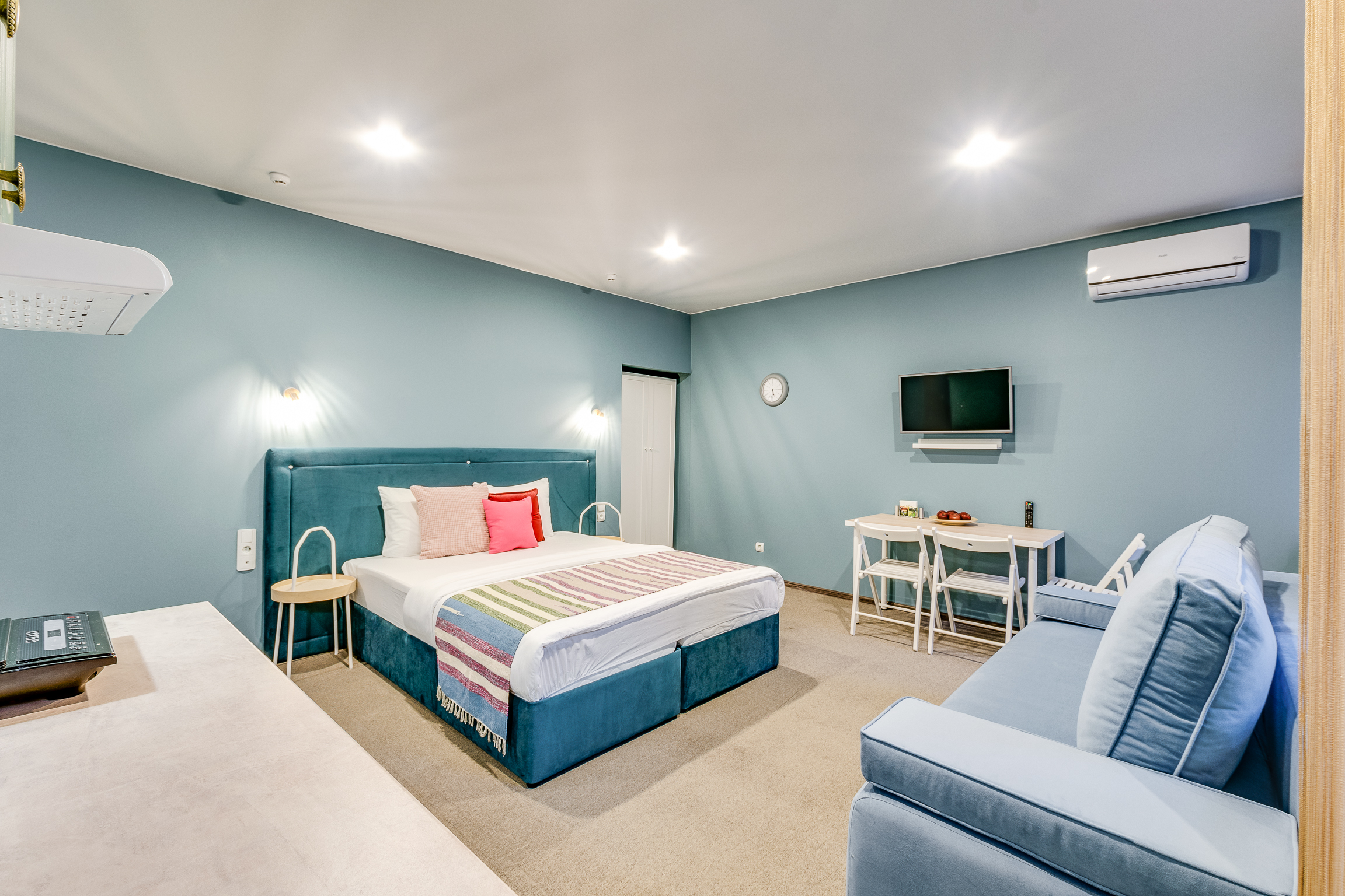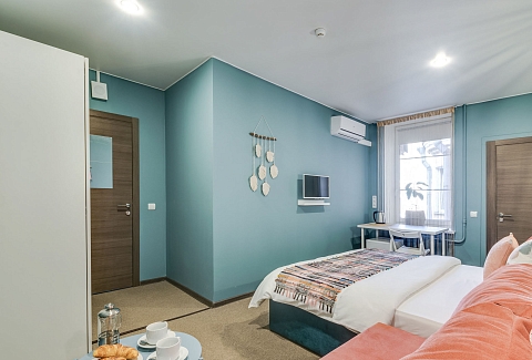В номере: вешалка, диван раскладной, зеркало, кровати односпальные /одна двуспальная кровать, прикроватный столик, стол, столик кофейный, стулья, шкаф, кондиционер, сейф, телевизор, холодильник, чайный набор посуды, электрочайник