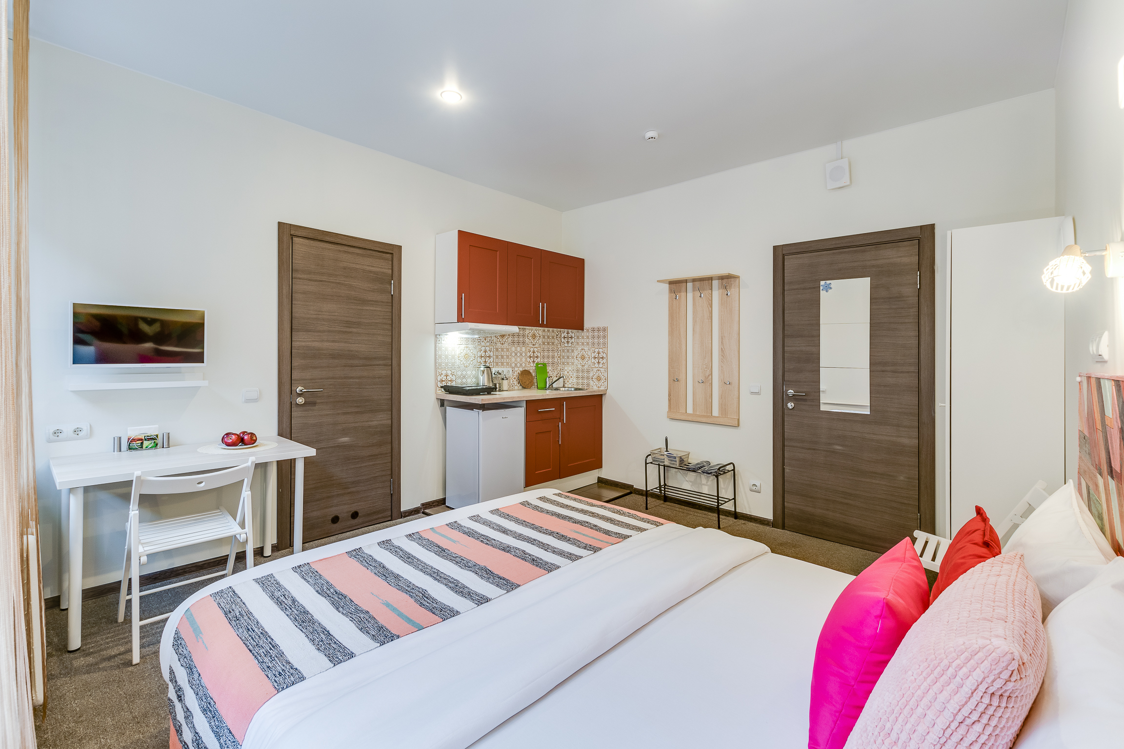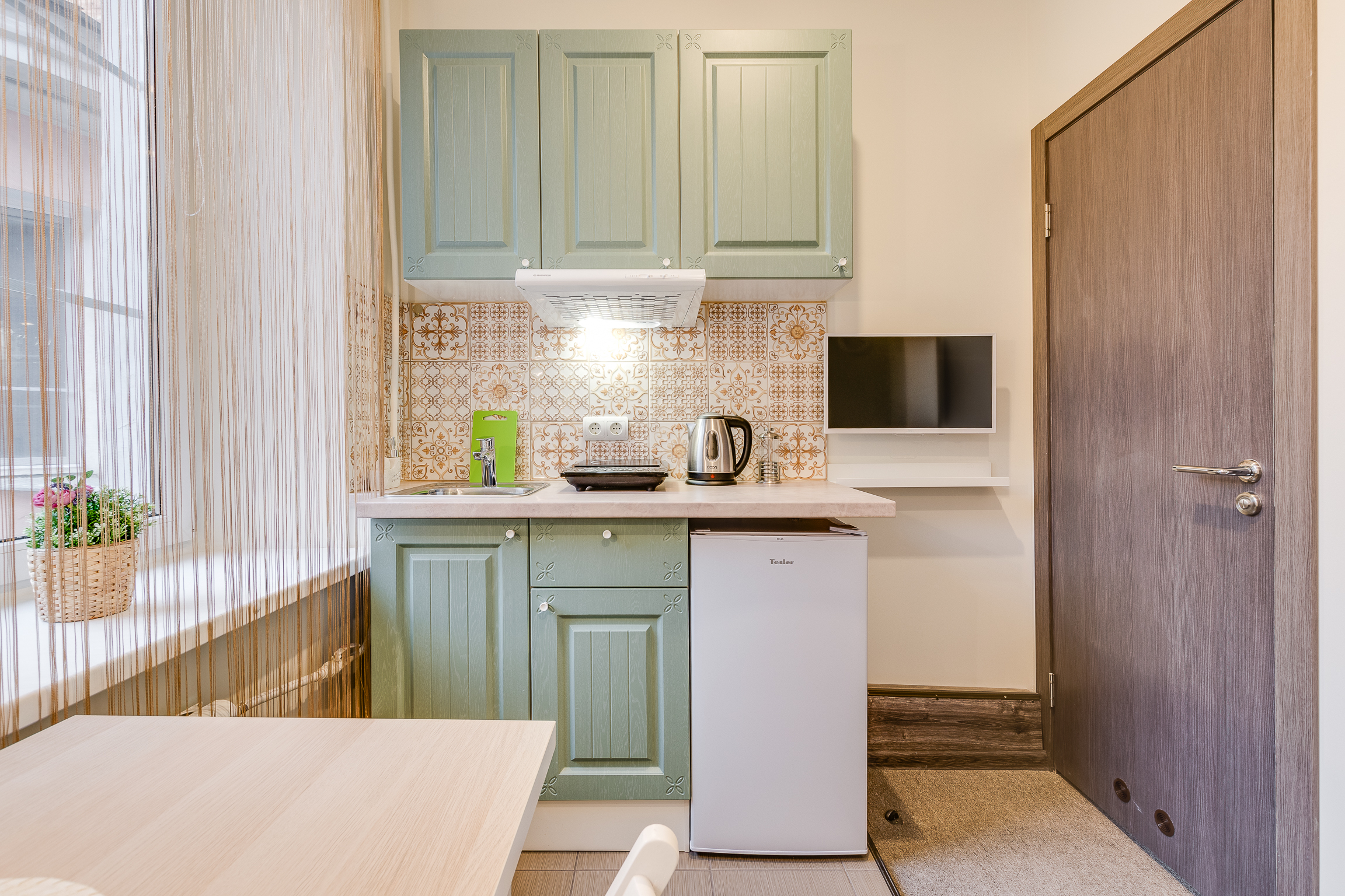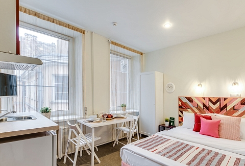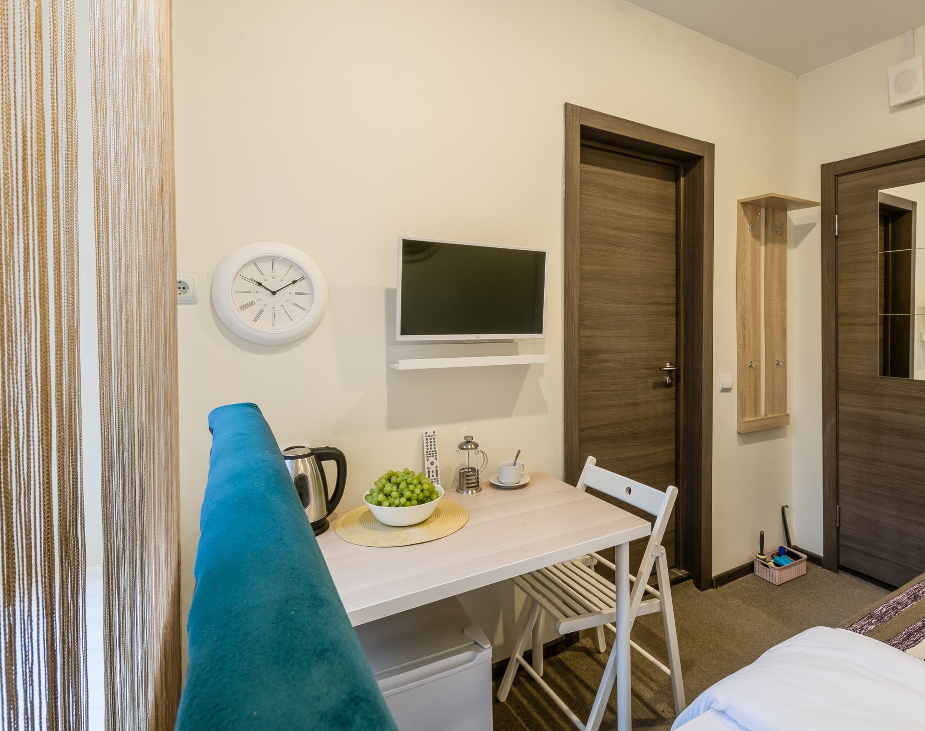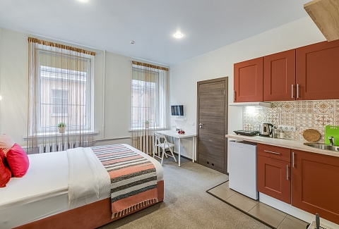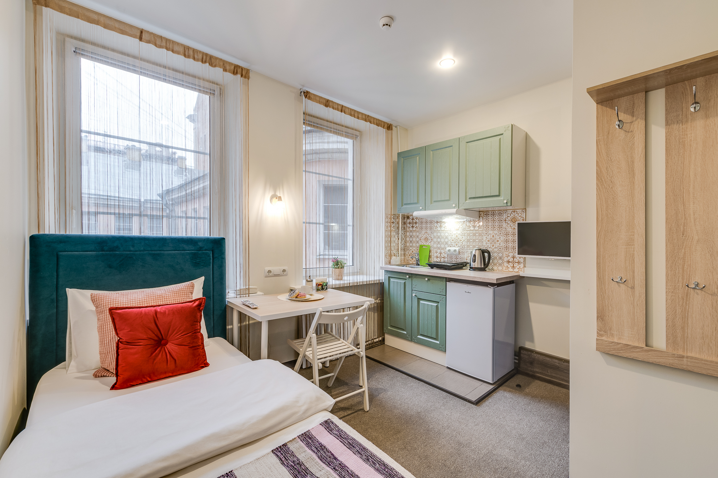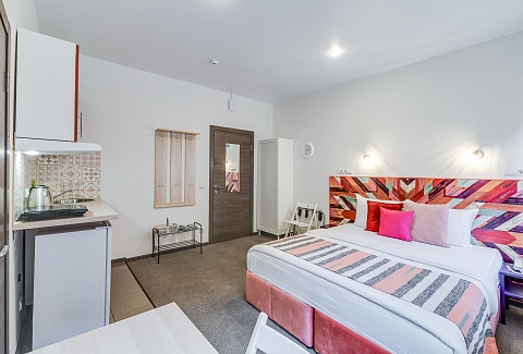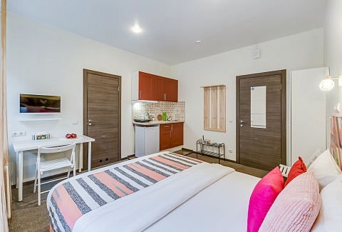 В номере: вешалка, зеркало, кровать односпальная, кухонная мебель, стол, стул, шкаф, набор посуды, плита электрическая, сейф, телевизор, холодильник, электрочайник