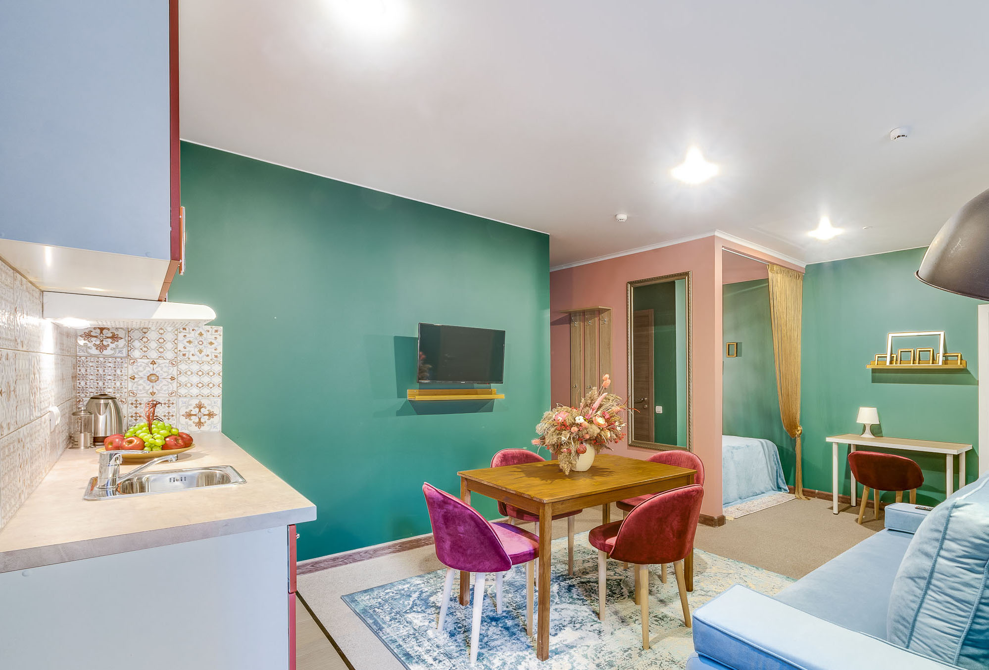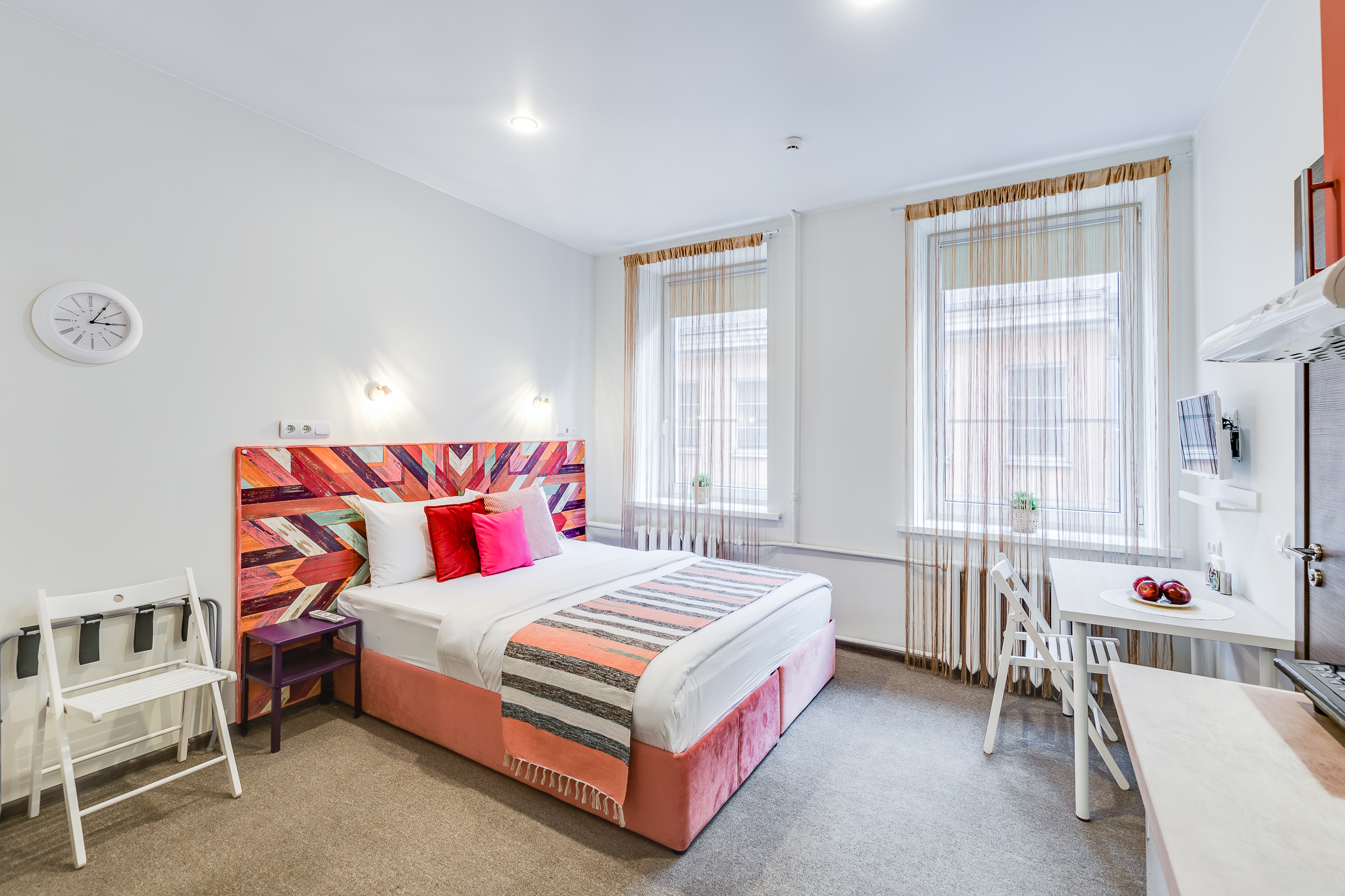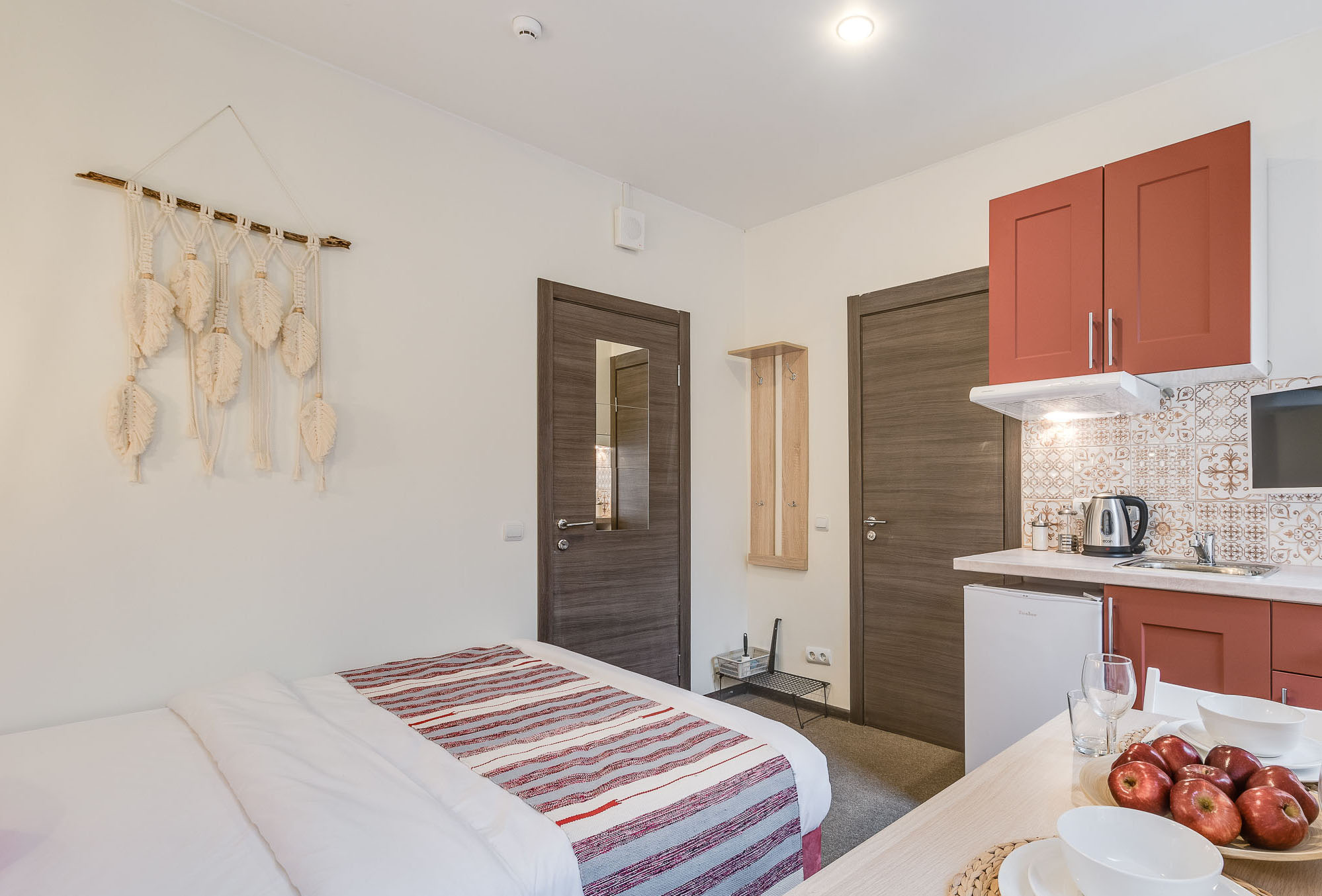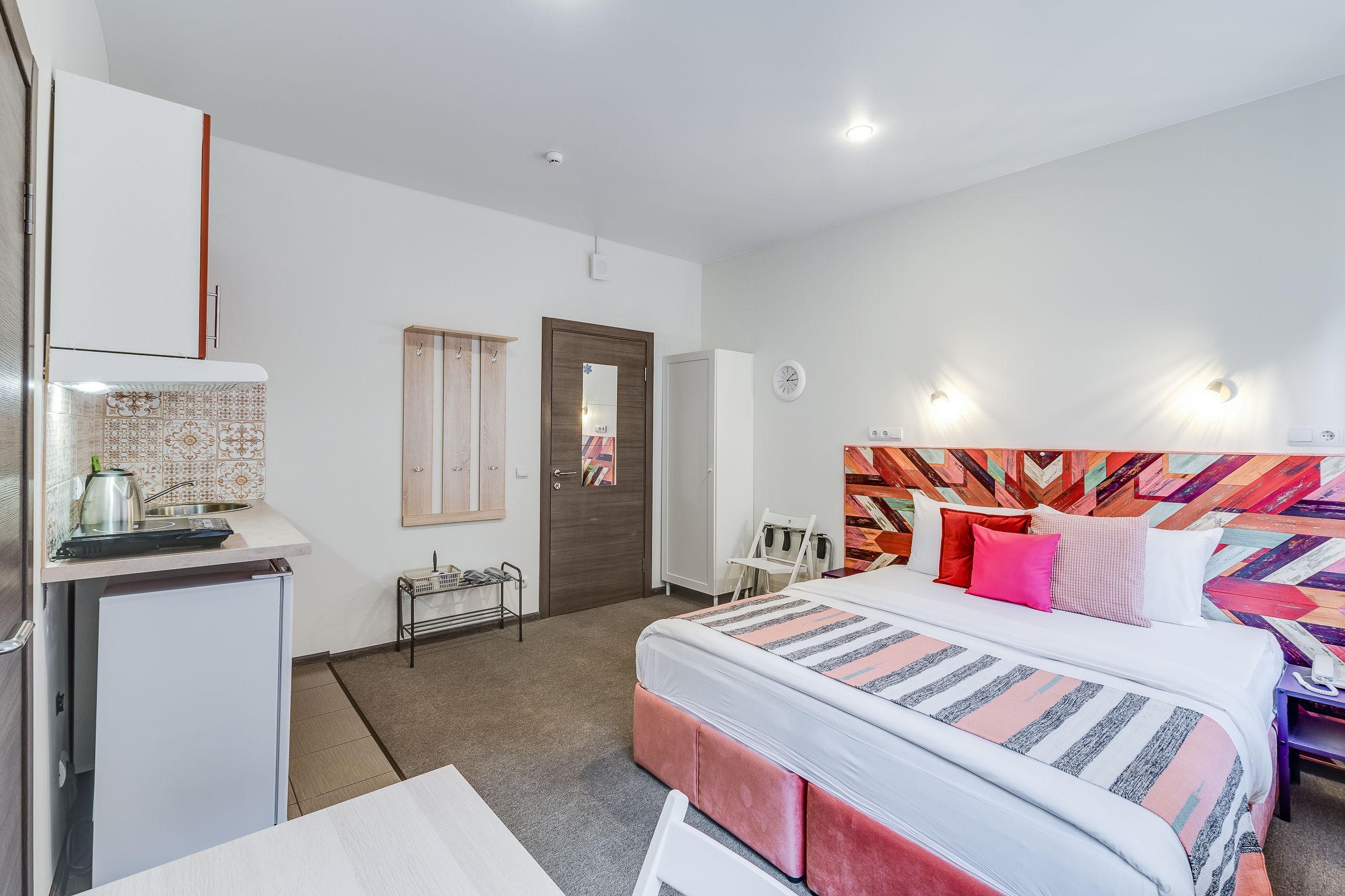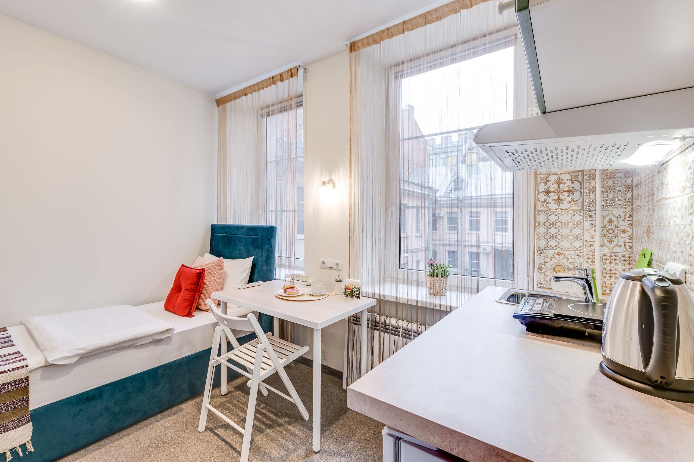 В номере: вешалка, зеркало, кровать односпальная, кухонная мебель, стол, стул, шкаф, набор посуды, плита электрическая, сейф, телевизор, холодильник, электрочайник