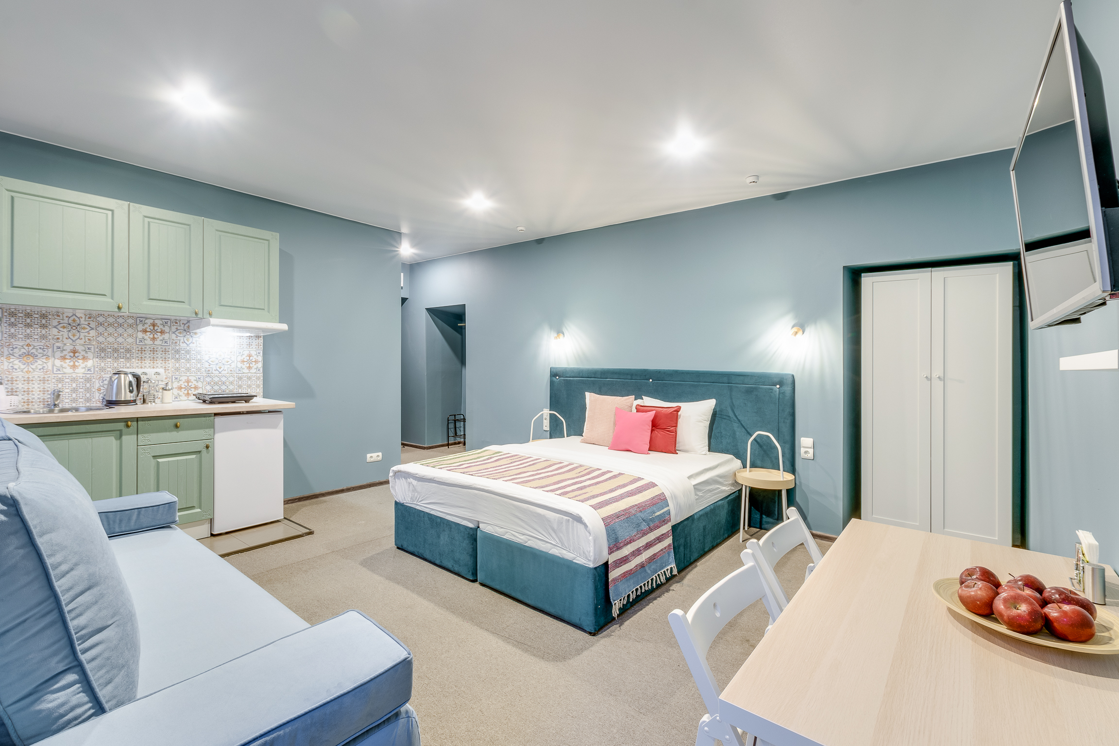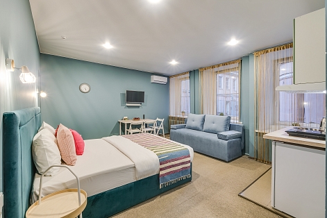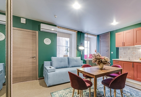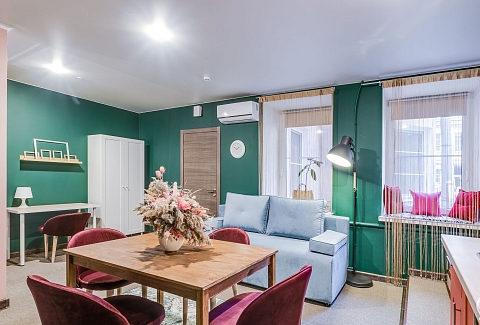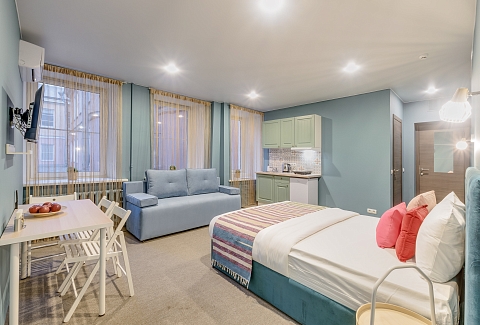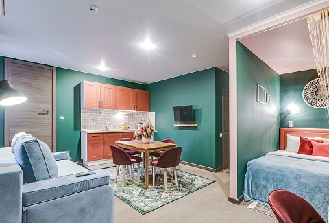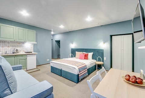 В номере: вешалка, диван раскладной, зеркало, кровати односпальные /одна двуспальная кровать, кровать двуспальная, кухонная мебель, прикроватный столик, стол, стол обеденный, стулья, шкаф, кондиционер, набор посуды, плита электрическая, сейф, телевизор, холодильник, чайный набор посуды, электрочайник