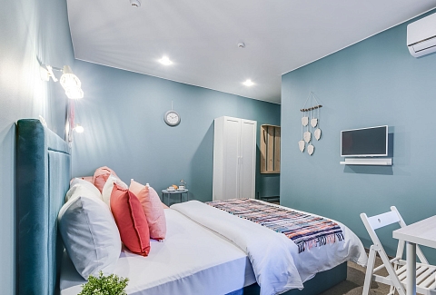 В номере: вешалка, диван раскладной, зеркало, кровати односпальные /одна двуспальная кровать, кухонная мебель, обувная полка, прикроватные столики, стол, стулья, шкаф, кондиционер, набор посуды, плита электрическая, сейф, телевизор, холодильник, чайный набор посуды, электрочайник