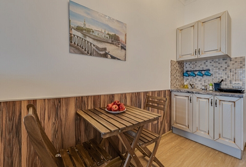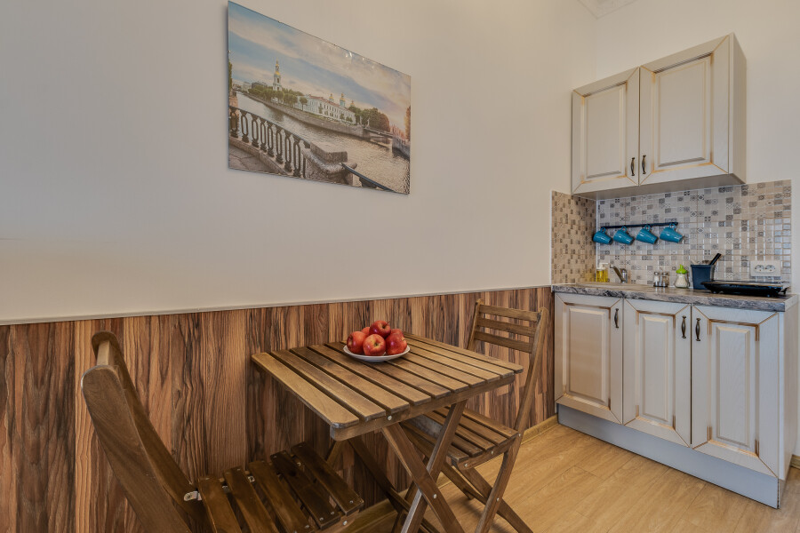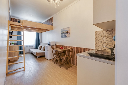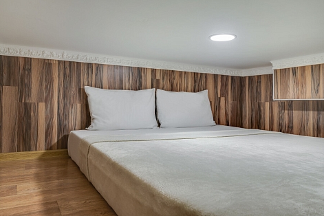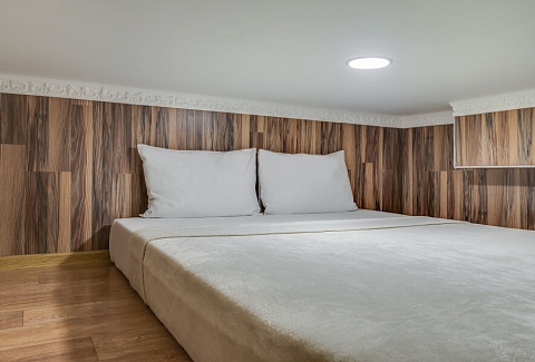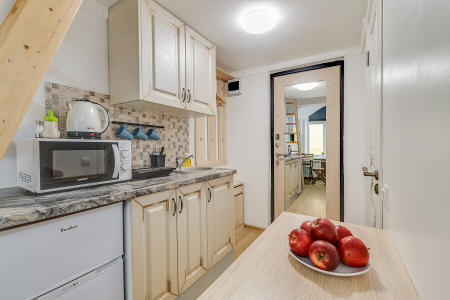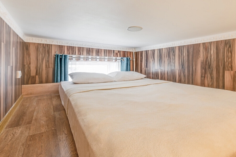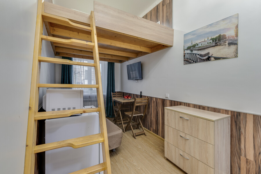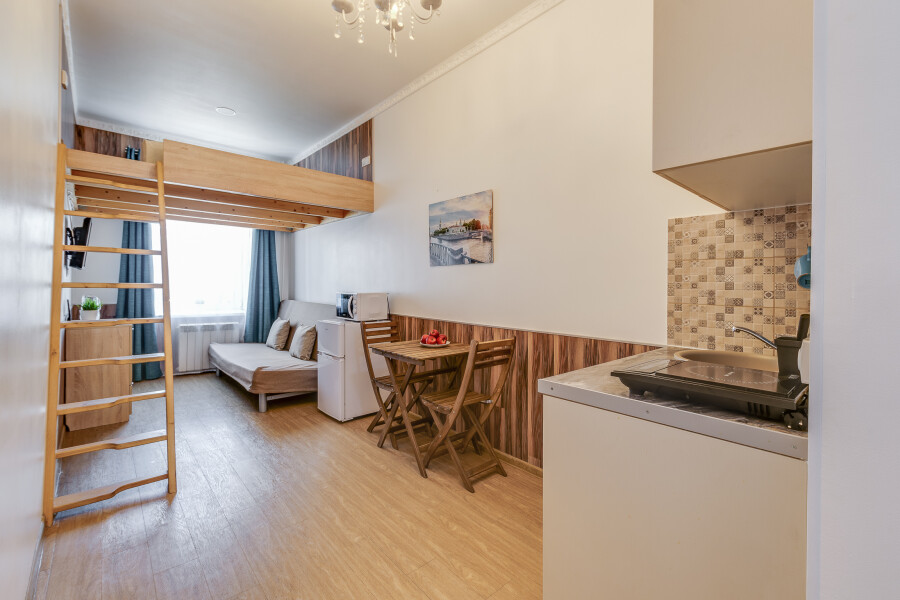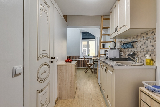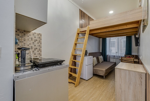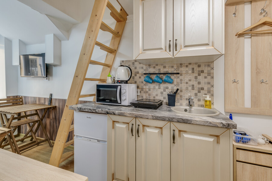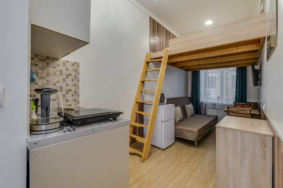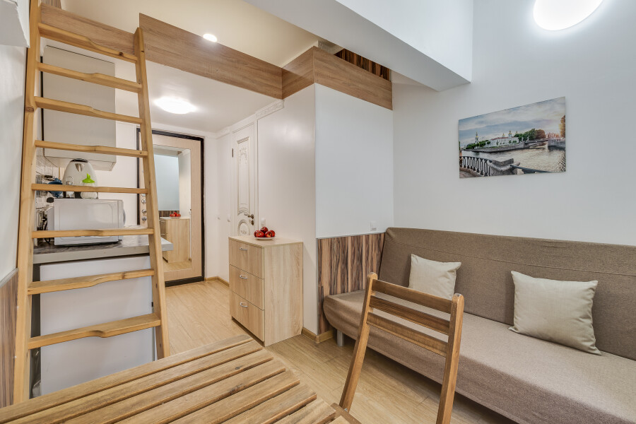 Уютные апартаменты, оформленные в приятных светло-кофейных тонах, расположены в бывшем доходном доме Цветковых. В здании работают продуктовый магазин, суши-бар, 2 кофейни. Припарковать личный транспорт можно вдоль дороги. Номерной фонд включает 8 двухуровневых студий на 3 и 4 гостей. Все апартаменты имеют схожую планировку: первый этаж отведен под кухню-гостиную с диваном и санузел, на втором ярусе обустроены два спальных места. В общем доступе установлены стиральная машина и гладильные принадлежности. На всей территории постояльцам доступно подключение к Wi-Fi.