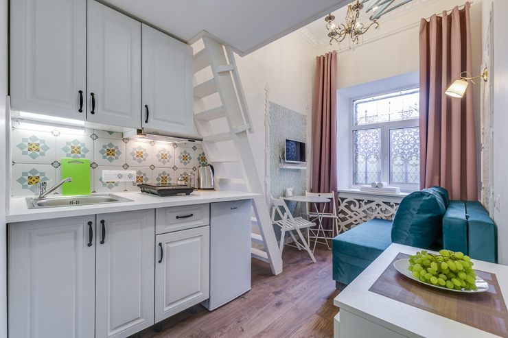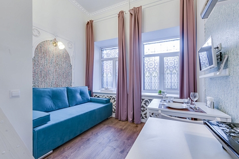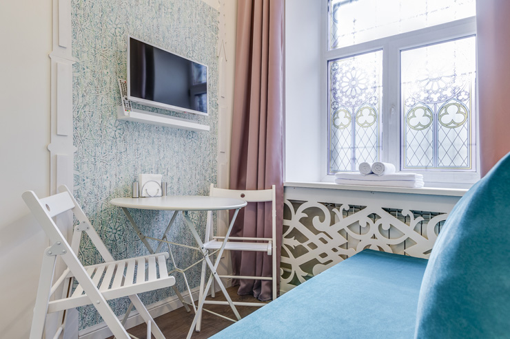 В номере: вешалка, диван раскладной, зеркало, матрас, стол, стулья, мини-холодильник, набор посуды, плита электрическая, телевизор, электрочайник