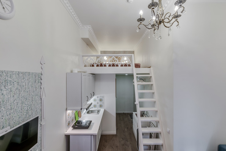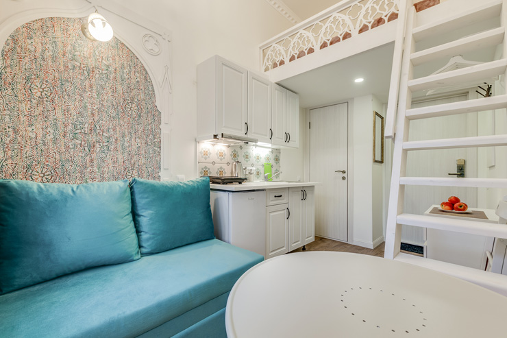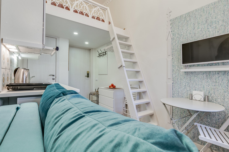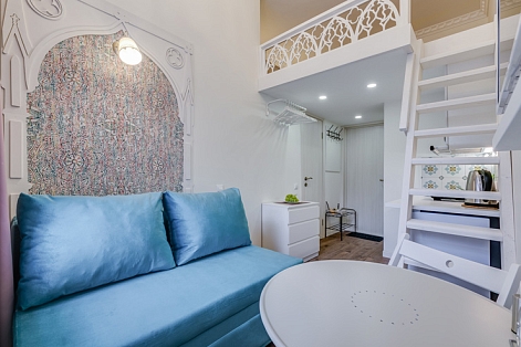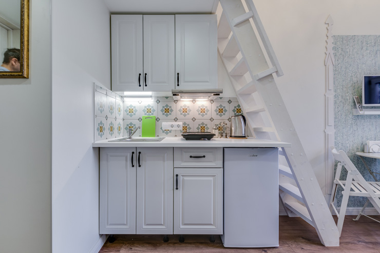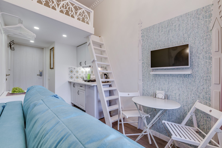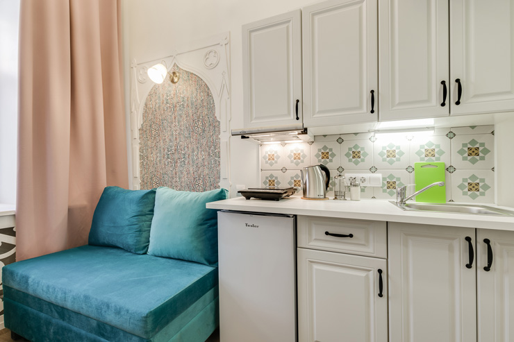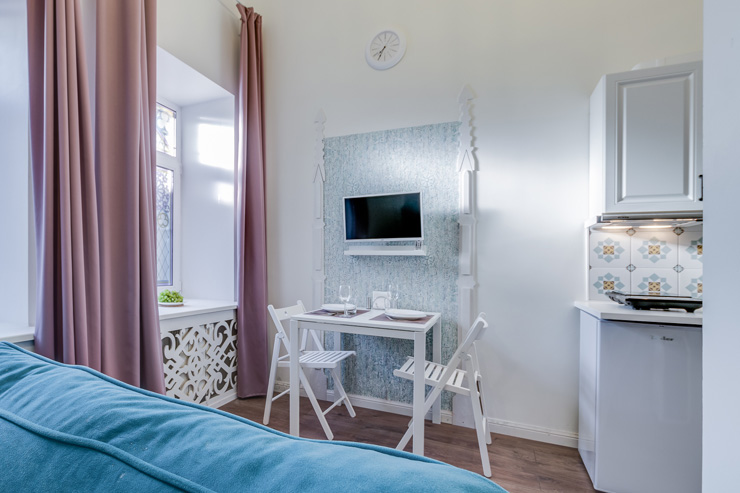 В номере: вешалка, зеркало, кресло-кровать, матрас, стол, стулья, мини-холодильник, набор посуды, плита электрическая, телевизор, электрочайник