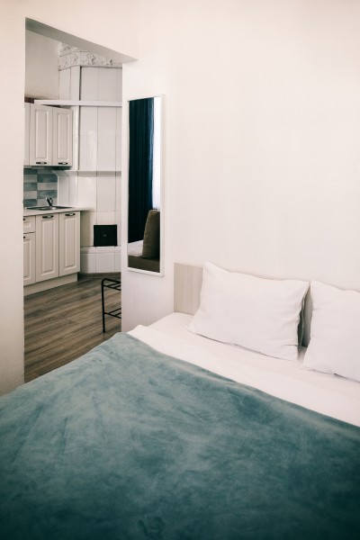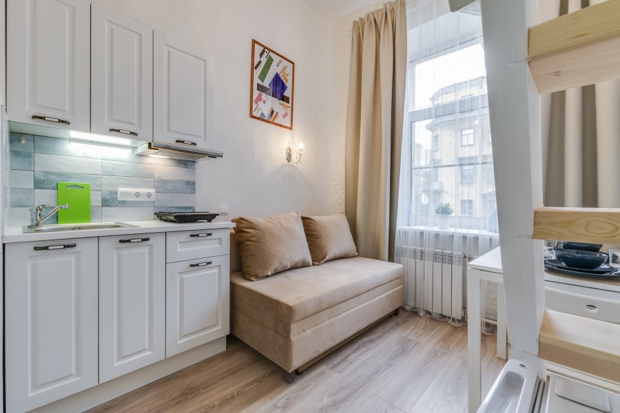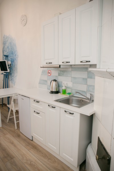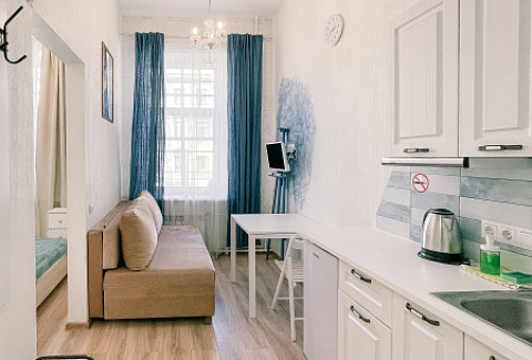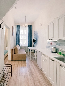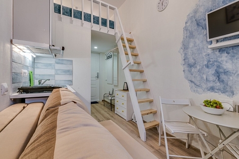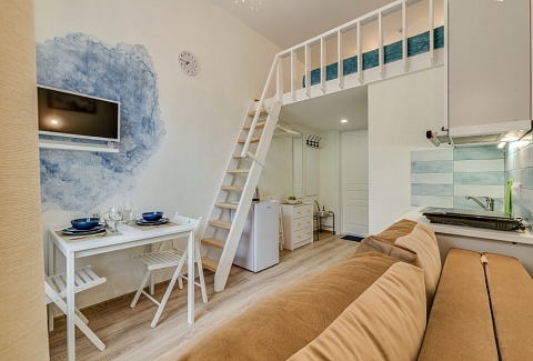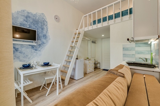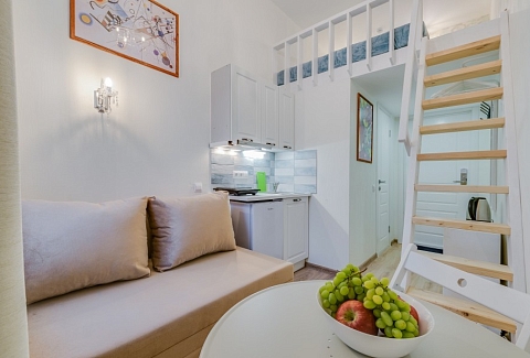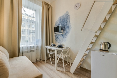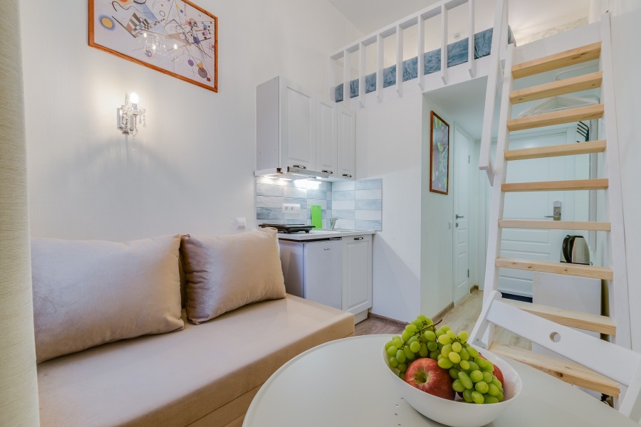 При входе вы встретите мольберты, картины и другие атрибуты художественного быта. Интерьеры каждой студии погружают в креативную обстановку: вы увидите работы авангардистов и абстрактные изображения, а в некоторых комнатах подставки для телевизоров выполнены в виде мольбертов. Особая деталь – реставрированная старая печь, сохранившаяся в одной из студий.«Мольберт» предлагает шесть двухуровневых студий, где на первом этаже находятся кухня, гостиная и ванная комната с душем. На втором – уединенная спальня с большой кроватью. Мини-кухня оснащена всем необходимым для комфортного приготовления пищи, а в гостиной есть удобные диван и кресла, которые могут дополнительно раскладываться. В ванной комнате доступны косметические принадлежности и свежие полотенца. Общее пространство включает стиральную машину, гладильные принадлежности и кофеварку, а Wi-Fi доступен во всех зонах. Апартаменты находятся всего в пяти шагах от метро, что делает их удобным местом для знакомства с культурой Санкт-Петербурга.