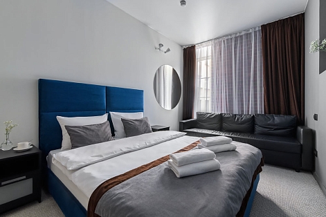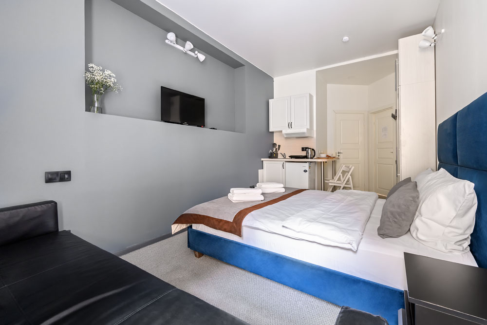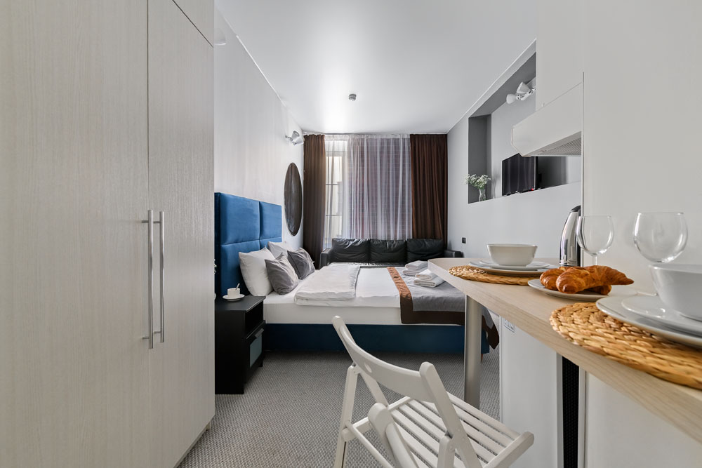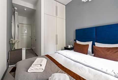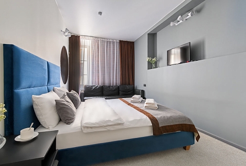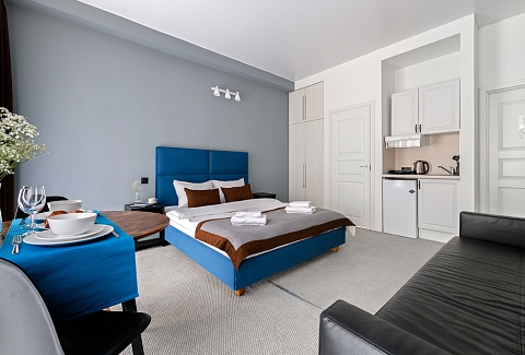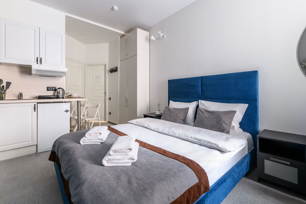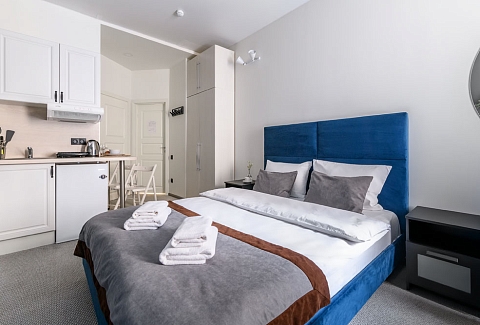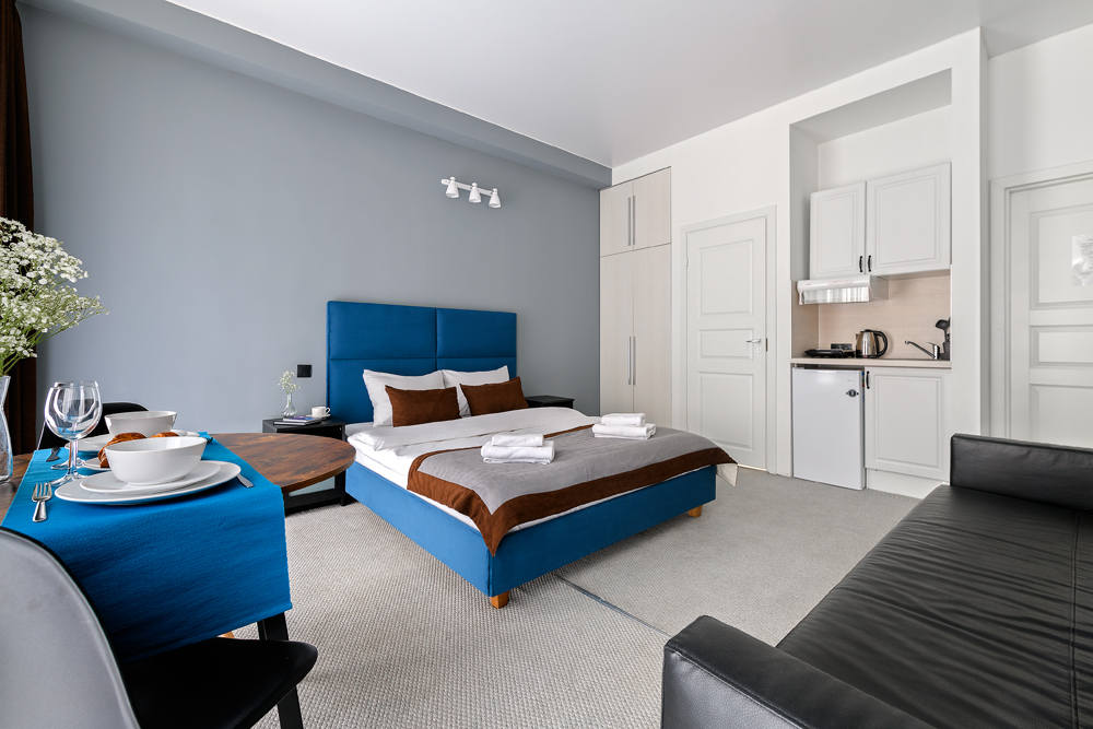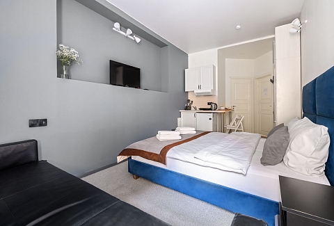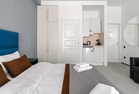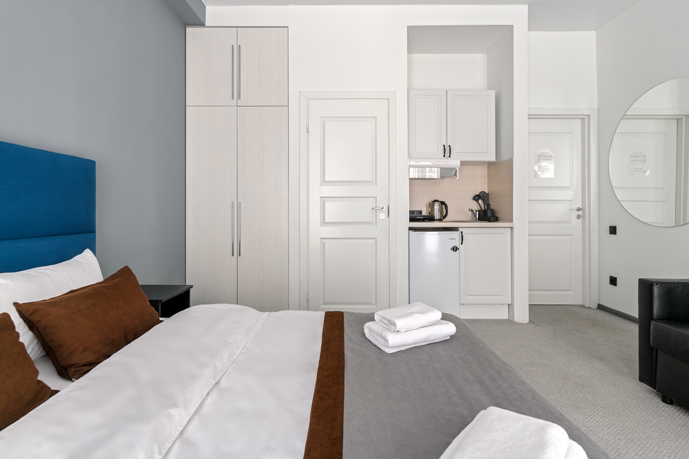 В номере: вешалка, диван, зеркало, кровать двуспальная, кухонная мебель, прикроватные тумбочки, стол, стул, шкаф, мини-холодильник, набор посуды, плита электрическая, телевизор, электрочайник