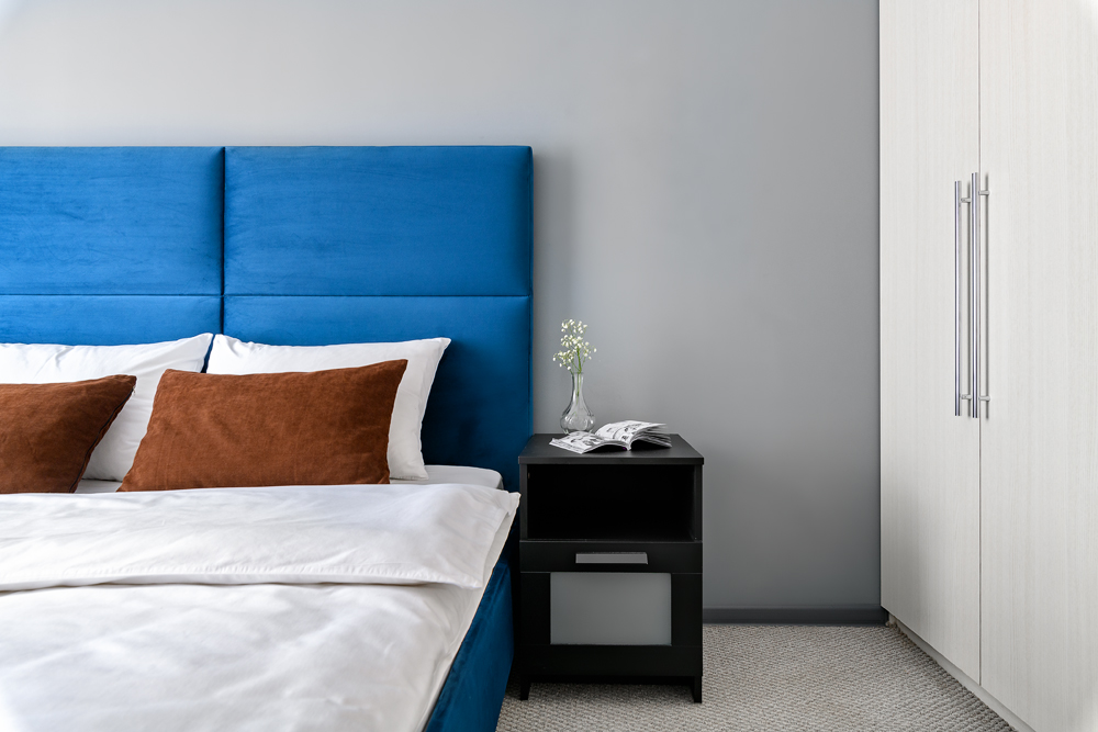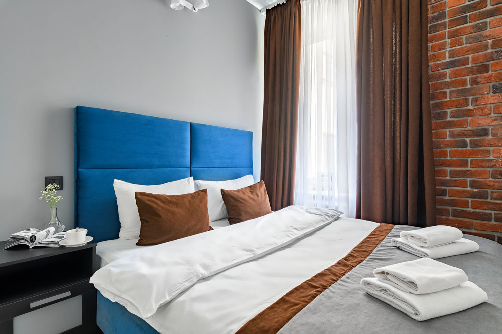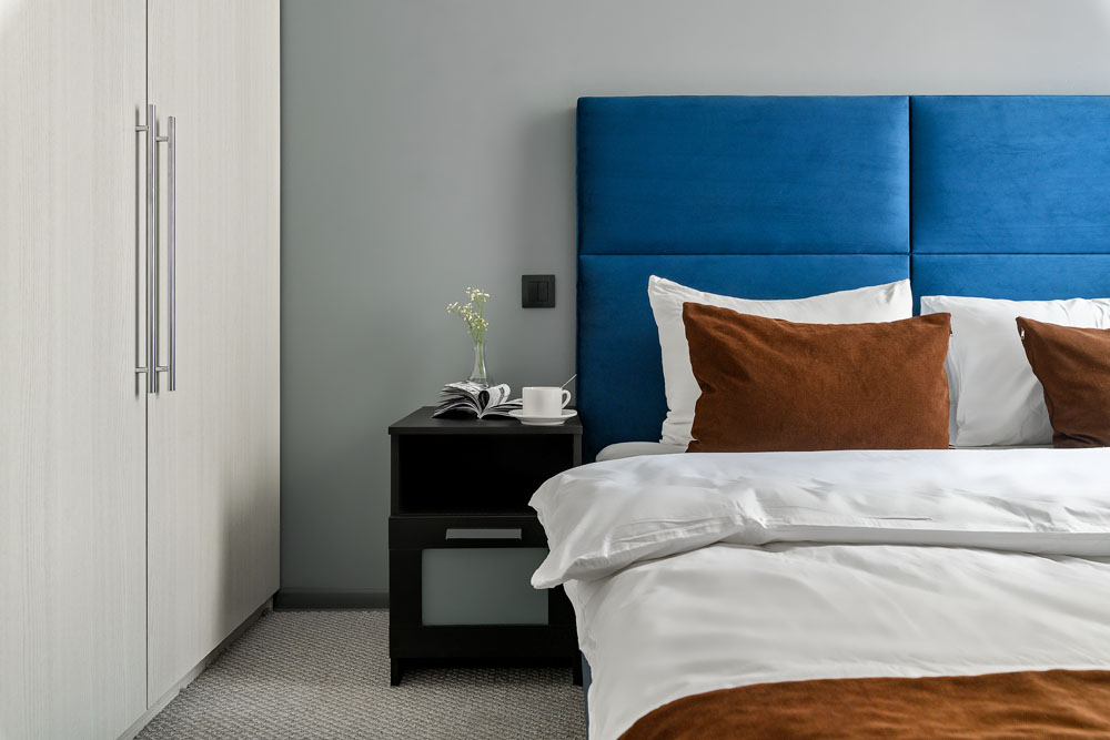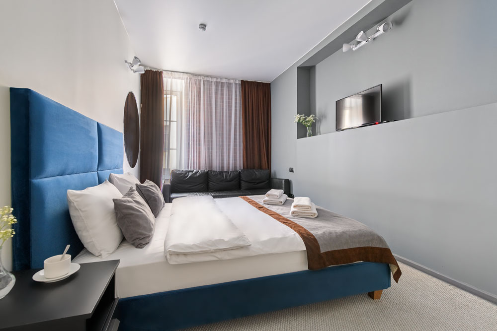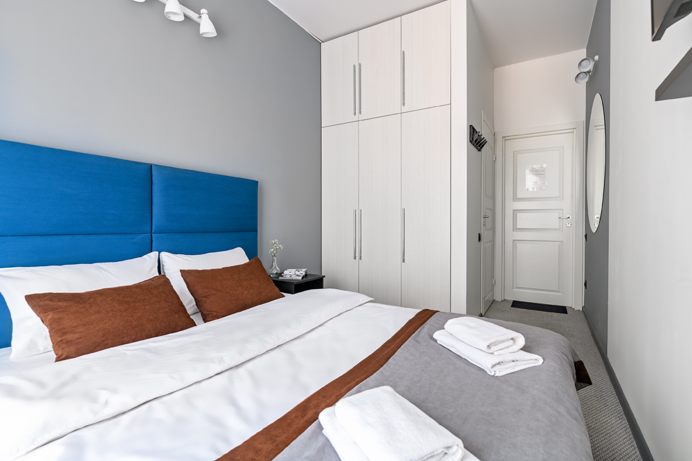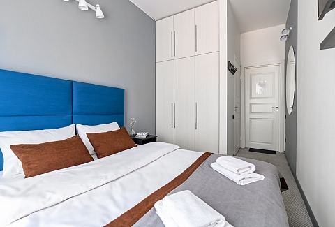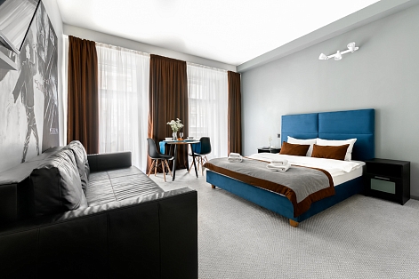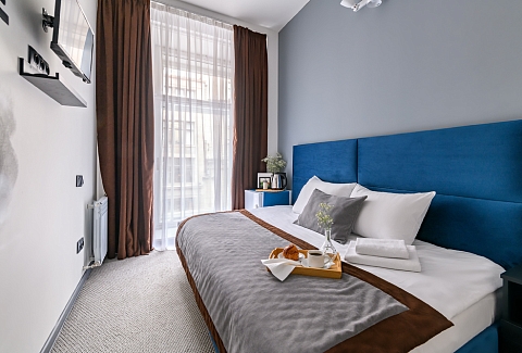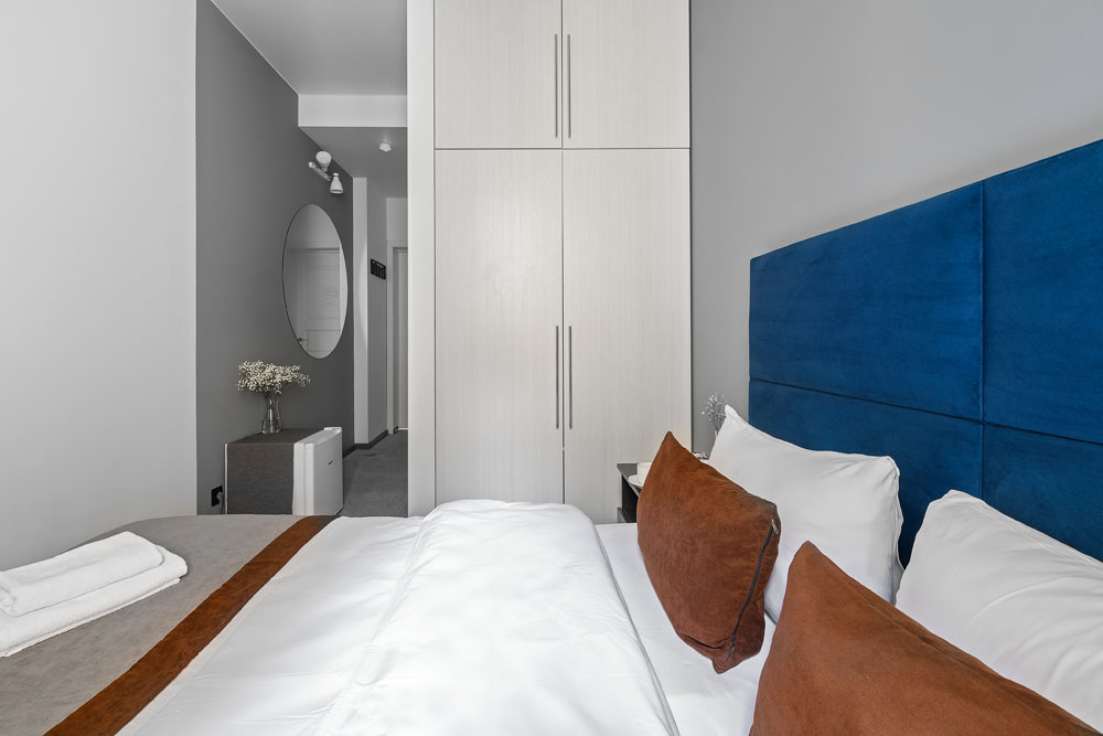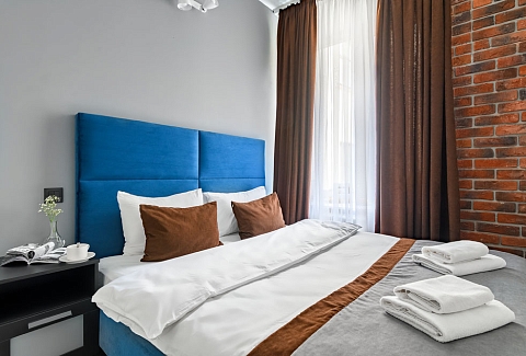 В номере: вешалка, диван, зеркало, кровать двуспальная, кухонная мебель, прикроватные тумбочки, стол, стул, шкаф, мини-холодильник, набор посуды, плита электрическая, телевизор, электрочайник