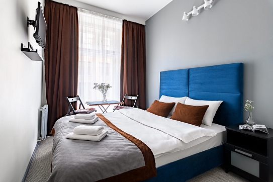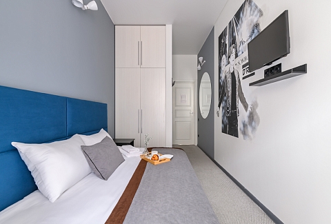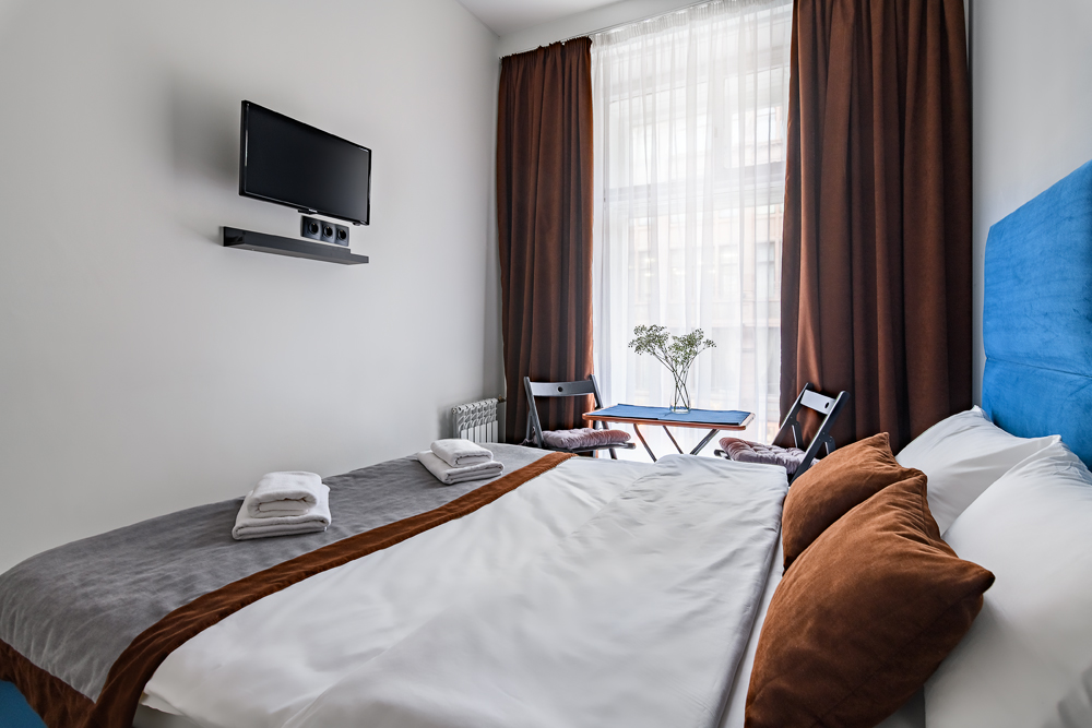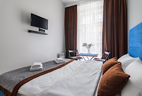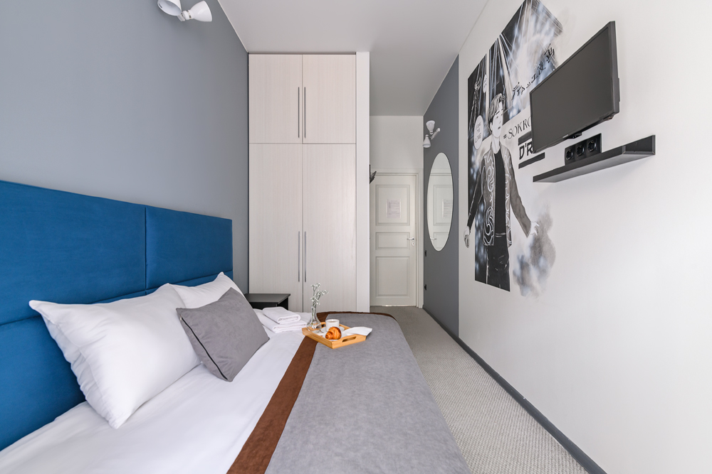 В номере: вешалка, зеркало, кровать полутороспальная, прикроватная тумбочка, стол, стул, шкаф, мини-холодильник, телевизор, чайный набор посуды, электрочайник