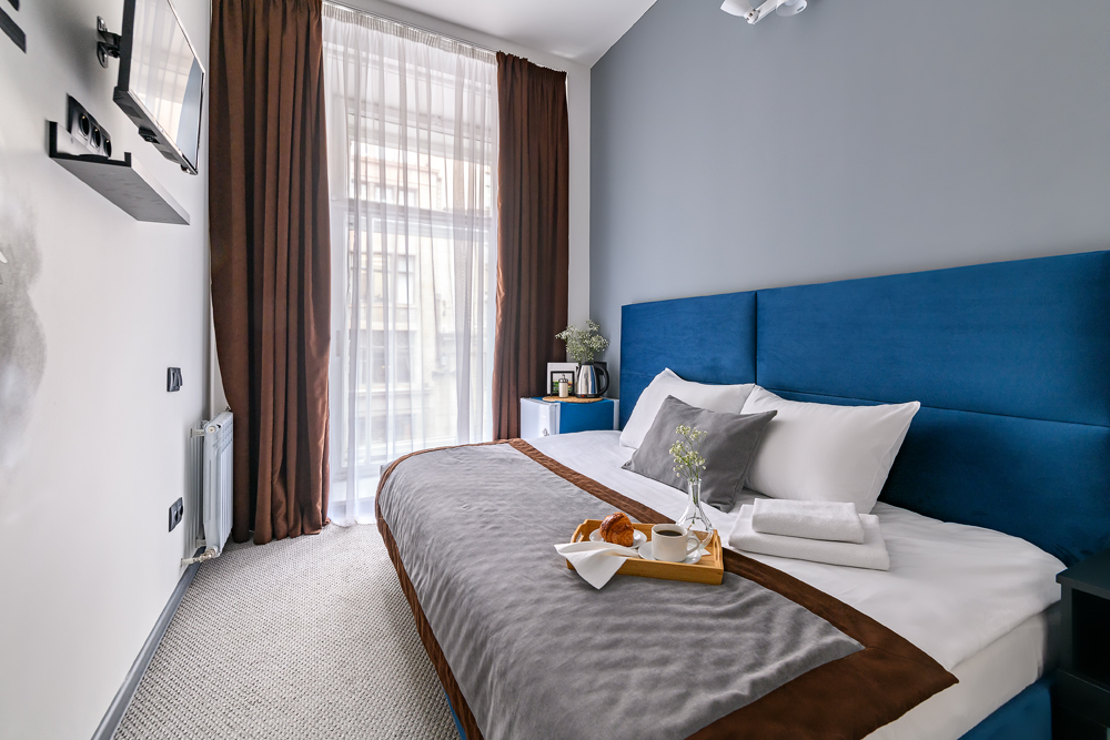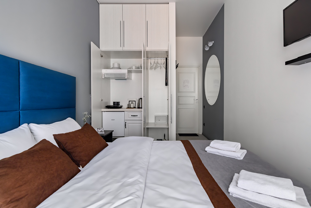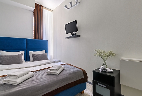 В номере: вешалка, зеркало, кровать двуспальная, прикроватные тумбочки, шкаф, мини-холодильник, телевизор, чайный набор посуды, электрочайник