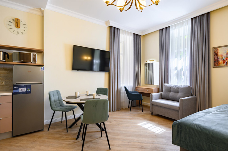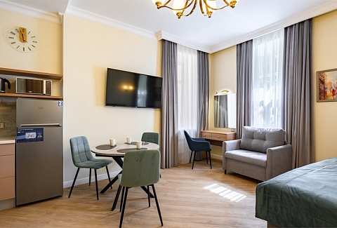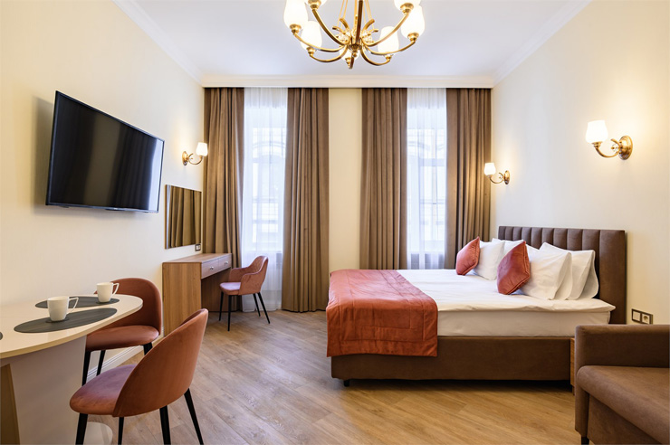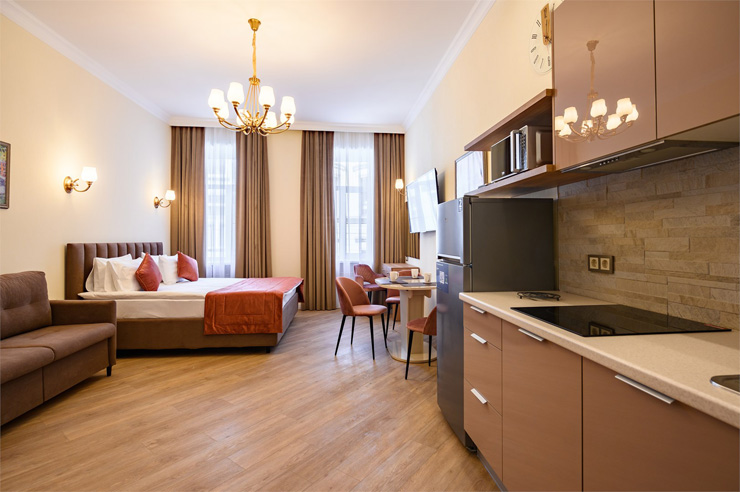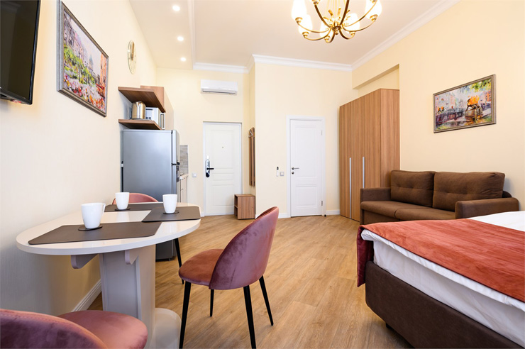 Все категории рассчитаны на проживание 4 гостей: в качестве спальных мест предусмотрены большая кровать и раскладной диван. Апартаменты оснащены мини-кухней, обеденным пространством, ванной комнатой. Во всей сети предусмотрен доступ к Wi-Fi. Возможно заселение с питомцем средней породы.Просим обратить внимание, курение запрещено на всей территории.