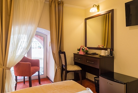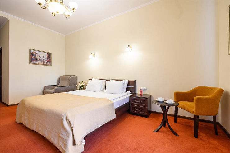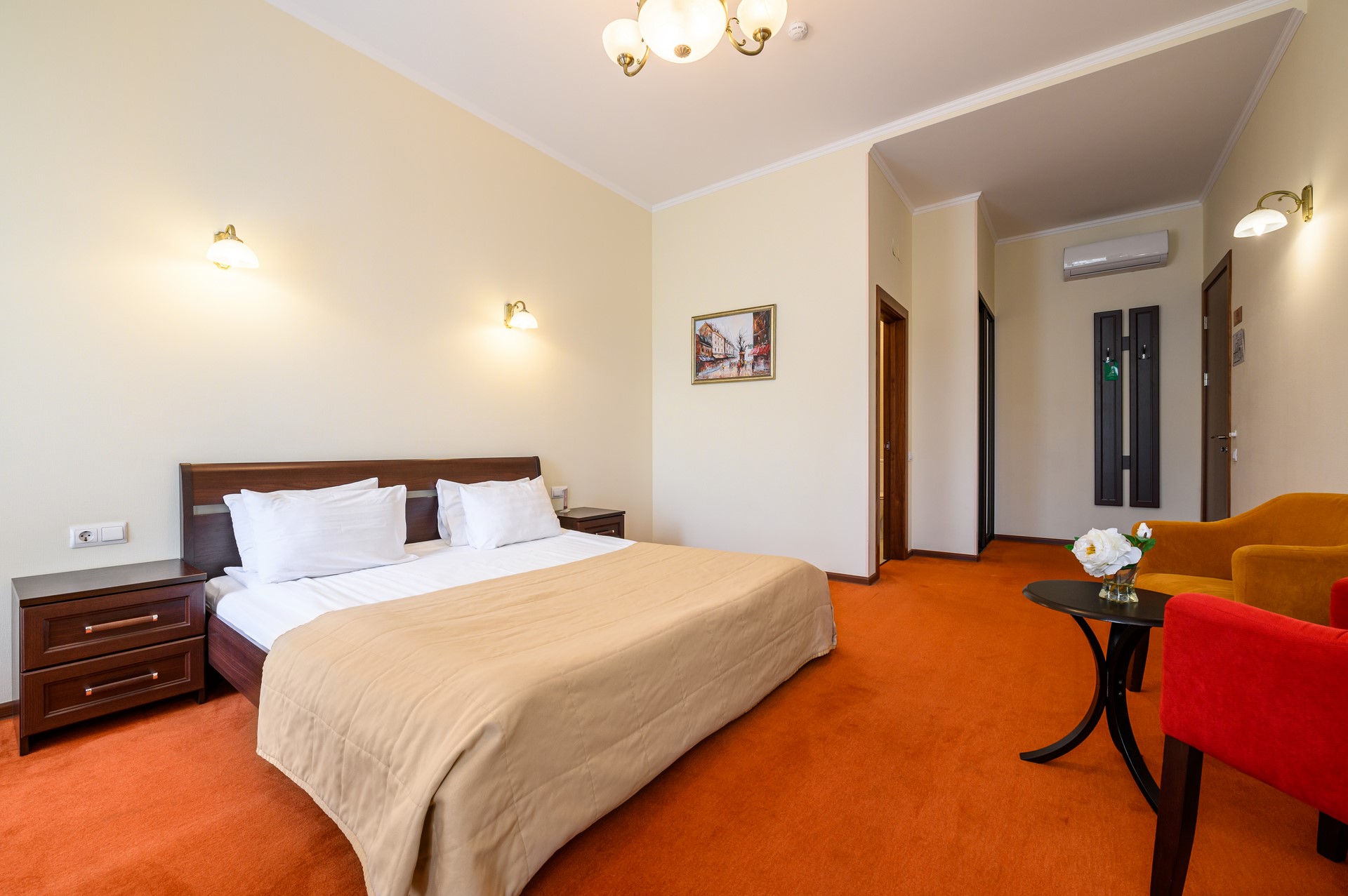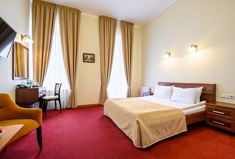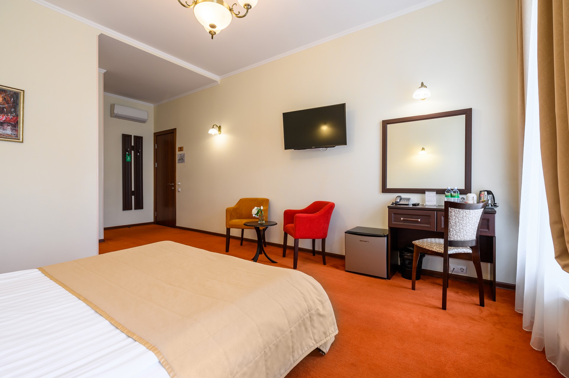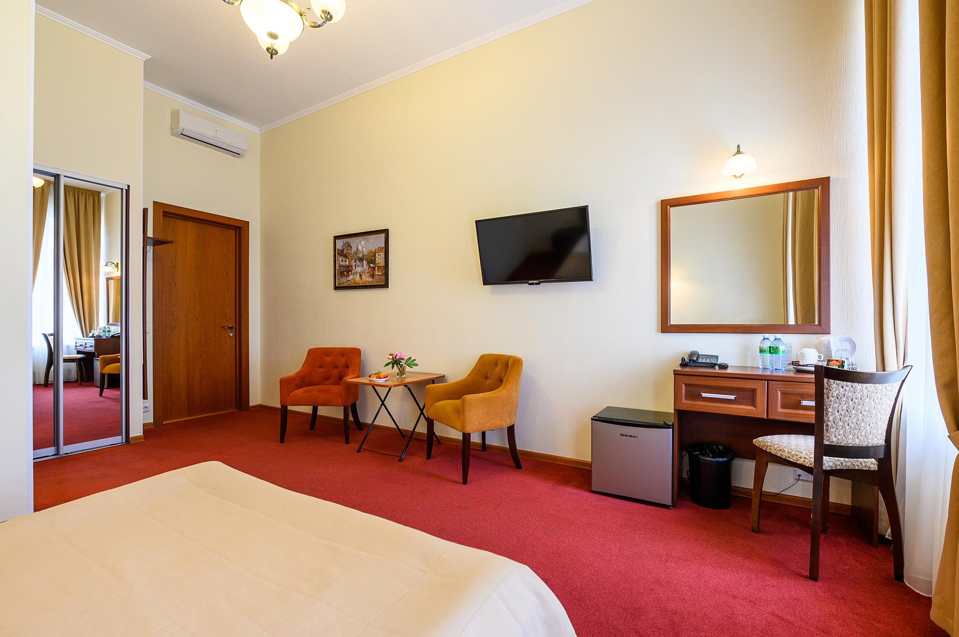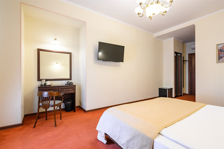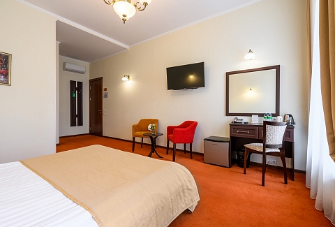 В номере: вешалка, зеркало, кресло, кресло-кровать, кровать двуспальная, прикроватные тумбочки, стол, столик туалетный, стул, шкаф, гладильная доска, мини-холодильник, сейф, телевизор, утюг, чайная станция, чайный набор посуды