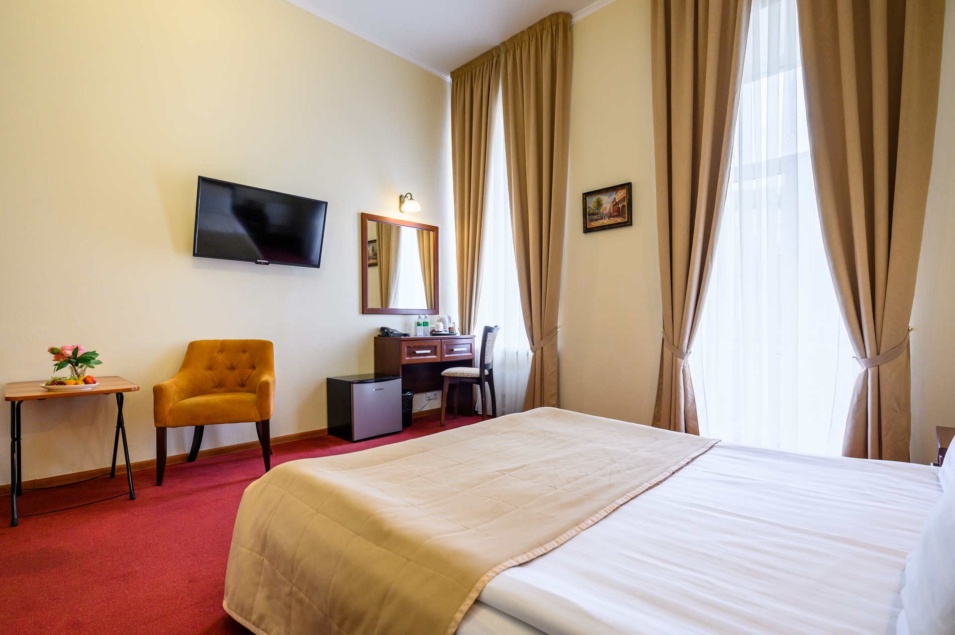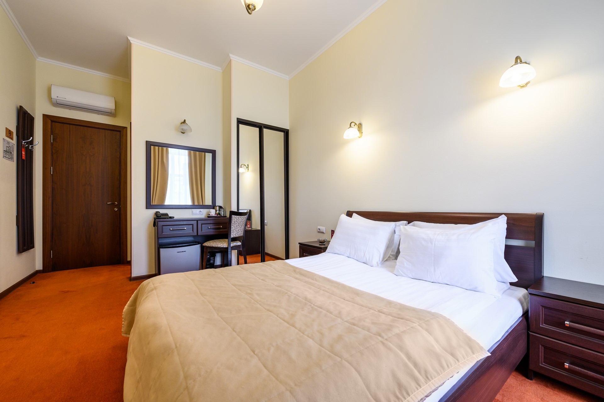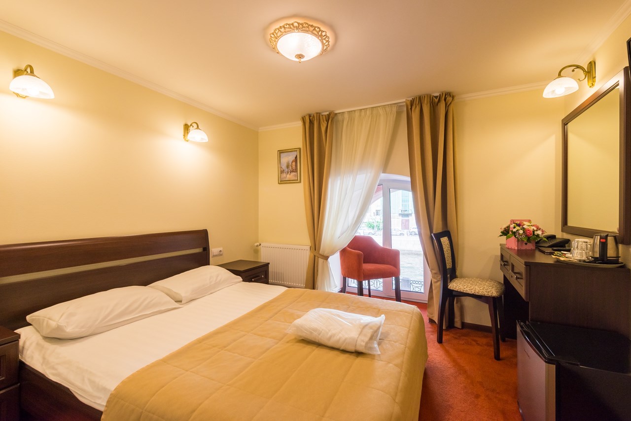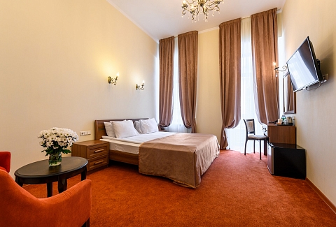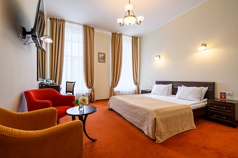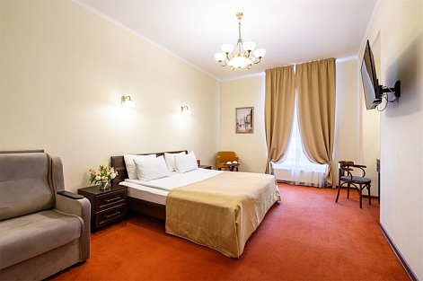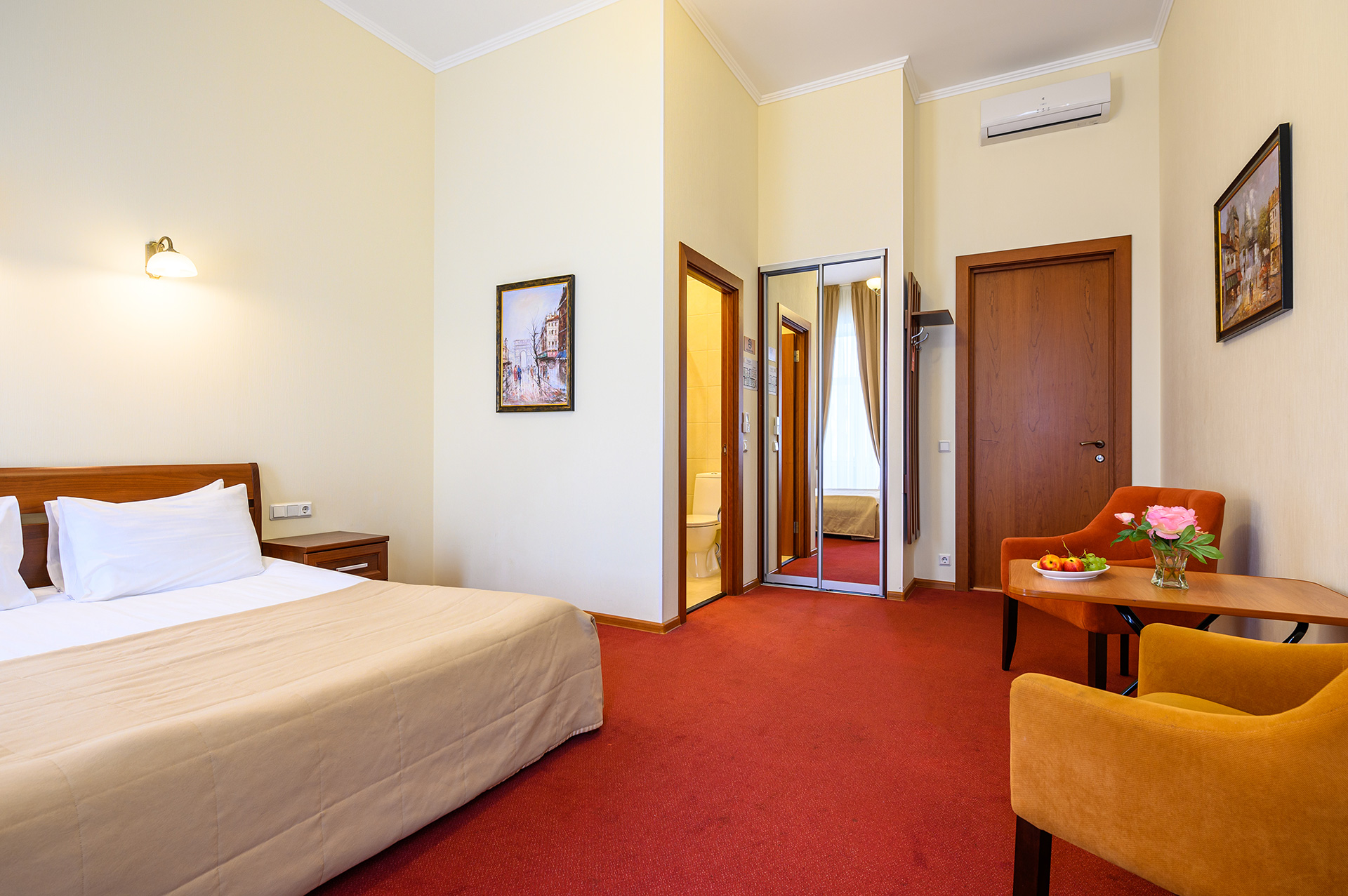 В номере: вешалка, зеркало, кресло, кресло-кровать, кровать двуспальная, прикроватные тумбочки, стол, столик туалетный, стул, шкаф, гладильная доска, мини-холодильник, сейф, телевизор, утюг, чайная станция, чайный набор посуды