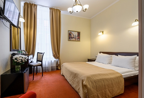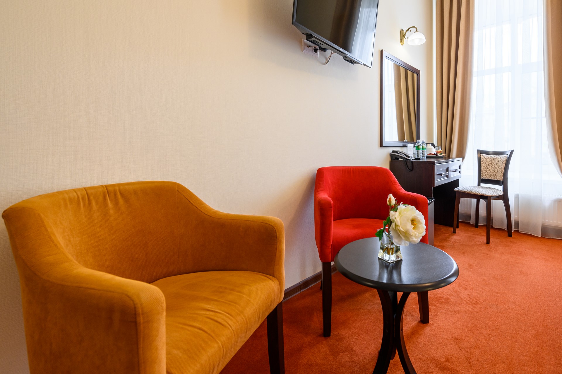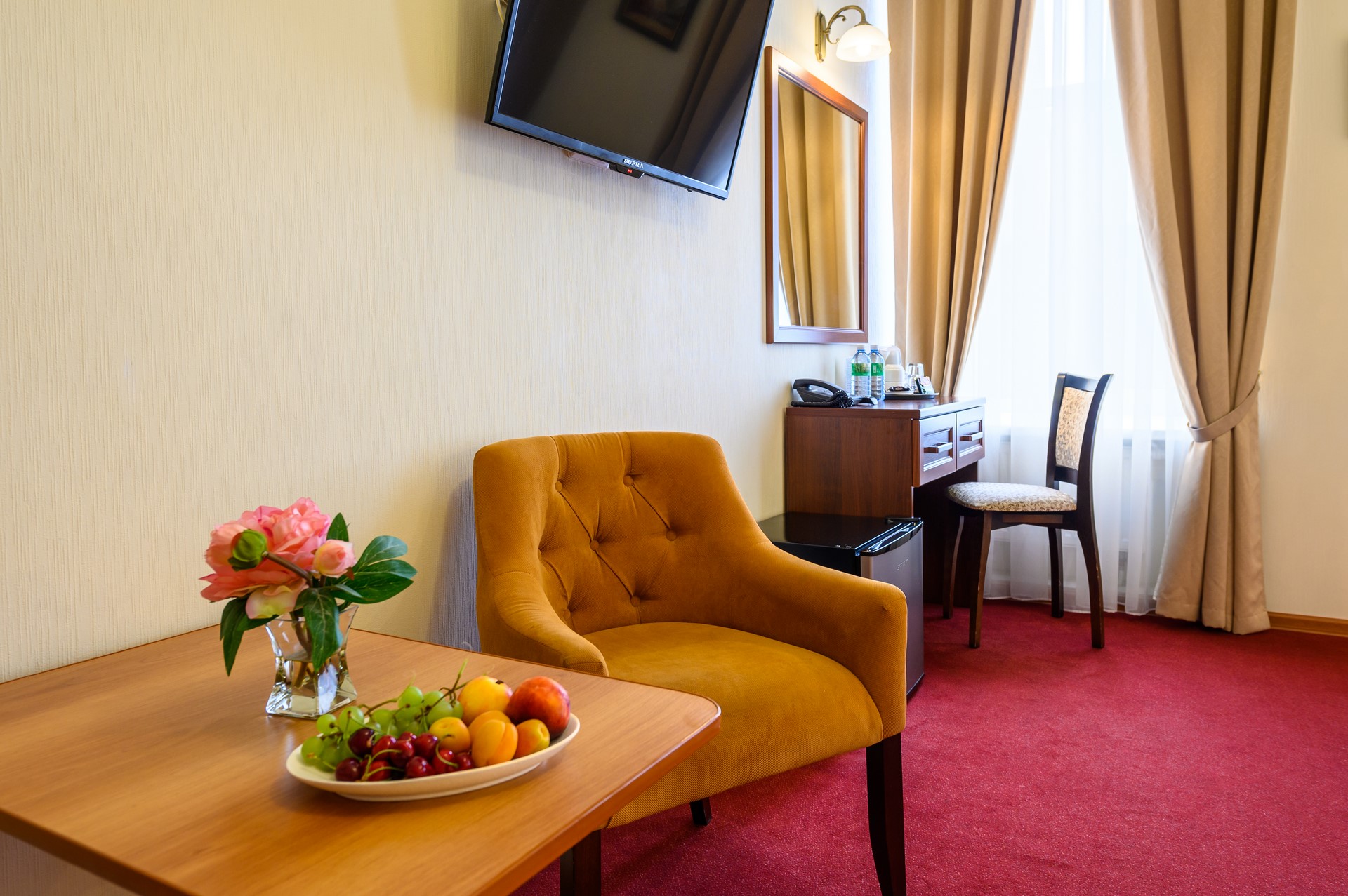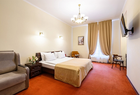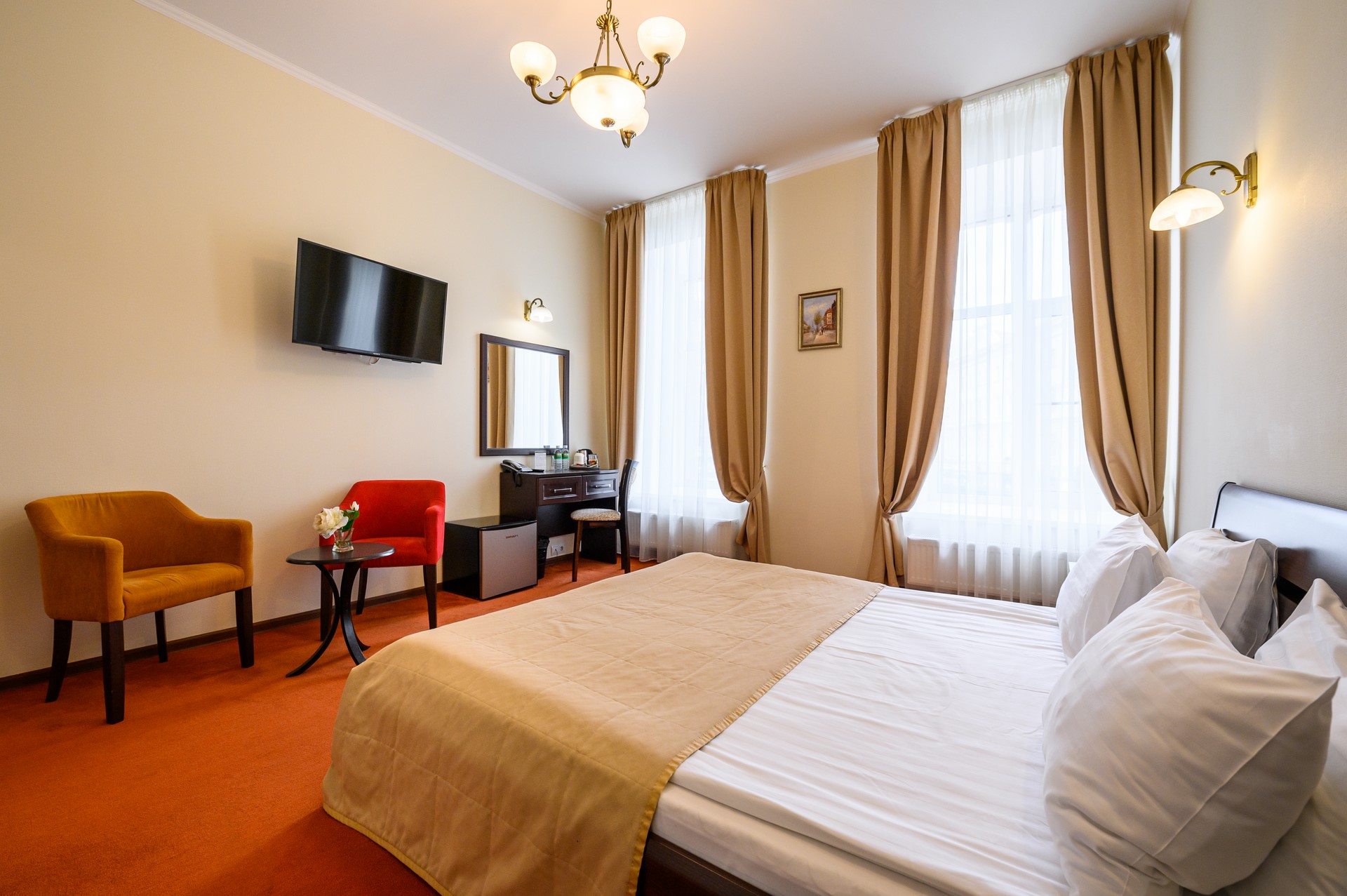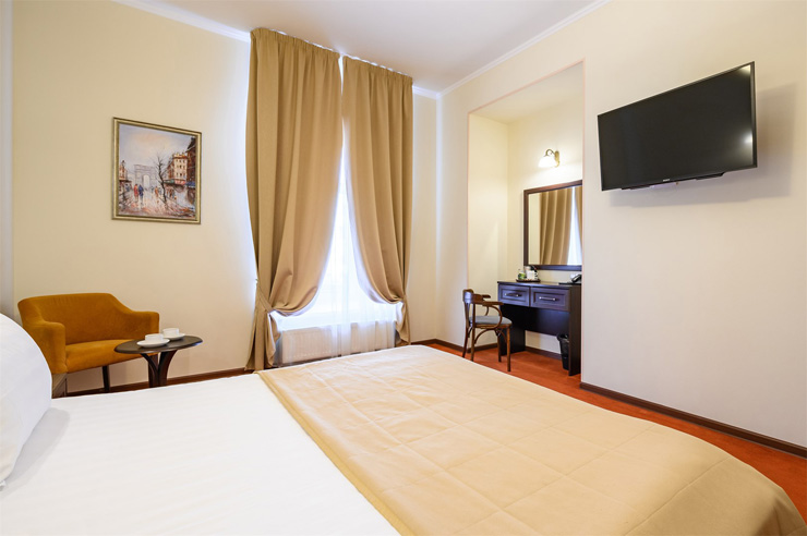 В номере: вешалка, зеркало, кресло, кресло-кровать, кровать двуспальная, прикроватные тумбочки, стол, столик туалетный, стул, шкаф, гладильная доска, мини-холодильник, сейф, телевизор, утюг, чайная станция, чайный набор посуды