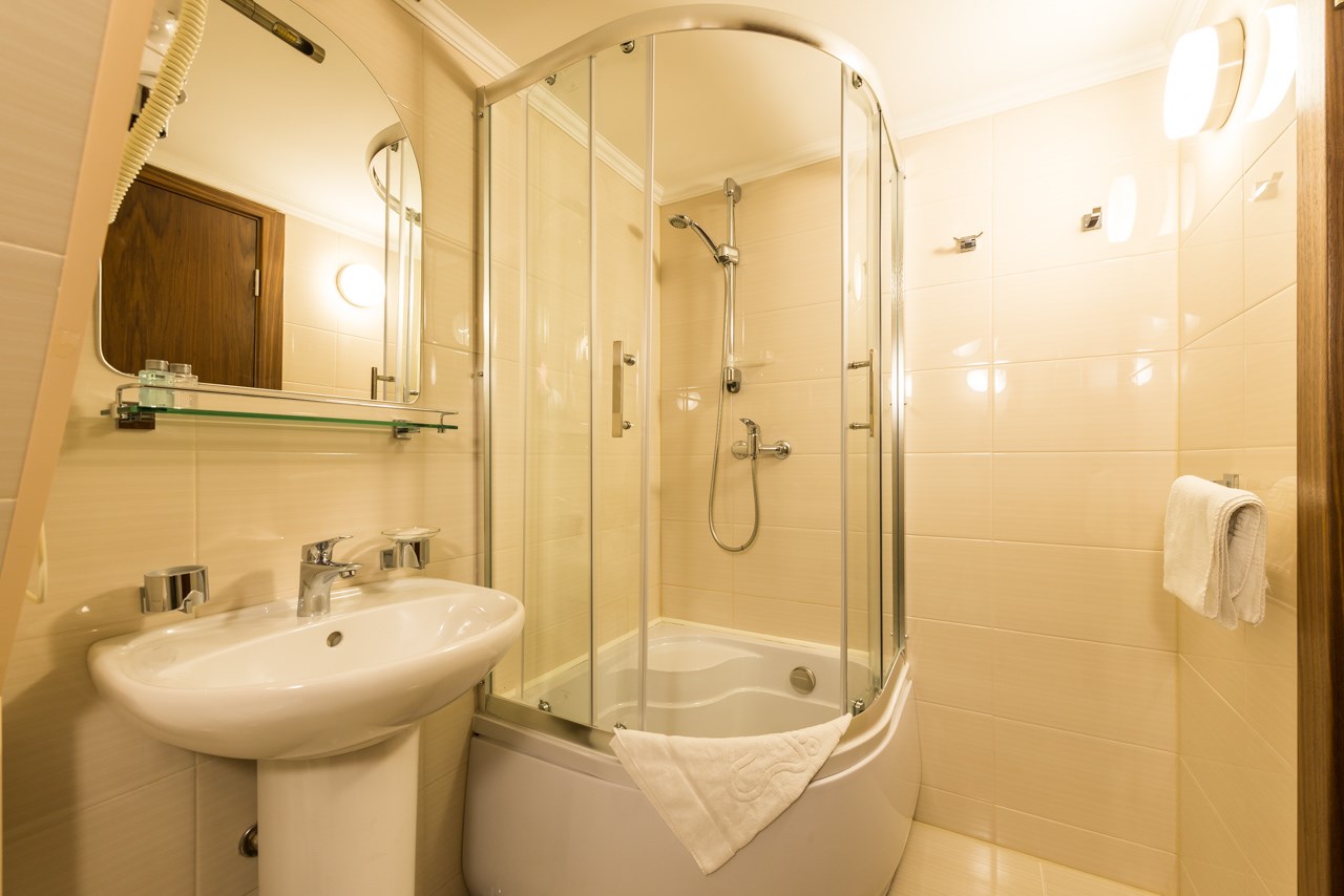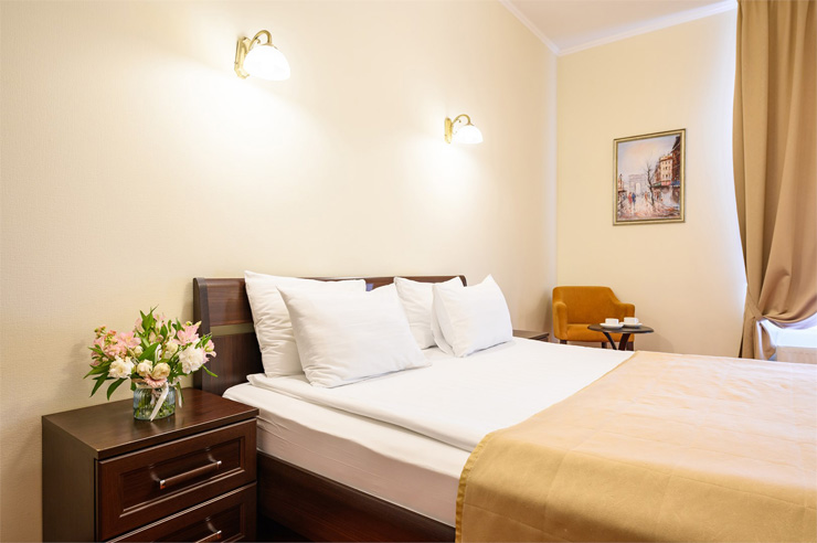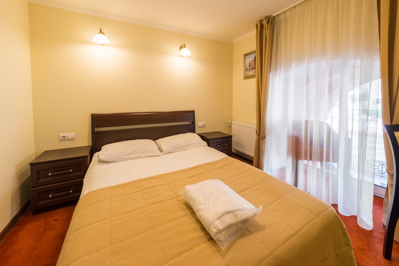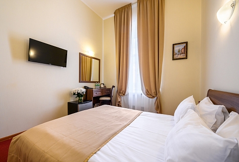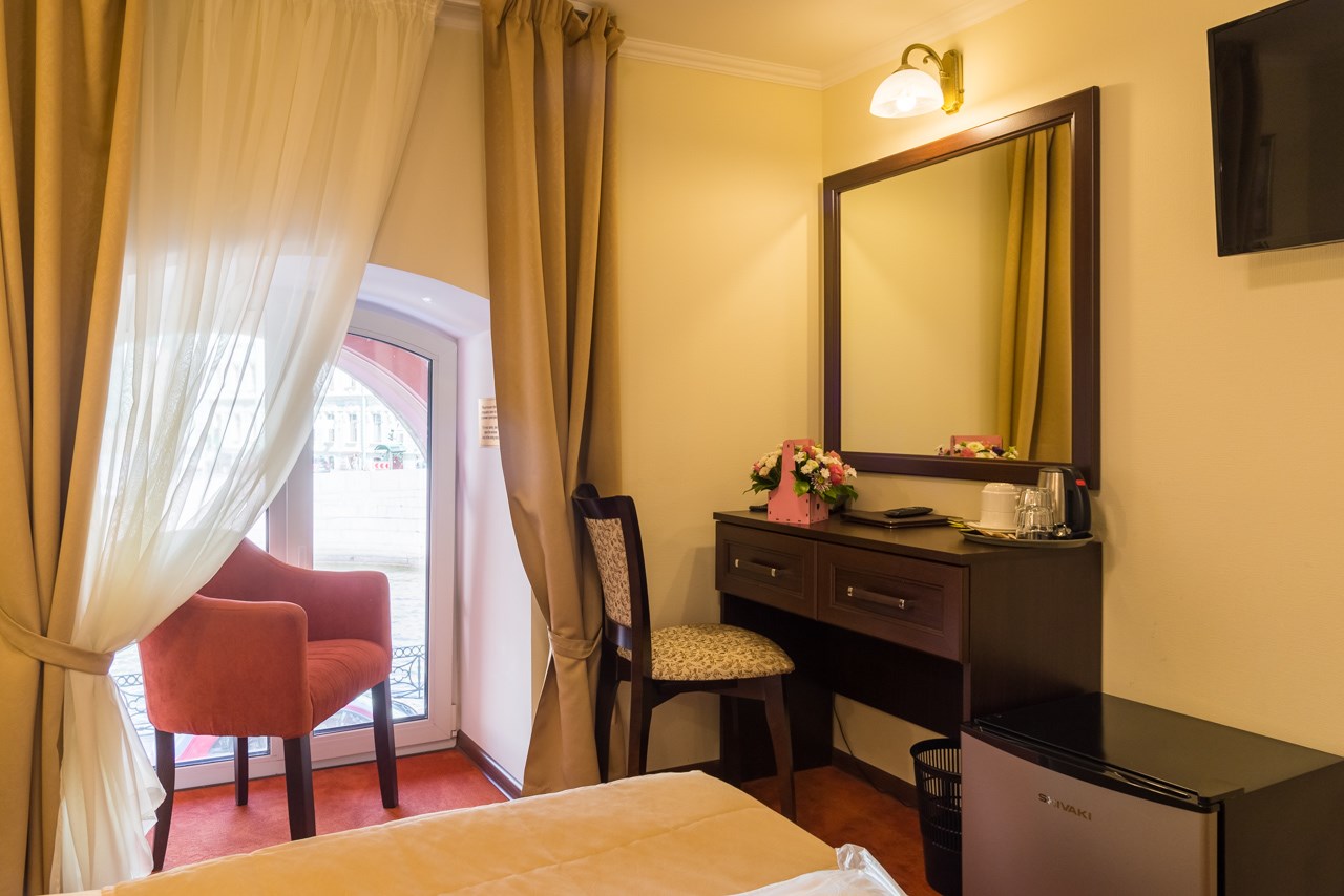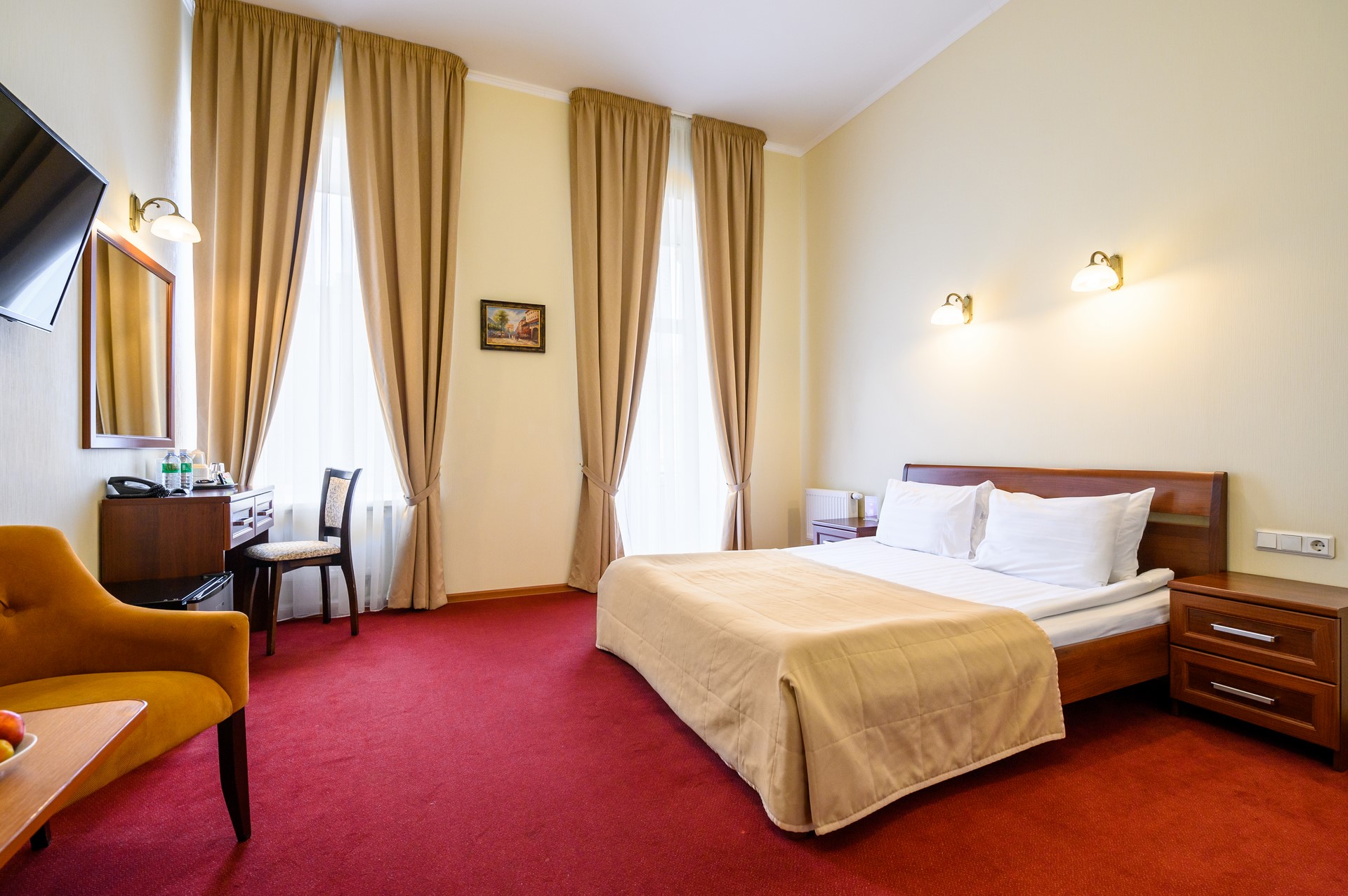 В номере: вешалка, зеркало, кресло, кресло-кровать, кровать двуспальная, прикроватные тумбочки, стол, столик туалетный, стул, шкаф, гладильная доска, мини-холодильник, сейф, телевизор, утюг, чайная станция, чайный набор посуды