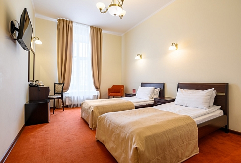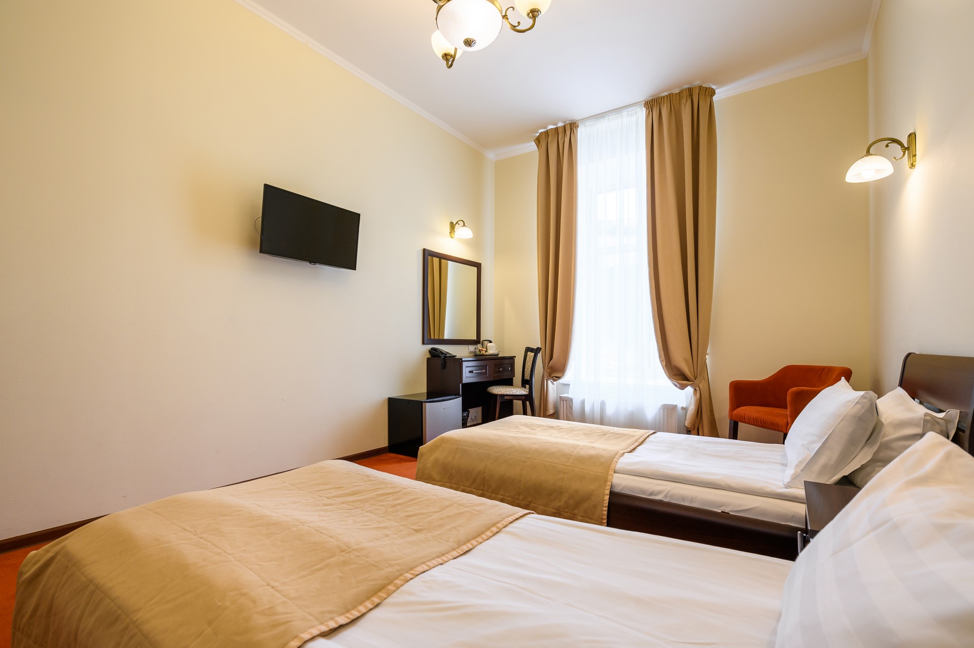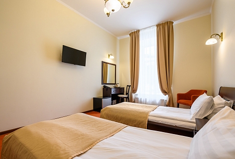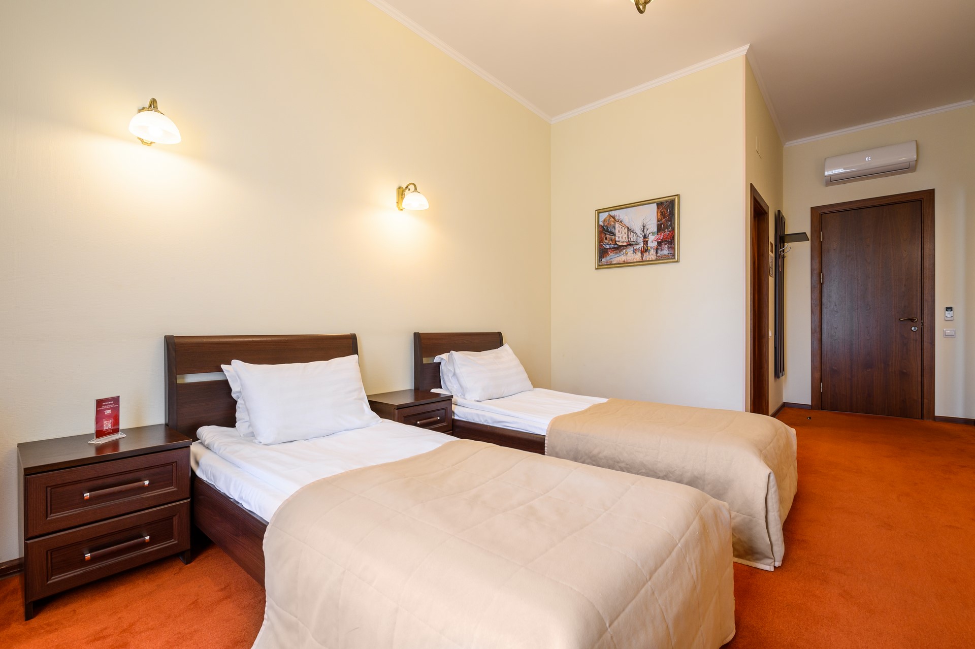 В номере: вешалка, зеркало, кровати односпальные, прикроватные тумбочки, стол, стулья, шкаф, вентилятор, мини-холодильник, набор посуды, телевизор