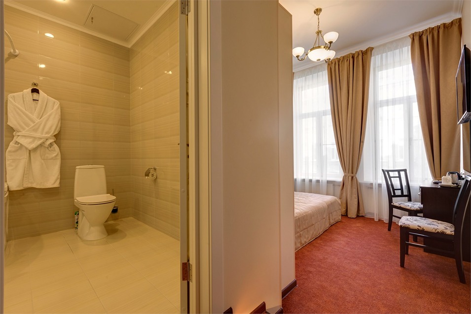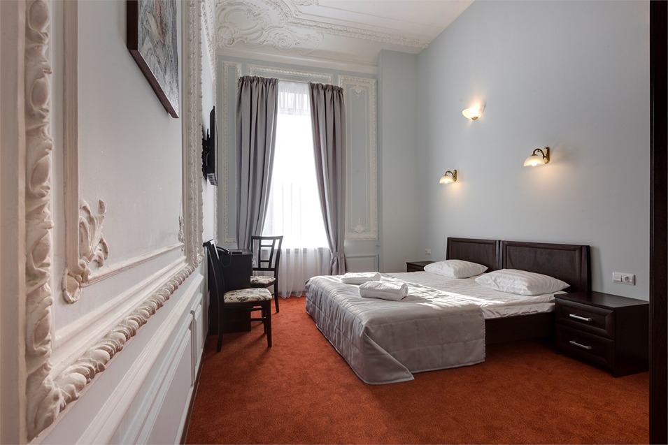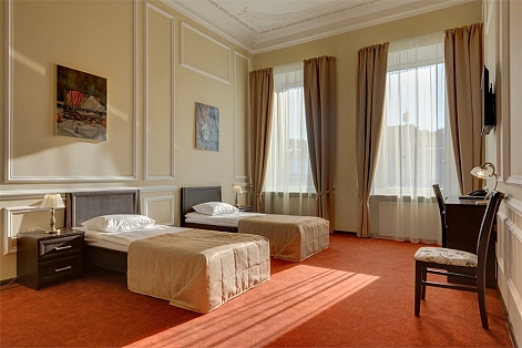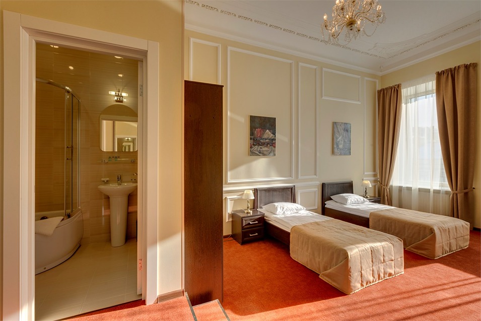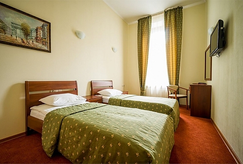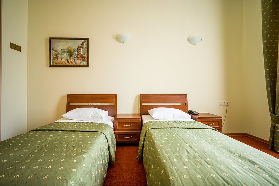 В номере: вешалка, зеркало, кровати односпальные, прикроватные тумбочки, стол, стулья, шкаф, кофемашина, мини-холодильник, сейф, телевизор, утюг, чайная станция