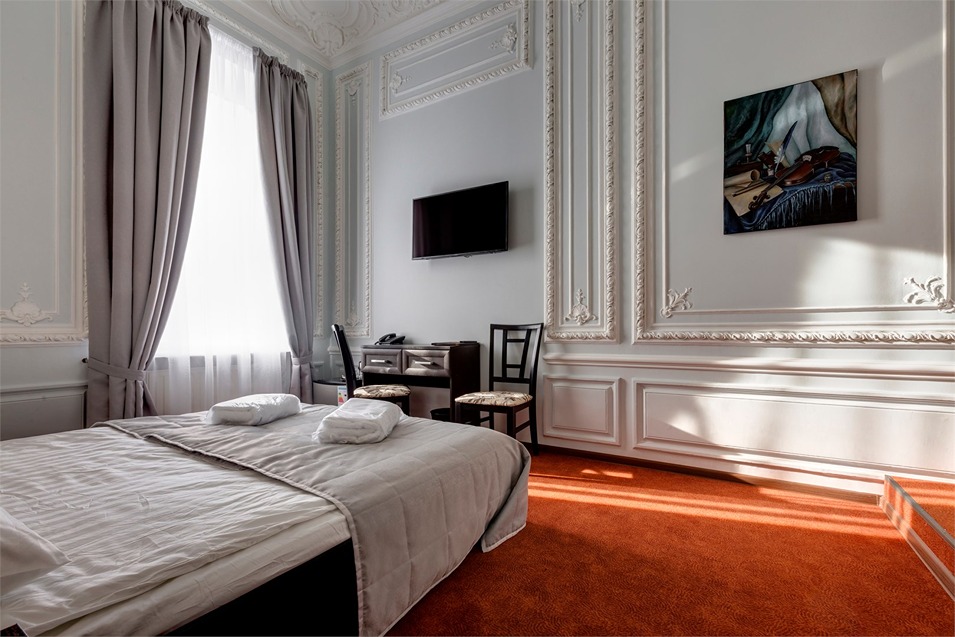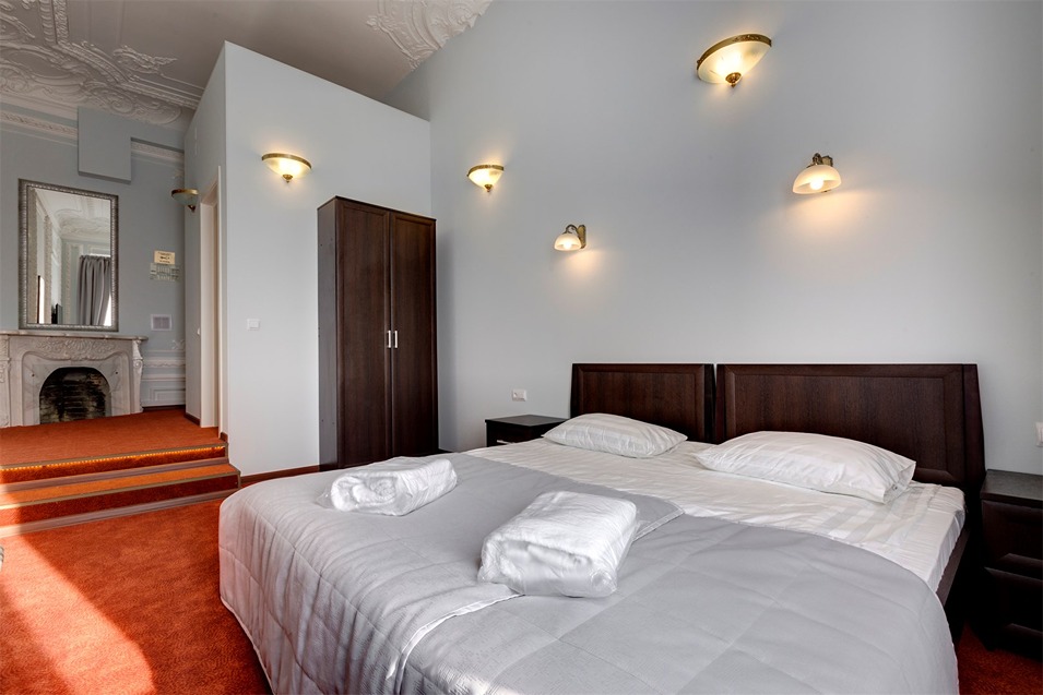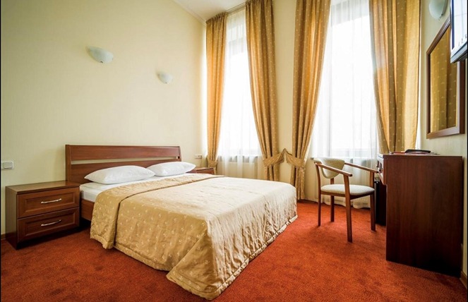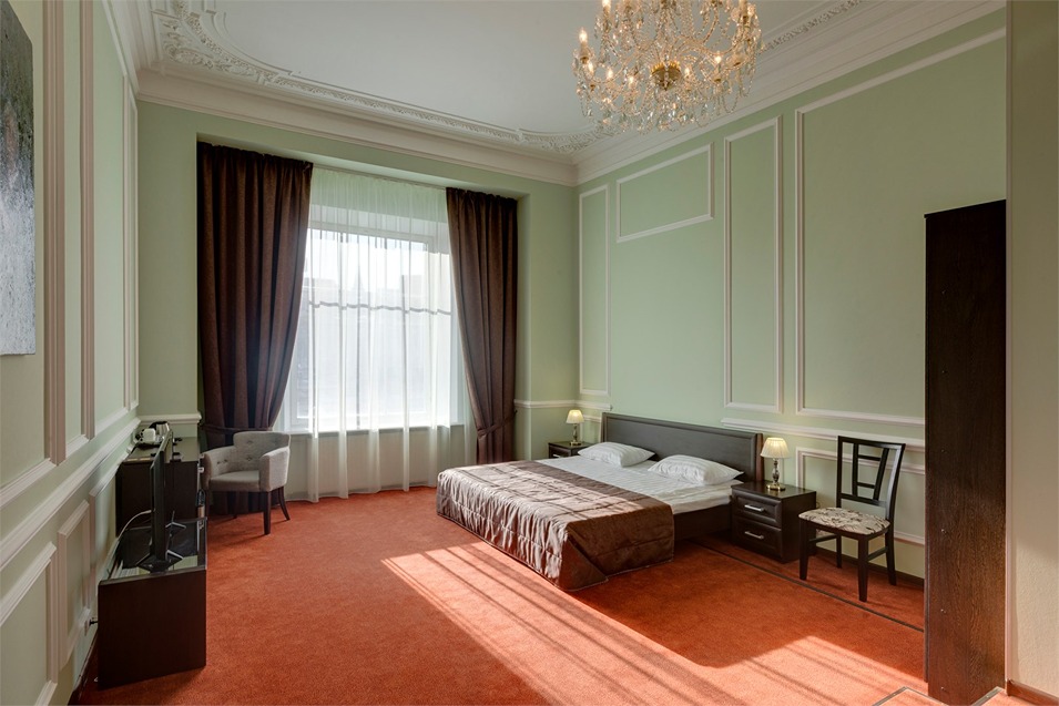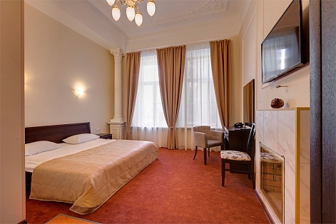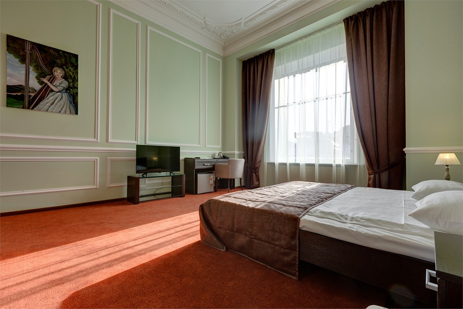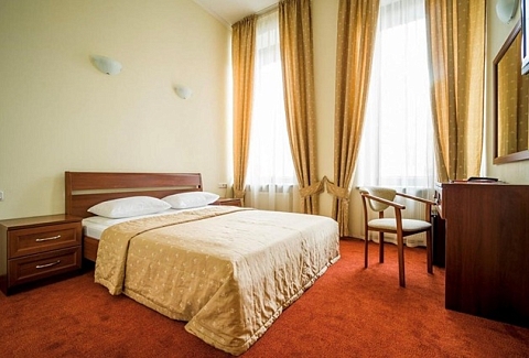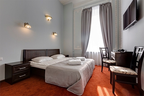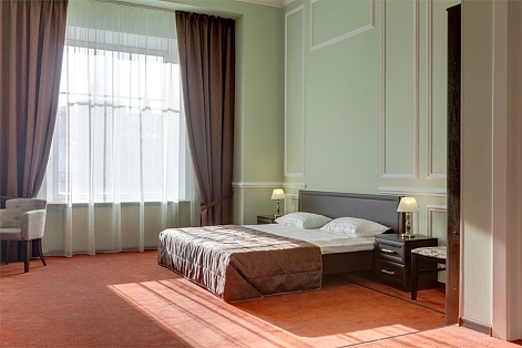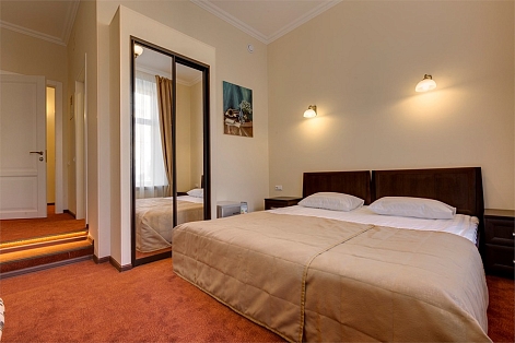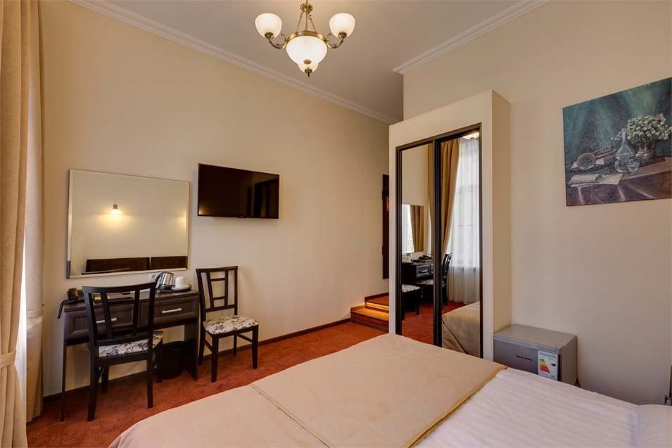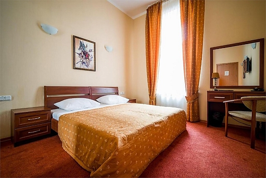 В номере: вешалка, зеркало, кресло-кровать, кровати односпальные /одна двуспальная кровать, прикроватные тумбочки, стол, стулья, шкаф, мини-холодильник, сейф, телевизор, утюг, чайная станция