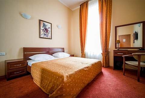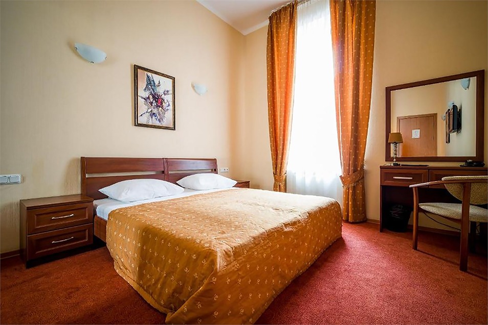 В номере: вешалка, зеркало, кресло-кровать, кровать двуспальная, прикроватные тумбочки, стол, стулья, шкаф, мини-холодильник, сейф, телевизор, утюг, чайная станция