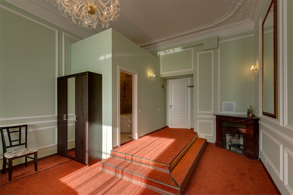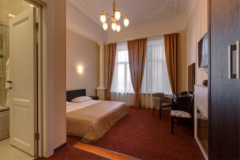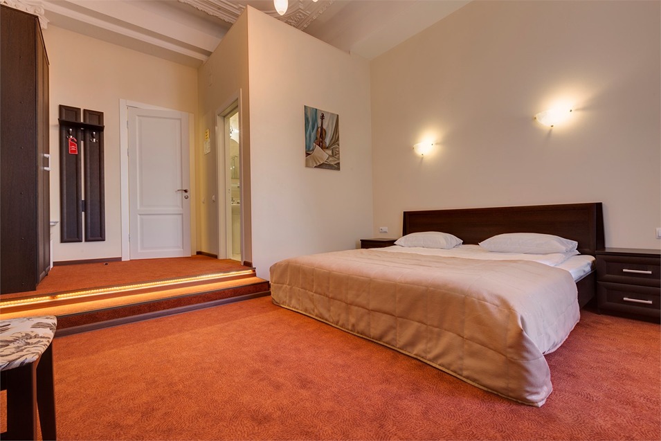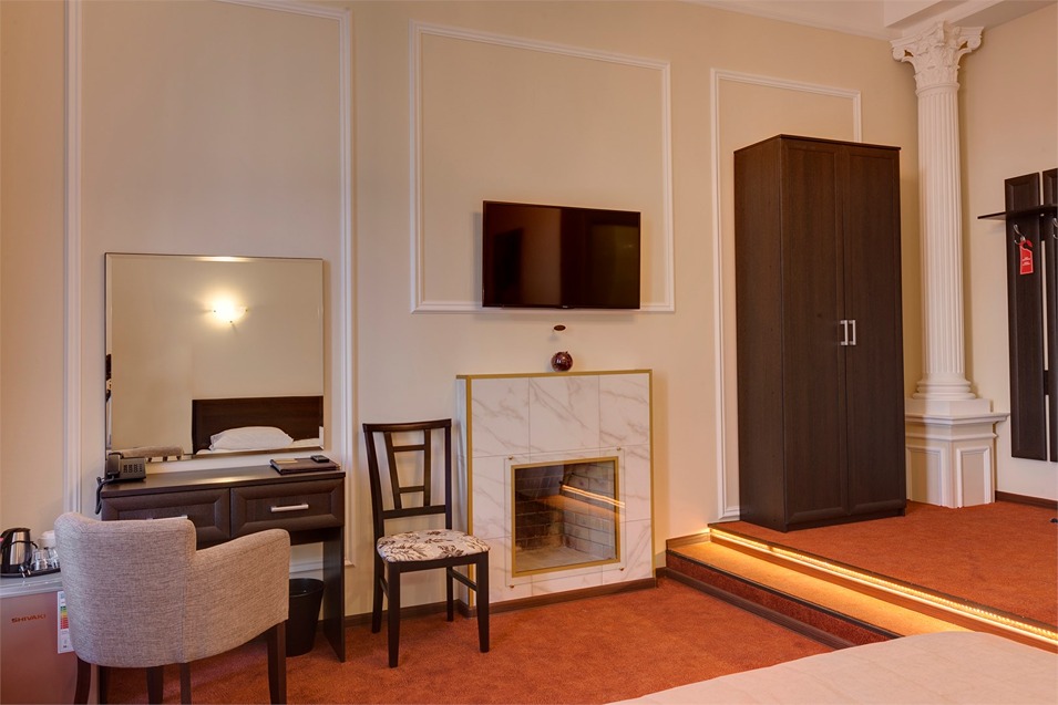 В номере: вешалка, зеркало, кровать двуспальная, прикроватные тумбочки, стол, стулья, шкаф, кофемашина, мини-холодильник, сейф, телевизор, утюг, чайная станция