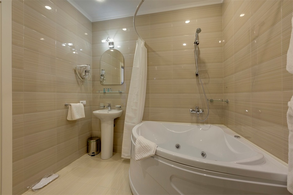 Санузел: с ванной или душевой кабиной, тапочки, туалетные принадлежности, фен