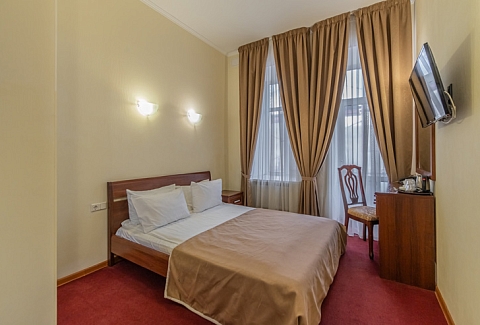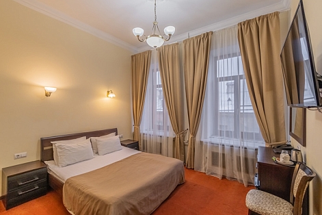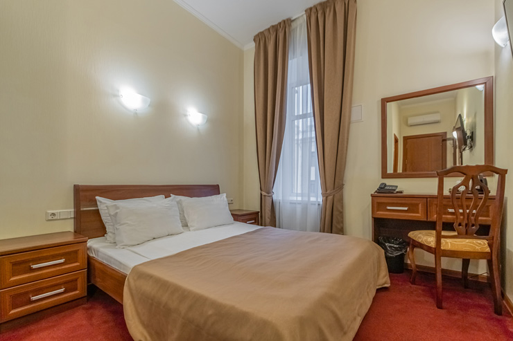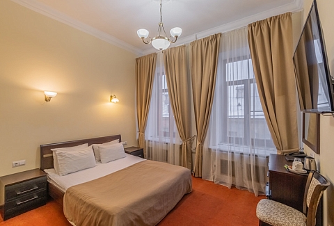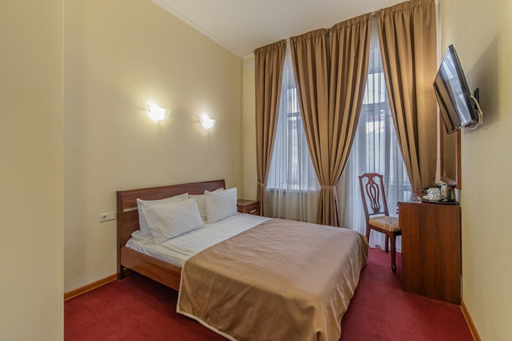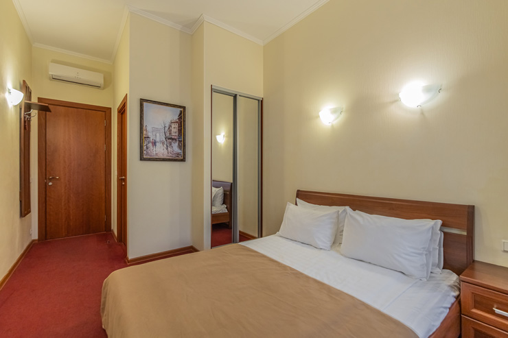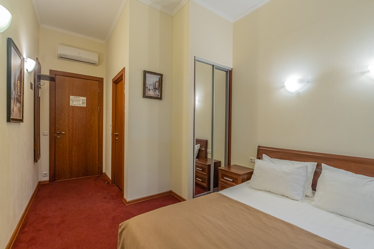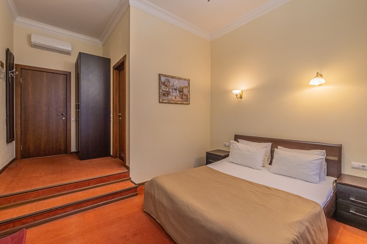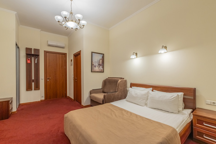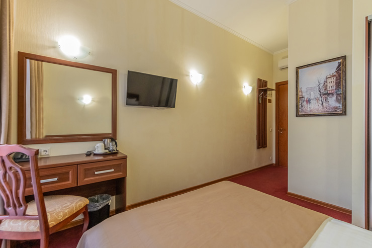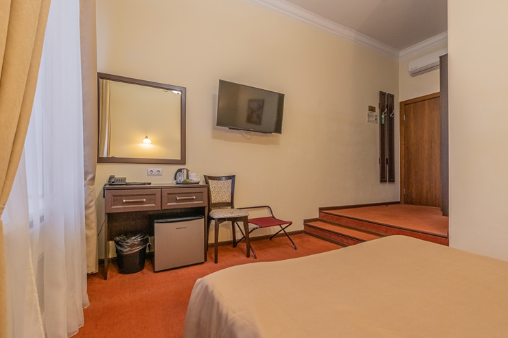 В номере: вешалка, зеркало, ковровое покрытие, кровать двуспальная, прикроватные тумбочки, стол, стул, шкаф, кондиционер, сейф, телевизор, телефон, чайная станция, чайный набор посуды, электрочайник